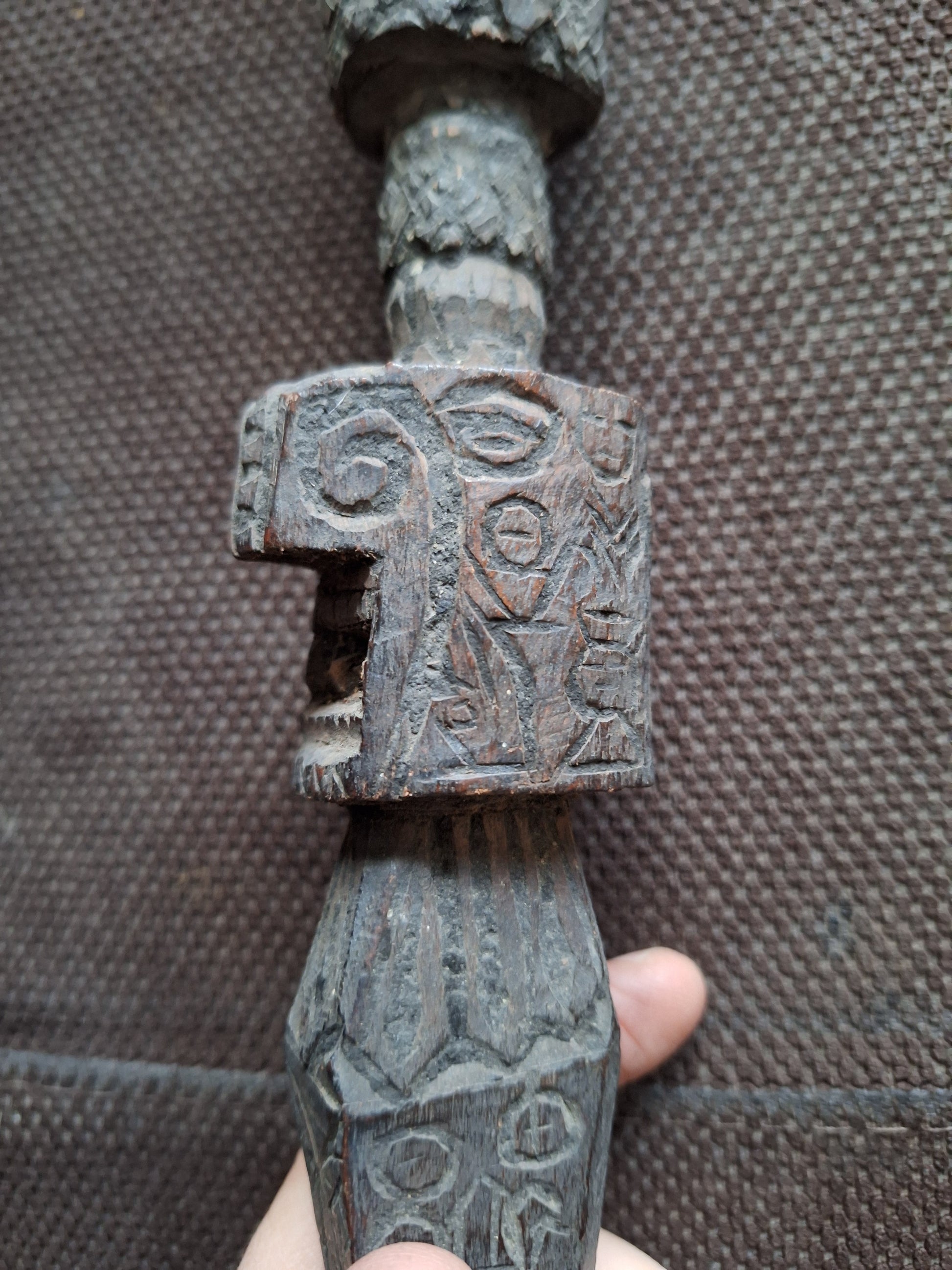 Very old wooden phurba from Nepal. Artisan handcarved masterpiece in an authentic, rustique style and with some imperfections and damages due to its age and previous usage.