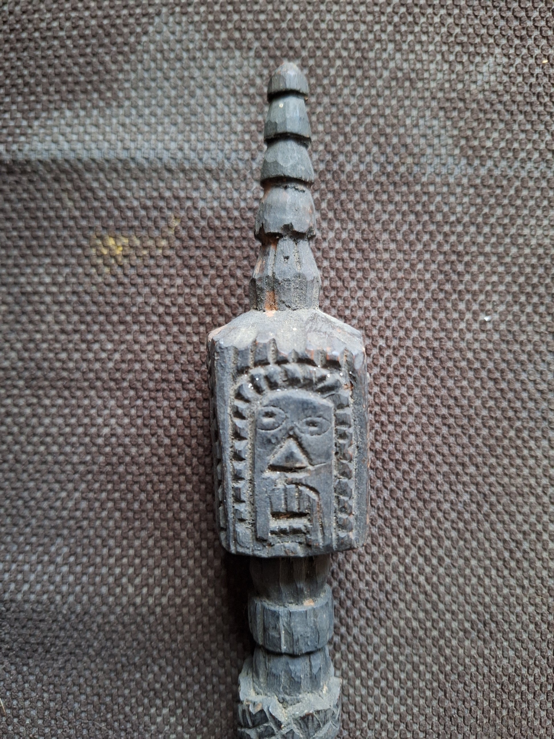 Very old wooden phurba from Nepal. Artisan handcarved masterpiece in an authentic, rustique style and with some imperfections and damages due to its age and previous usage.