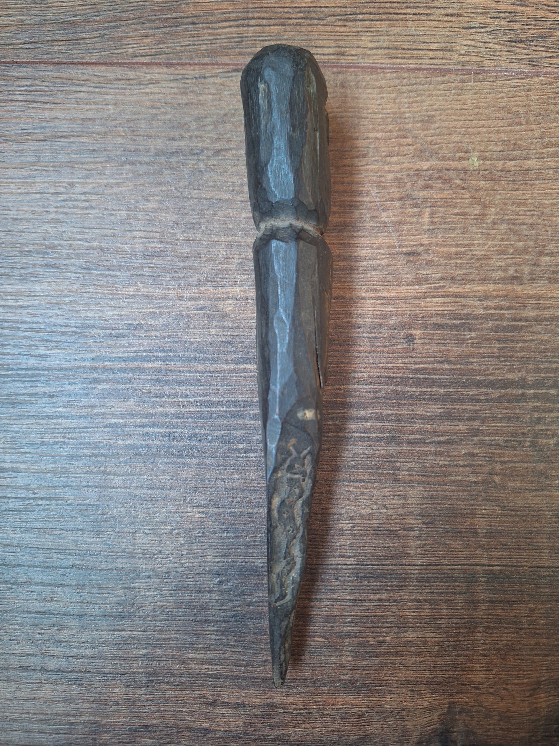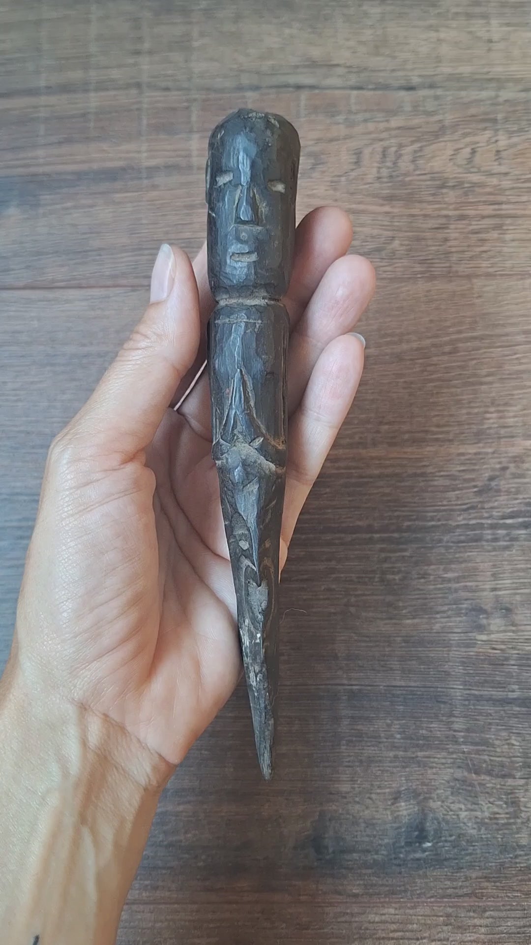 Very old wooden phurba from Nepal. Artisan handcarved in an ancient style. Please look closely at the pictures to observe the condition of this item; due to its age, this phurba shows some small imperfections and damages, but overall, considering its very respectable age, it is still in very good condition.