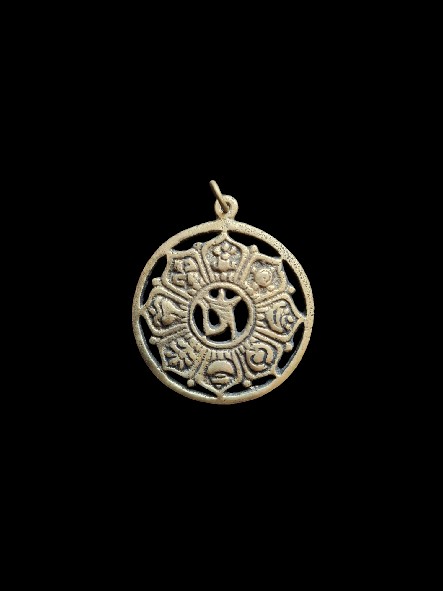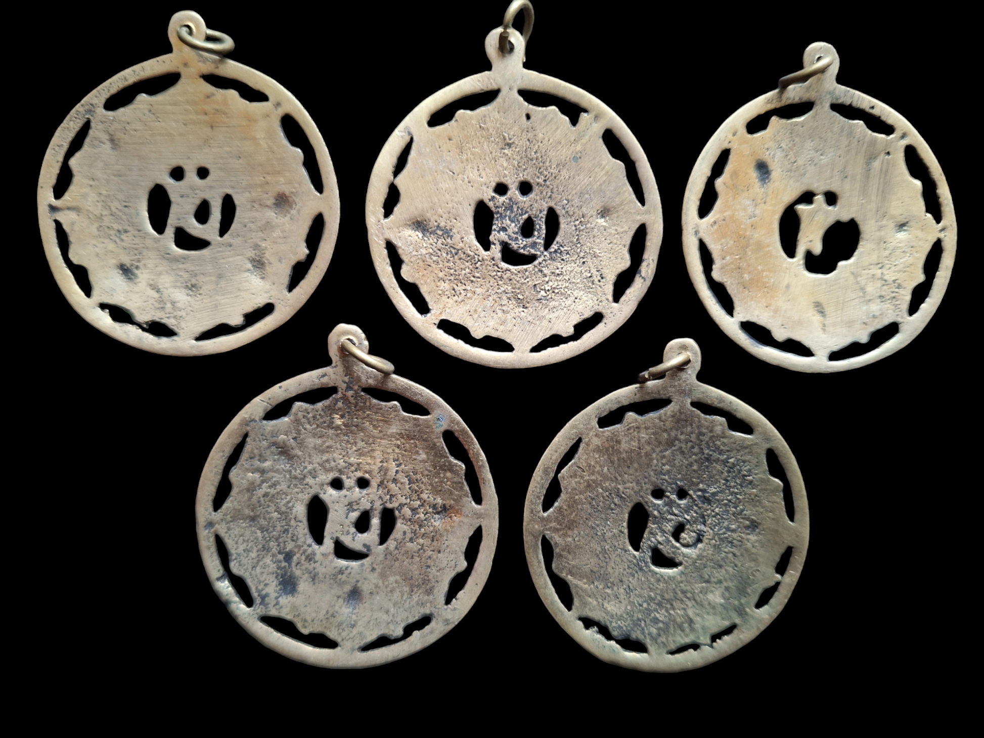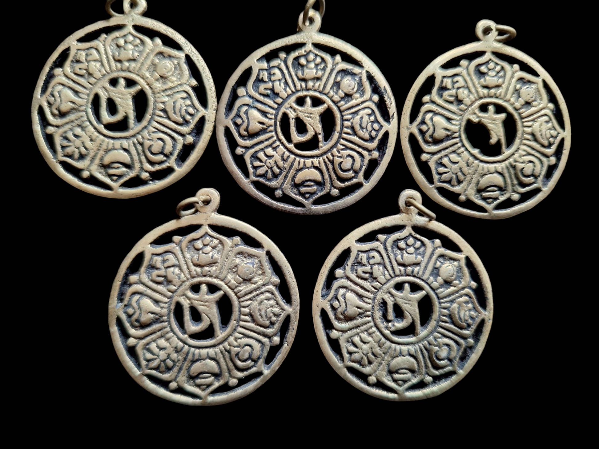 These pendants are made of brass and have a diameter of approximately 34 millimeters (measured without the eyelet). They weigh approximately 9 grams. They are made in Nepal.