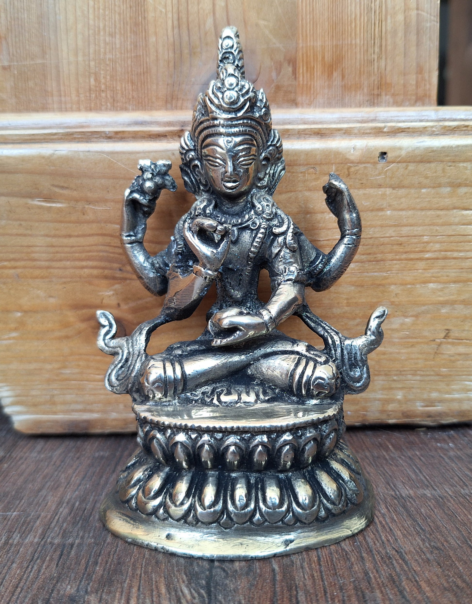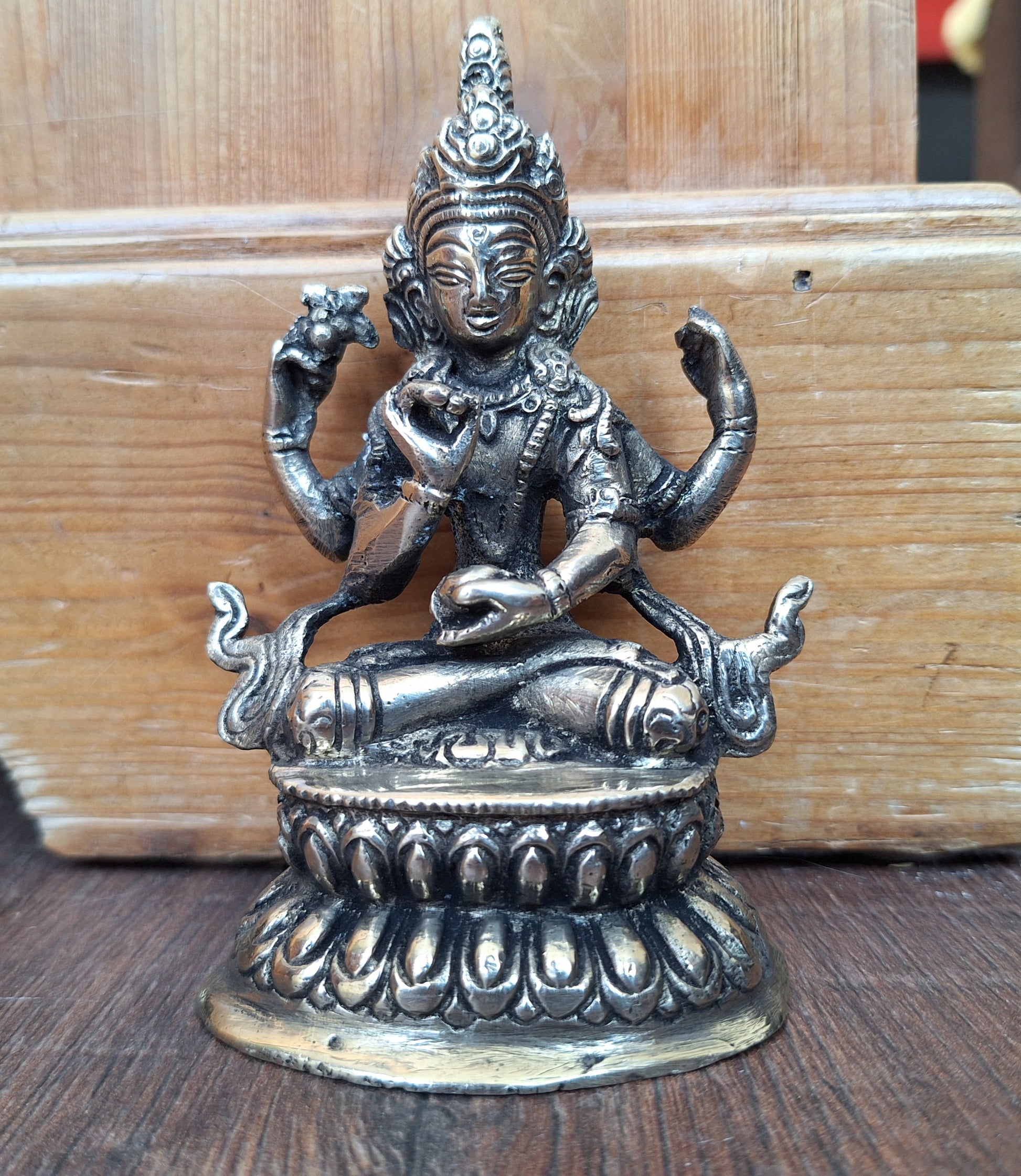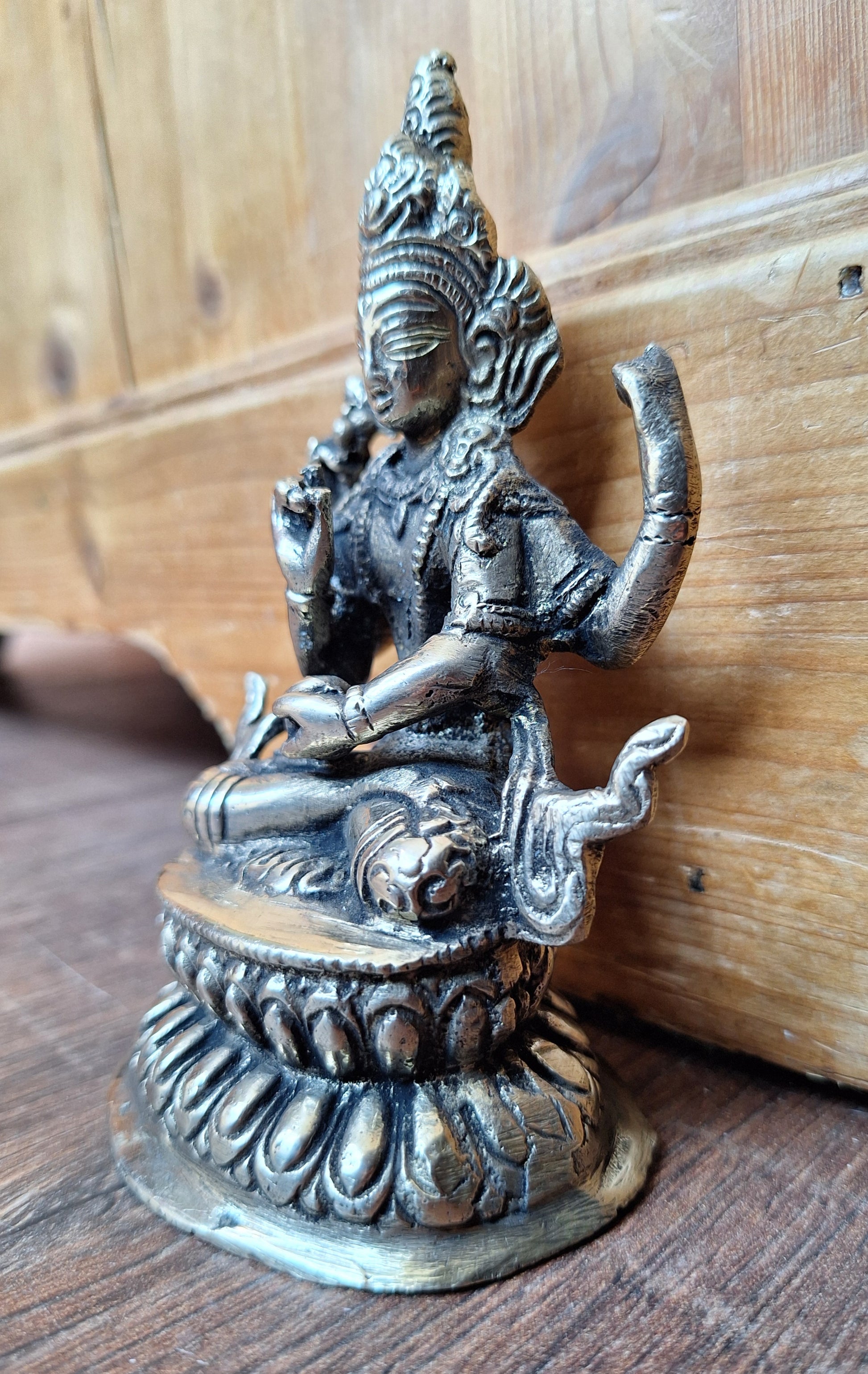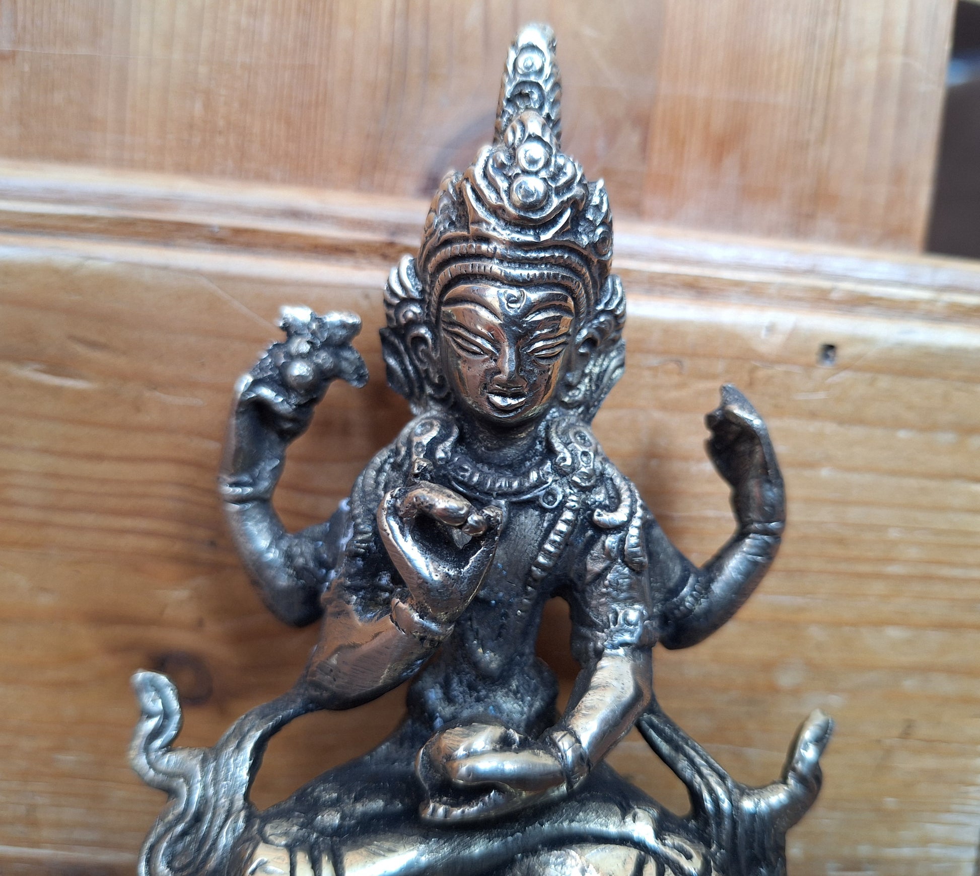 This brass statue has been made in India. As can be seen on the pictures, the decoration has been done in a quite simple, factory-made way and is therefore not of the highest possible quality, but overall it is still a nice statue and will do great on your altar as a focal point for your meditational practices.