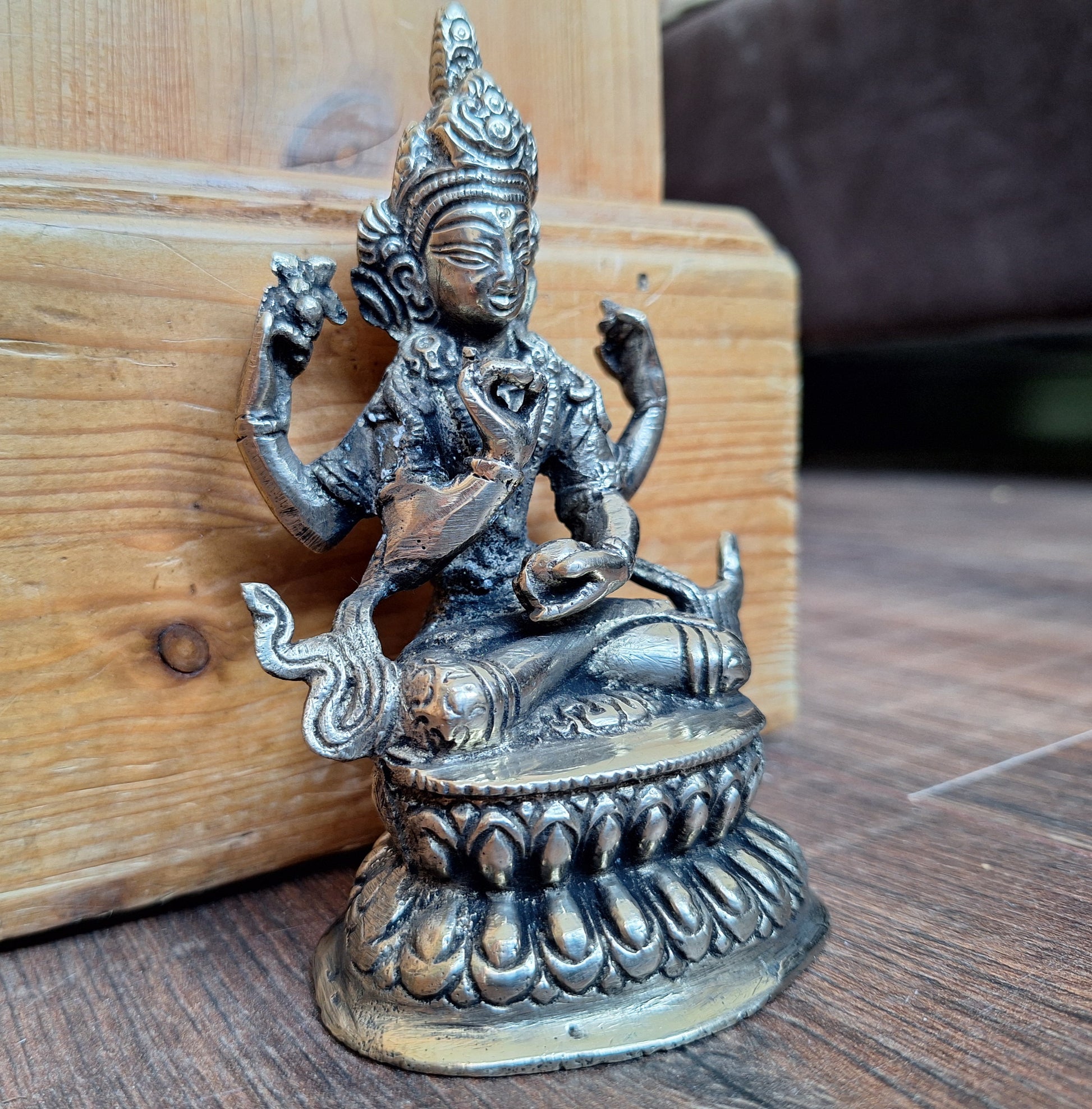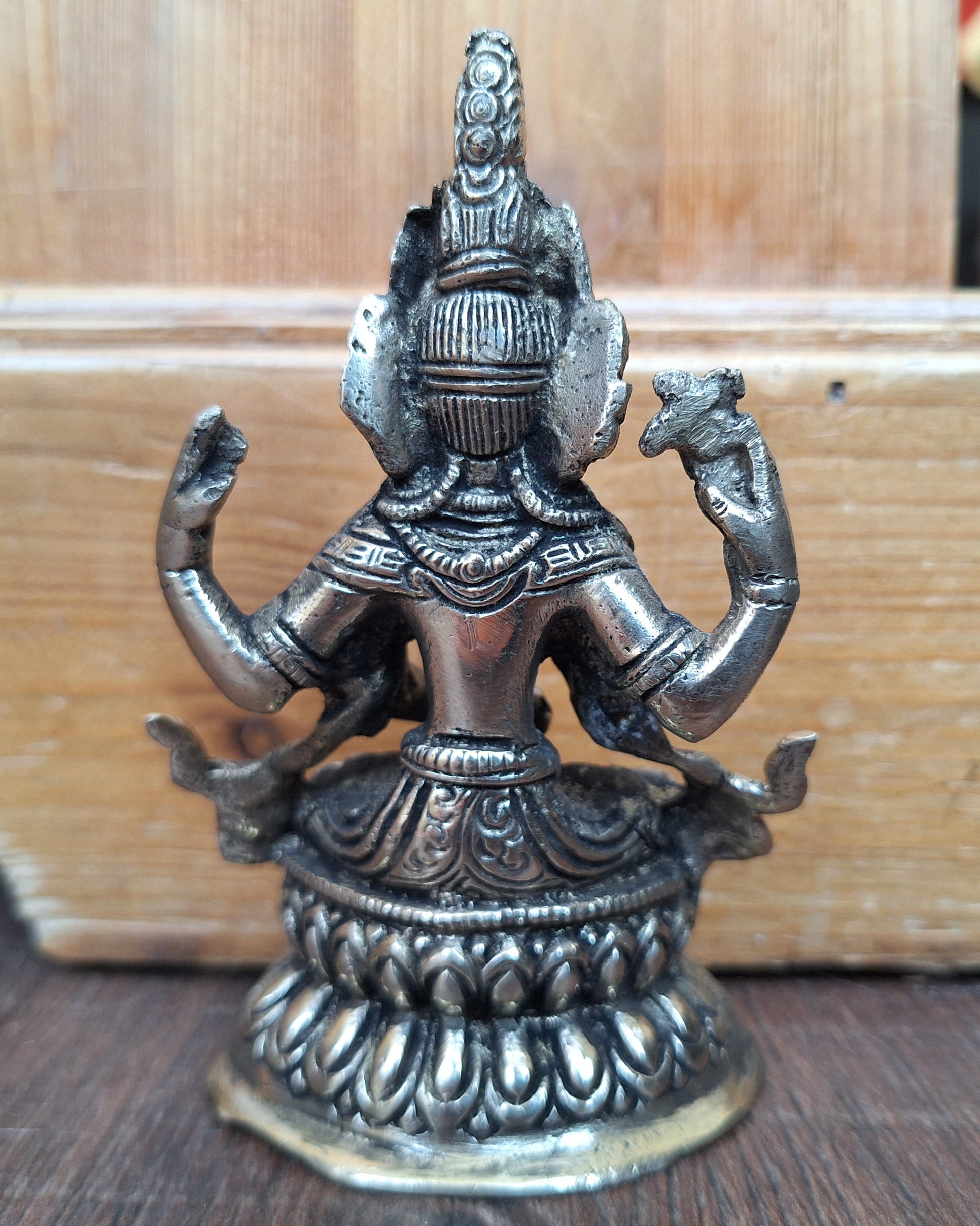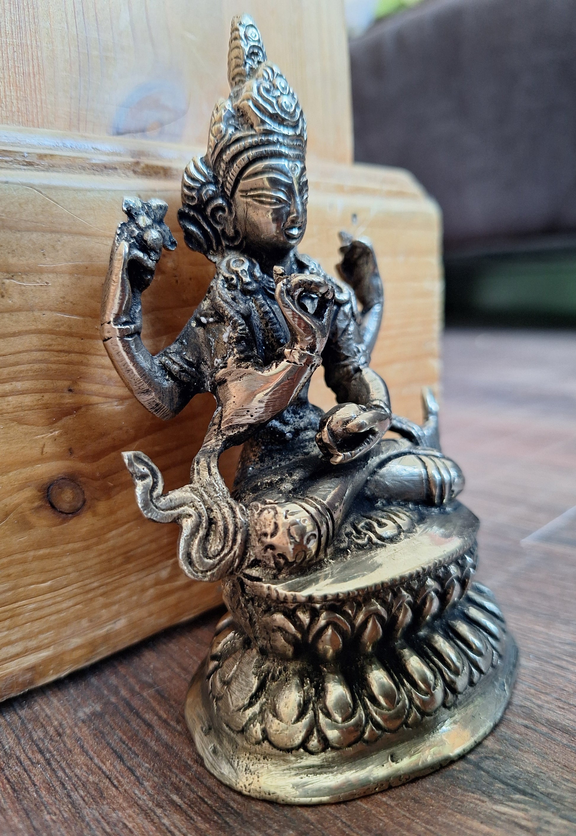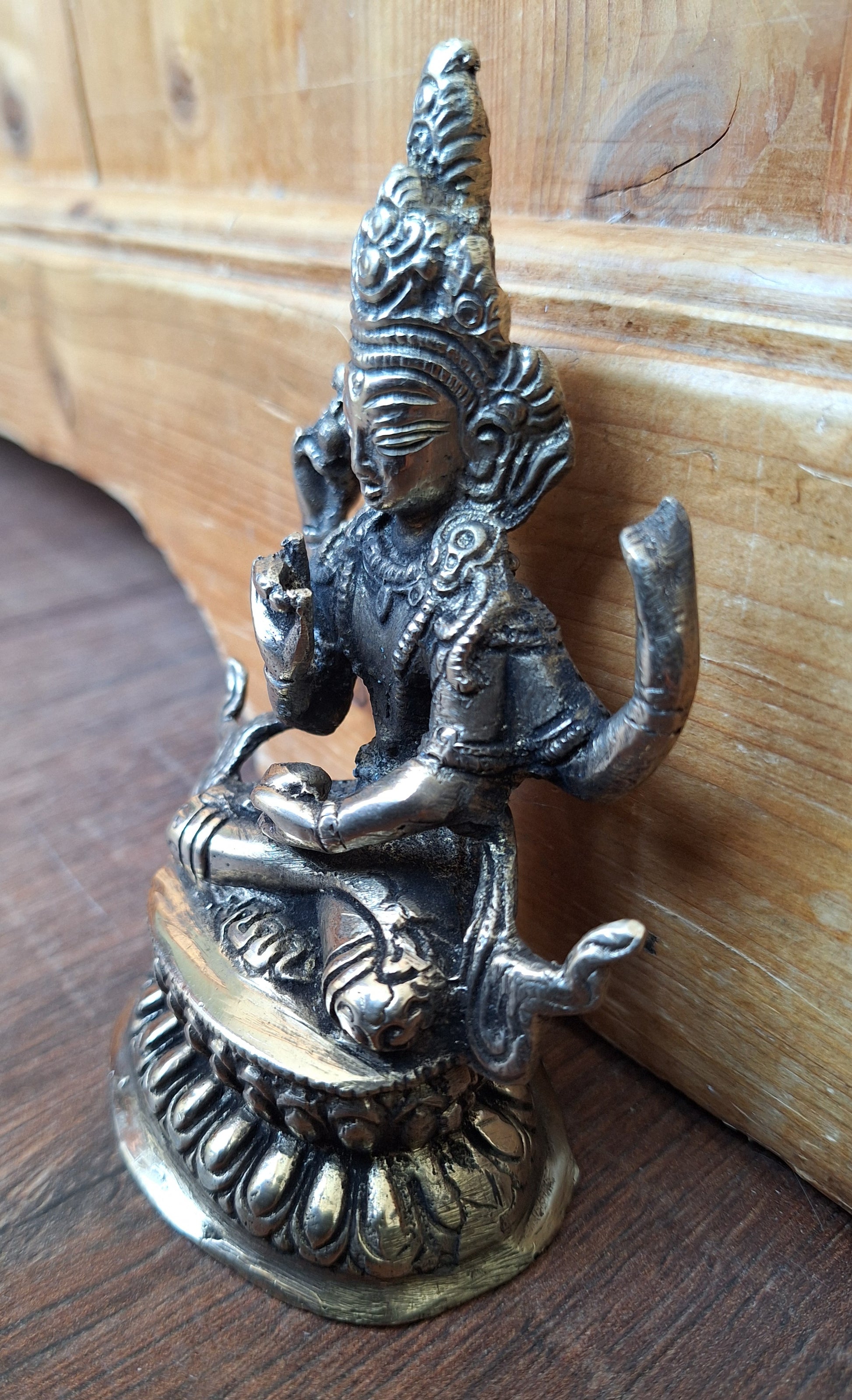 This brass statue has been made in India. As can be seen on the pictures, the decoration has been done in a quite simple, factory-made way and is therefore not of the highest possible quality, but overall it is still a nice statue and will do great on your altar as a focal point for your meditational practices.