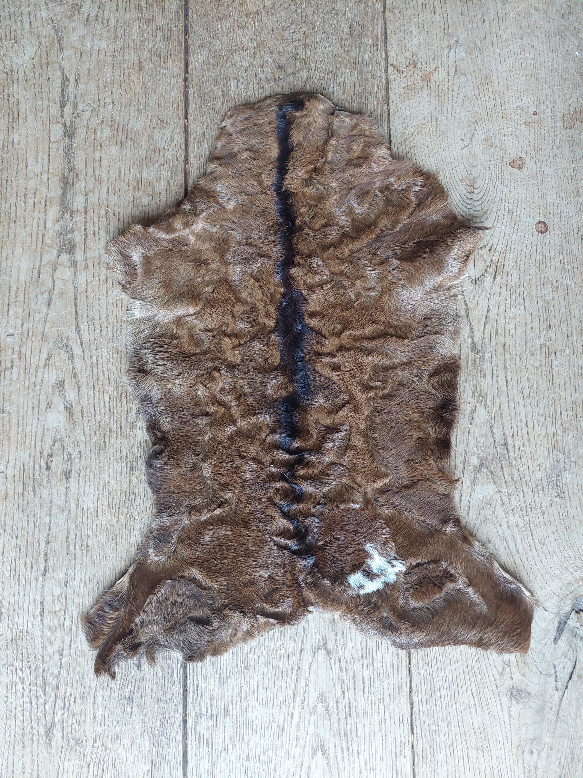 Nice hide from a very young goat, velvety brown with a dark stripe on the spine. Recent, supple and soft preparation in good condition.