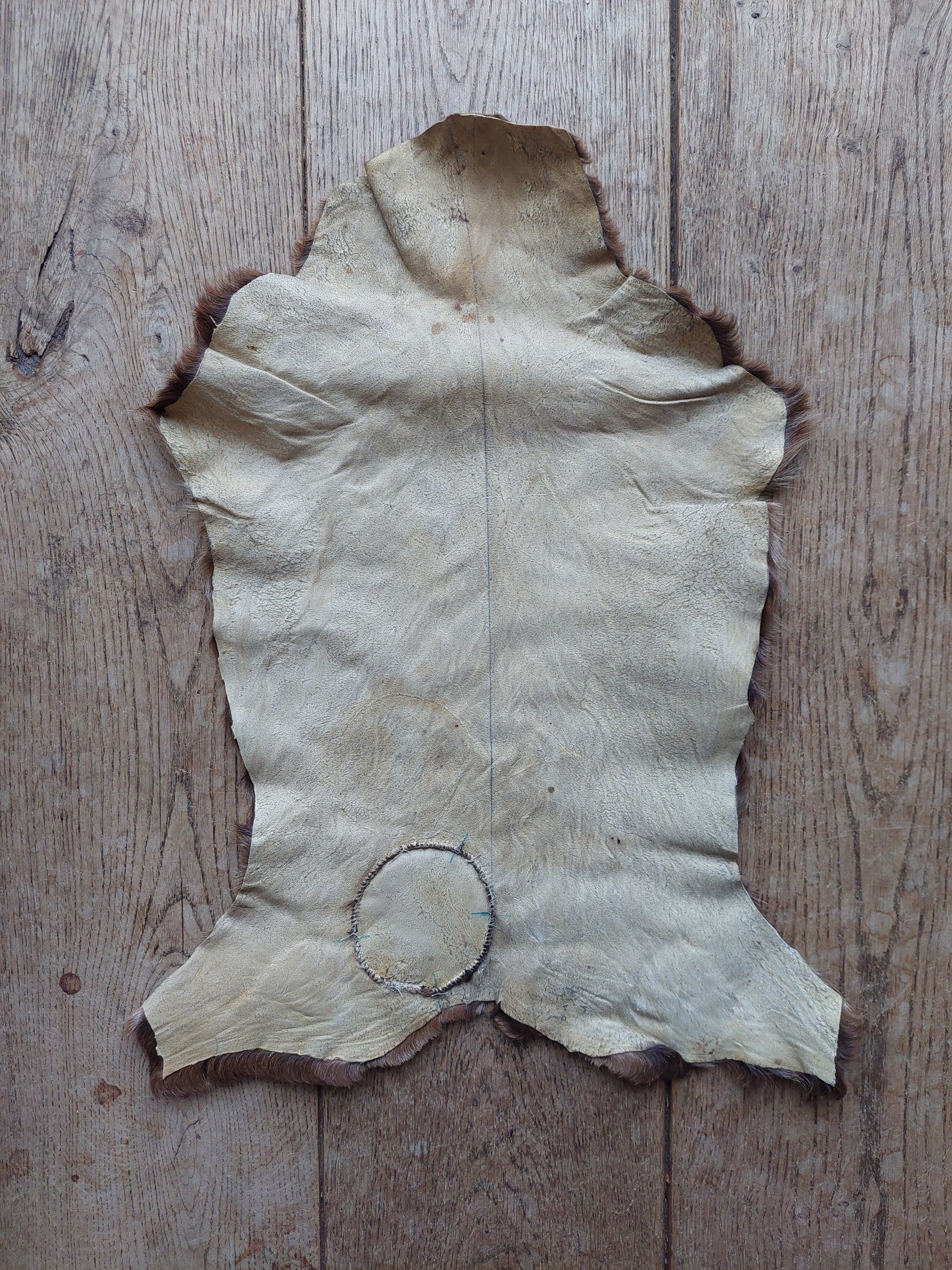 As can be seen on the pictures, this hide had a damage on the hip of the right hind leg. This was an infected wound, that led to the unfortunate death of this young animal. The damage has been restored here with a piece of goat hide (from another animal) in a slightly different color, with a white spot. This was done intentionally to commemorate the life and death of this young goat.