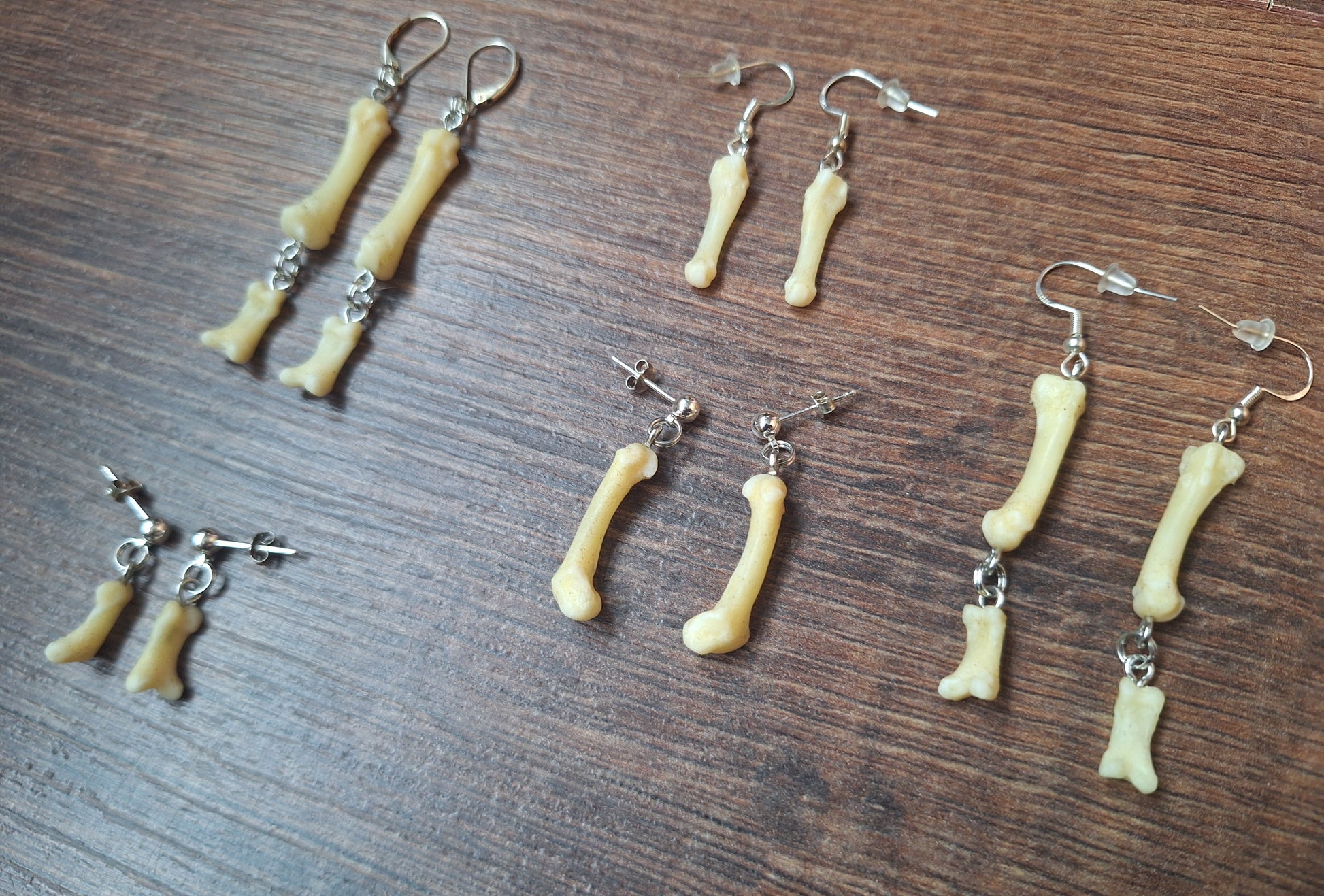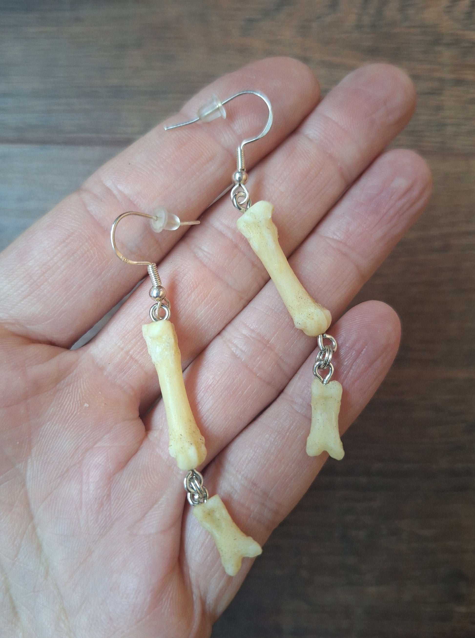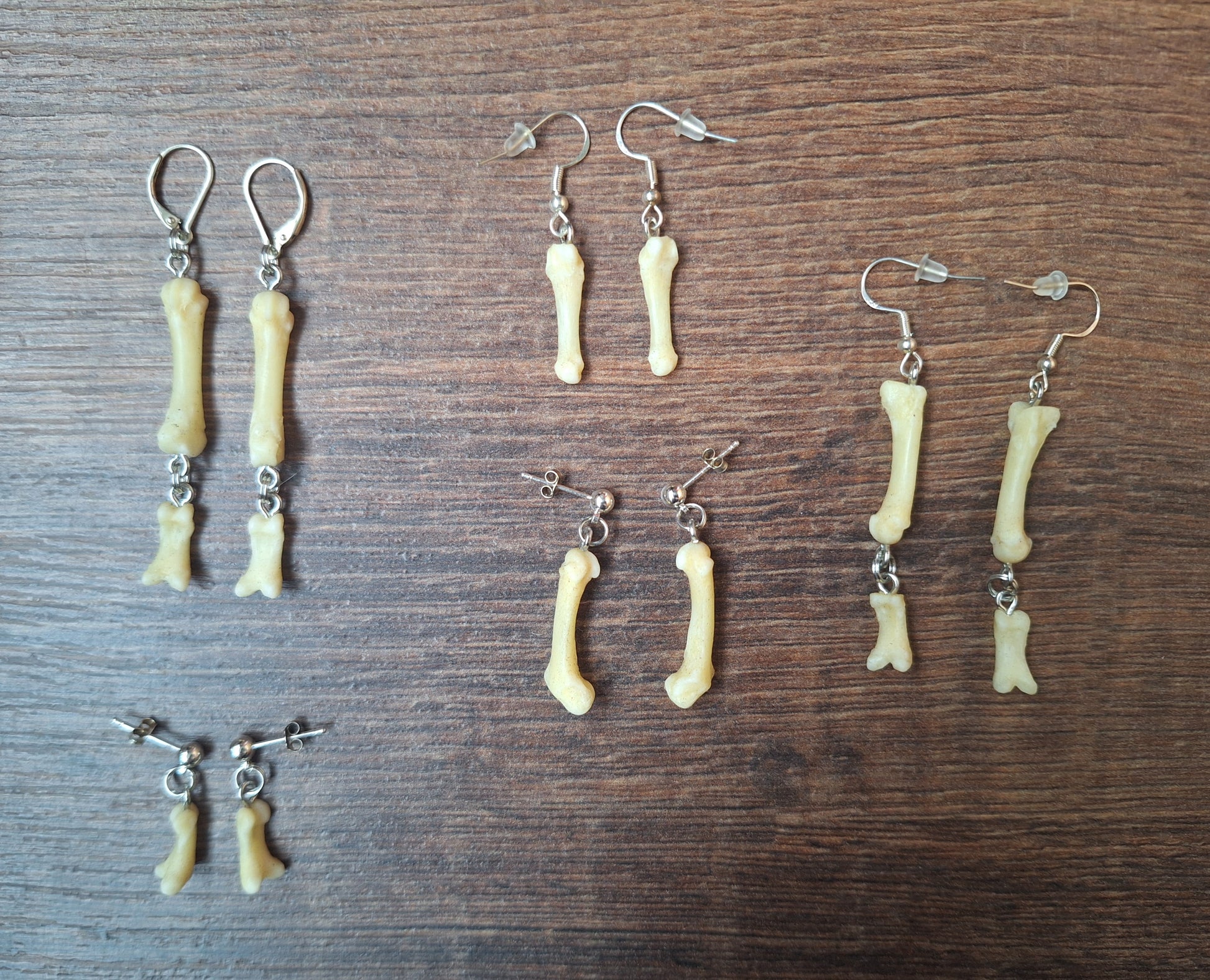 Set #5: two bones dangling on an earring hook. Sizes of the bones; 26 and 13 millimeters.