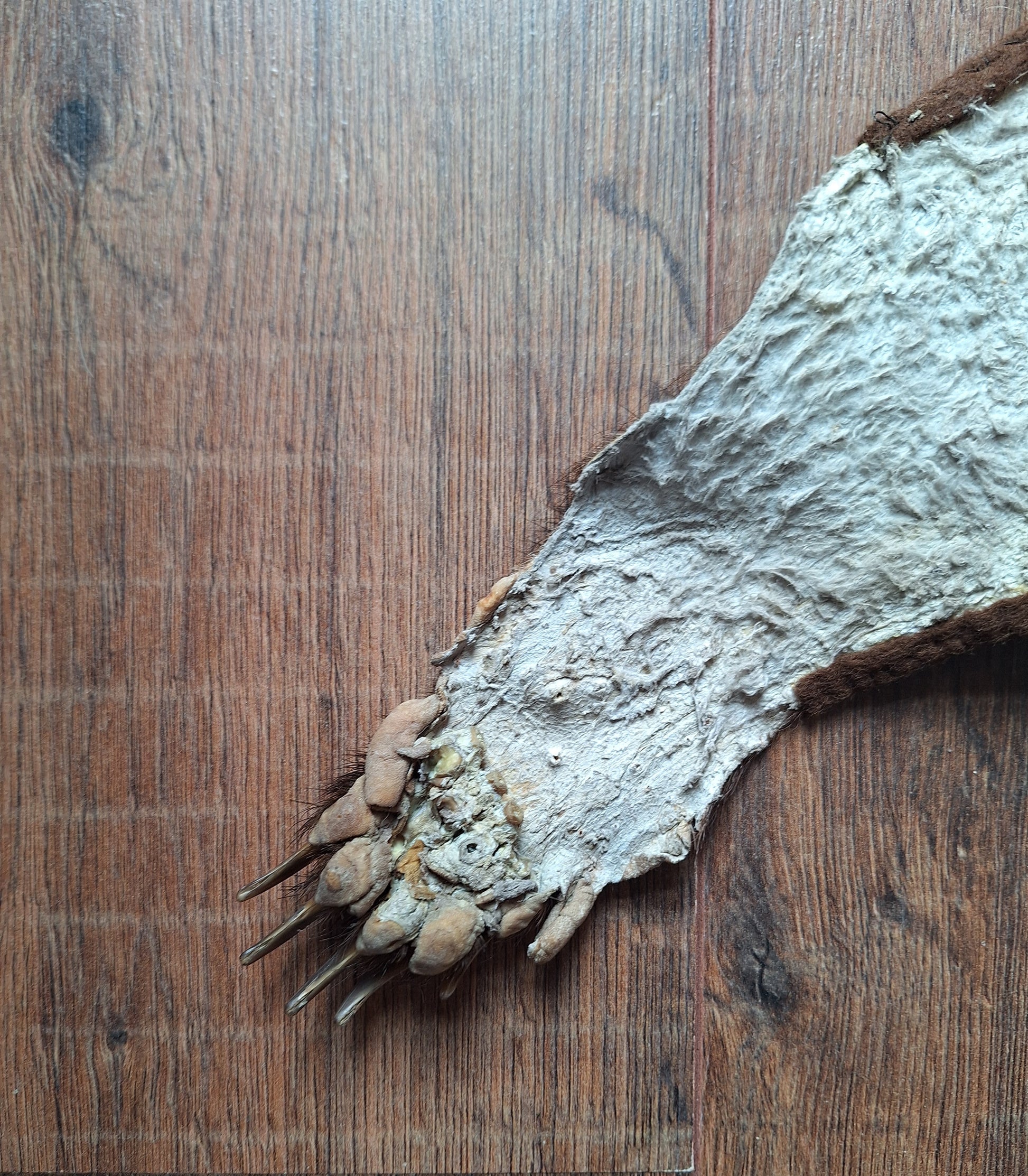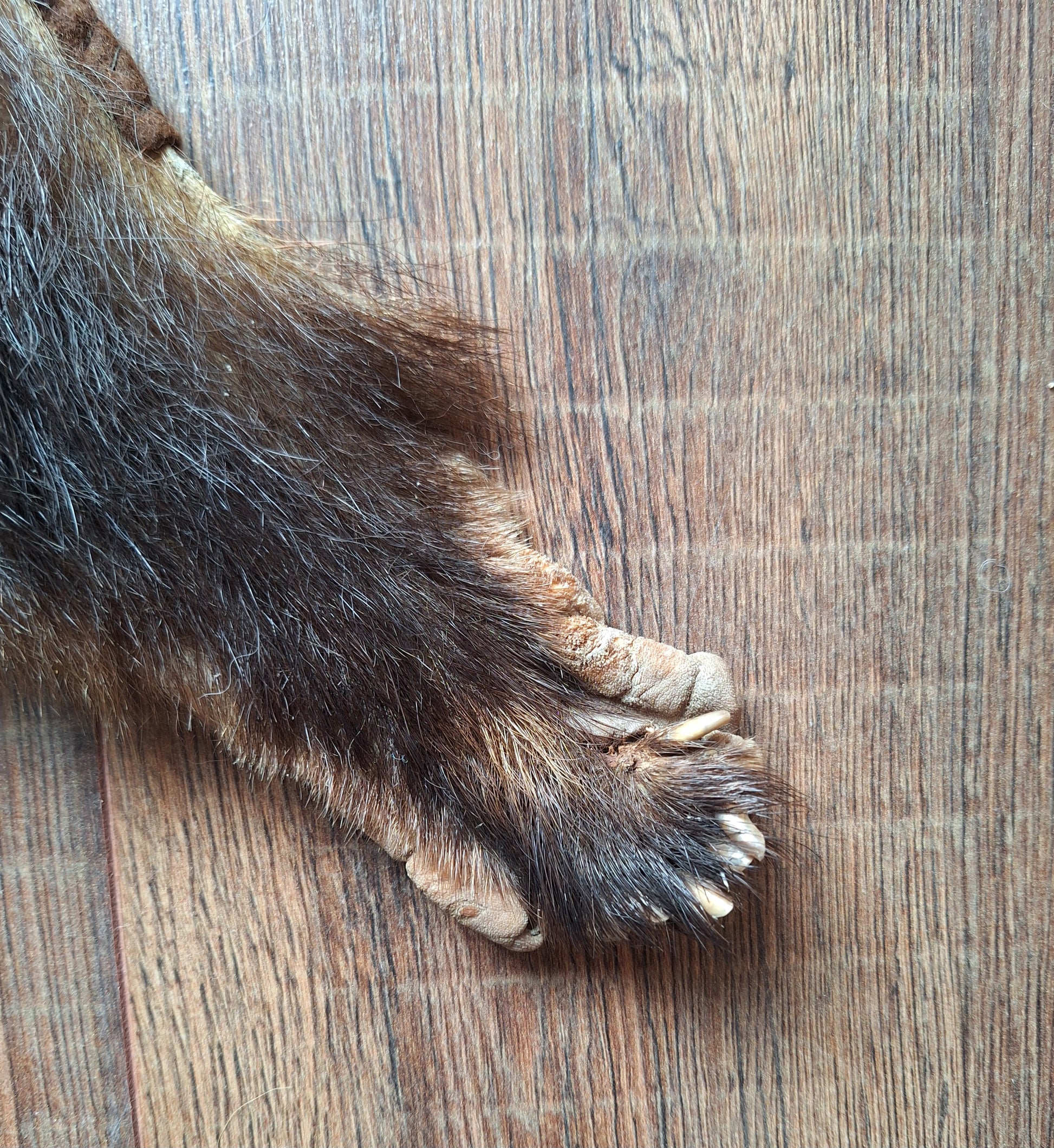 Please note; a badger hide preparation is by its nature always quite sturdy and fragile (not as supple as for example a fox's hide). Therefore especially around the edges it's always prone to tearing. In this preparation, the edges have been strengthened with a fabric lining (the dark brown edge, that can be seen on the pictures) and the nose-area has also been reinforced on the backside.