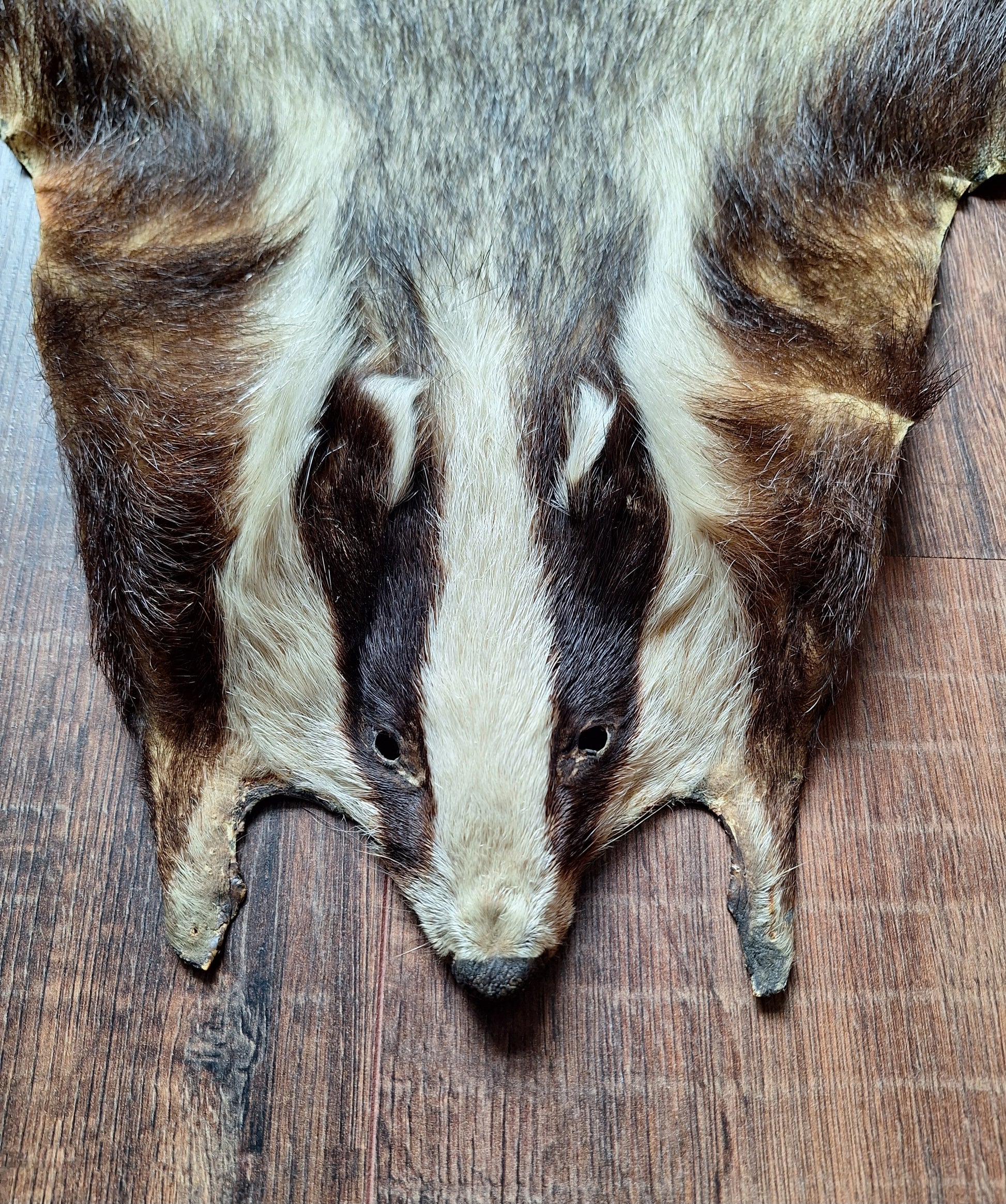 Very nice hide of a dutch badger, recent preparation in very good condition. This hide has a very beautiful face and is complete with its tail and all paws and nails. A beautiful item to honor your connection with the spirit of Badger.