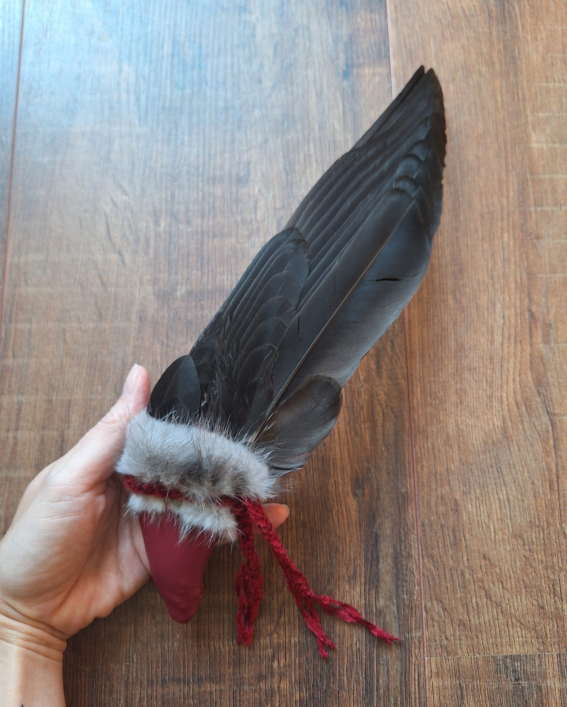 The wing has been handsewn into a sleeve of burgundy red faux leather and decorated with a braid made with 6 strands of velvety red acrylic wool and some light grey rabbit fur. During the braiding process, only the best of intentions have been put in.
