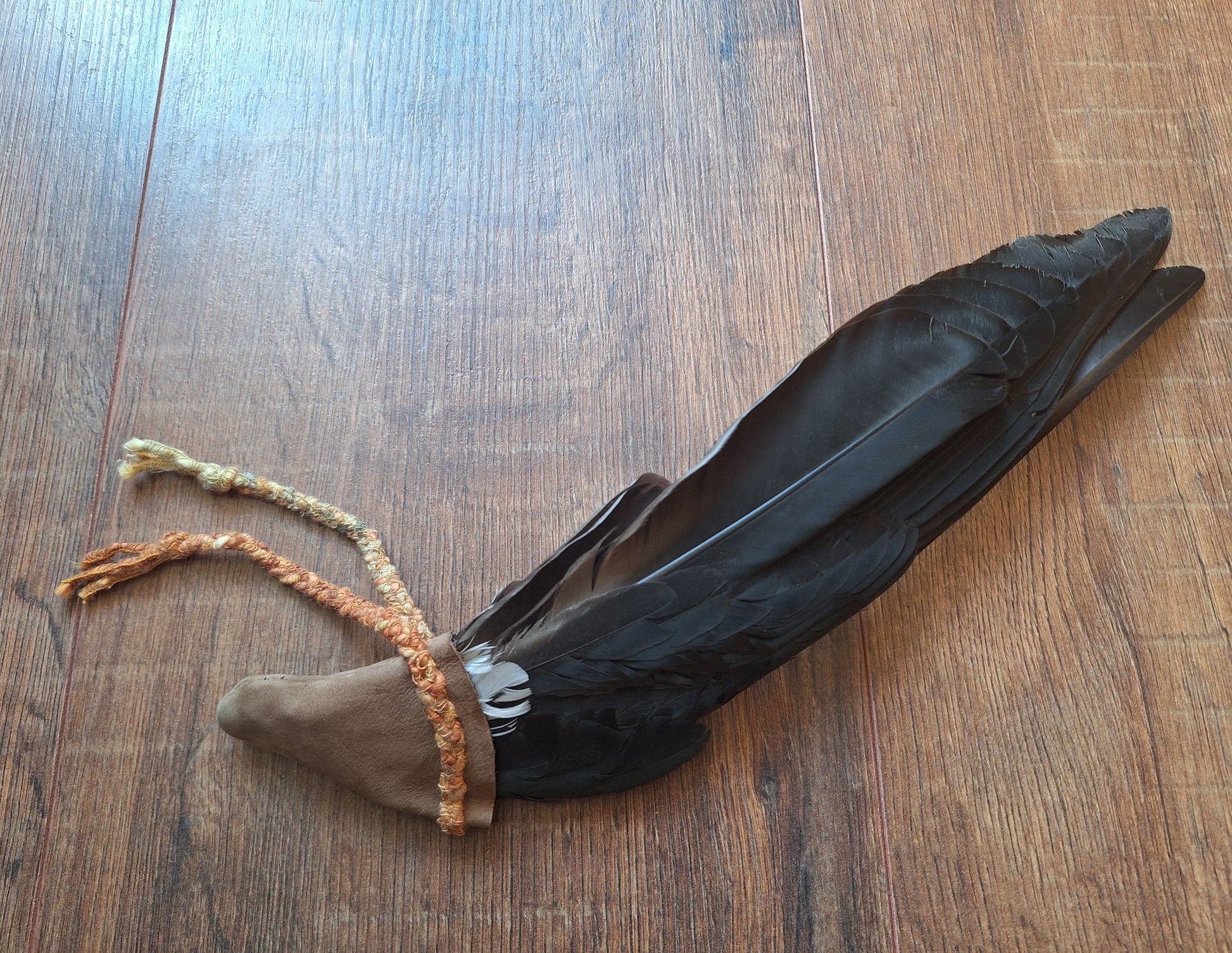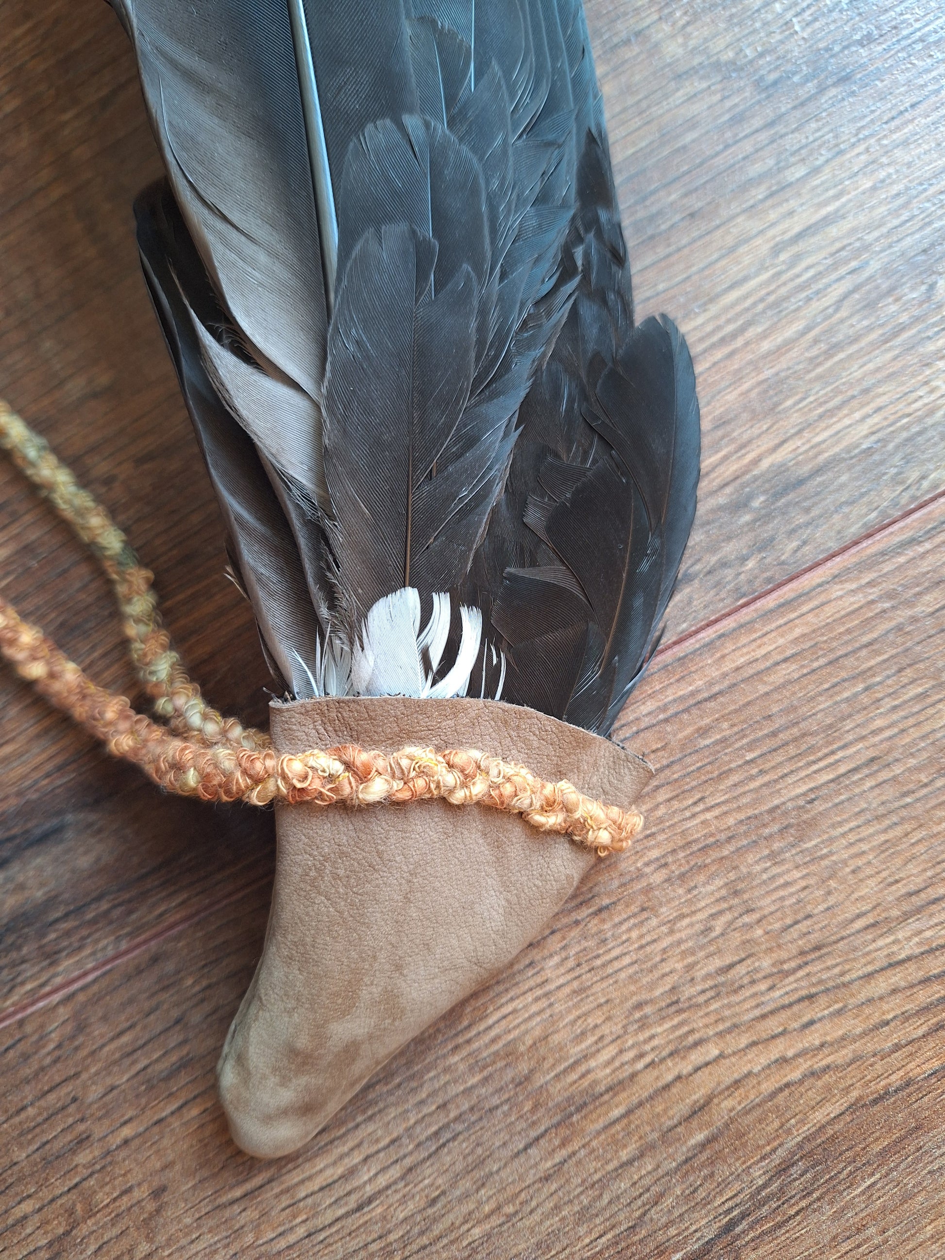 The wing has been handsewn into a sleeve of beige suede leather and decorated with a braid made with 3 strands of acrylic wool in natural brown and green colors. During the braiding process, only the best of intentions have been put in.