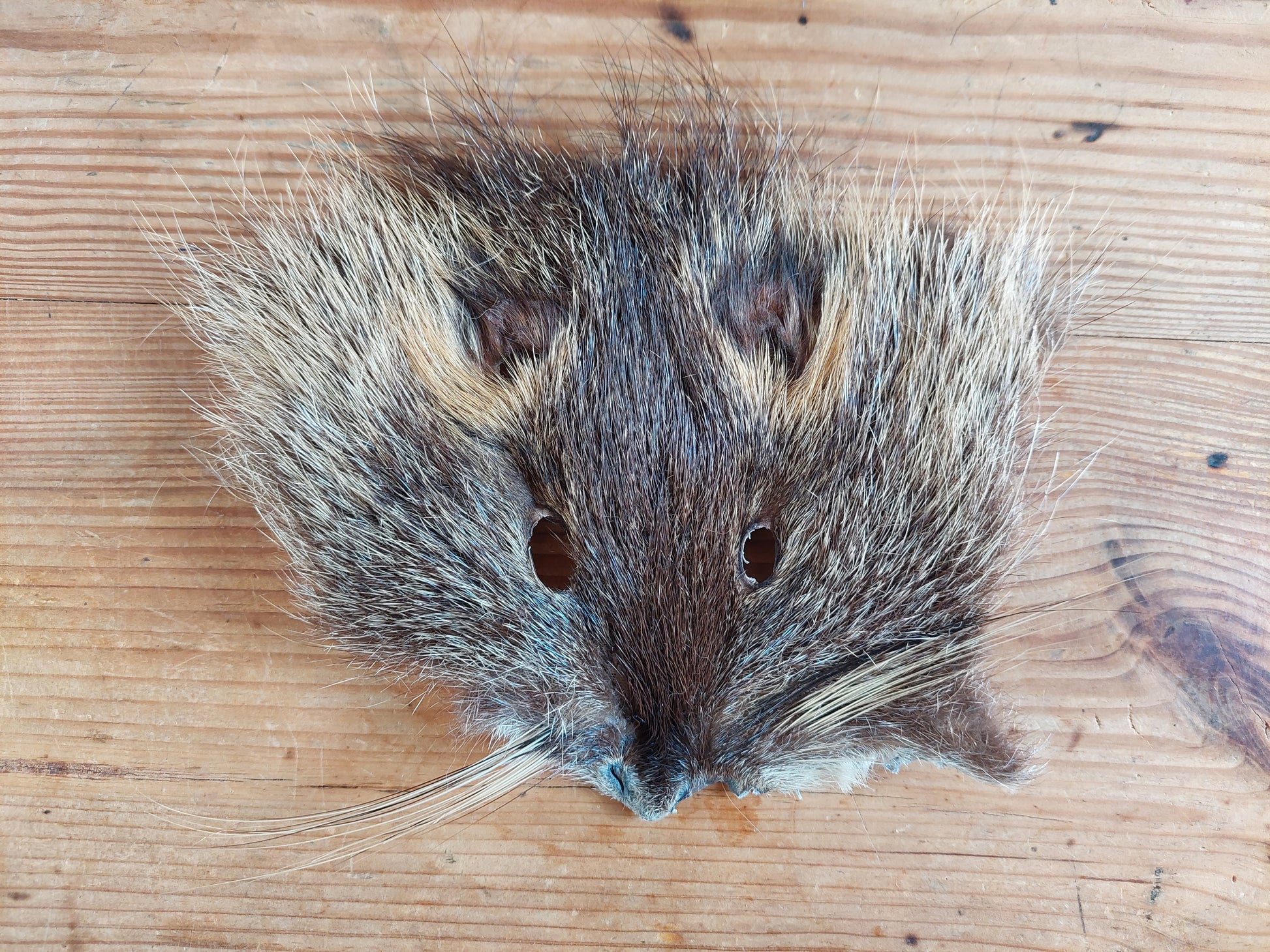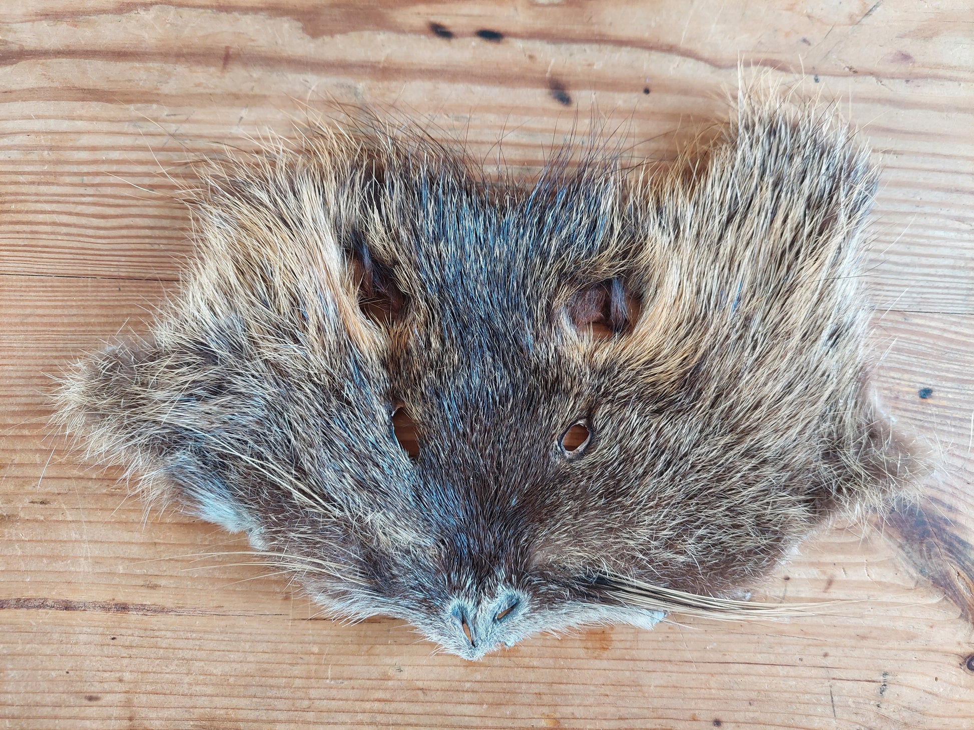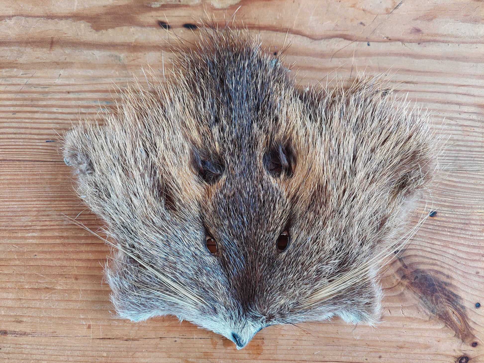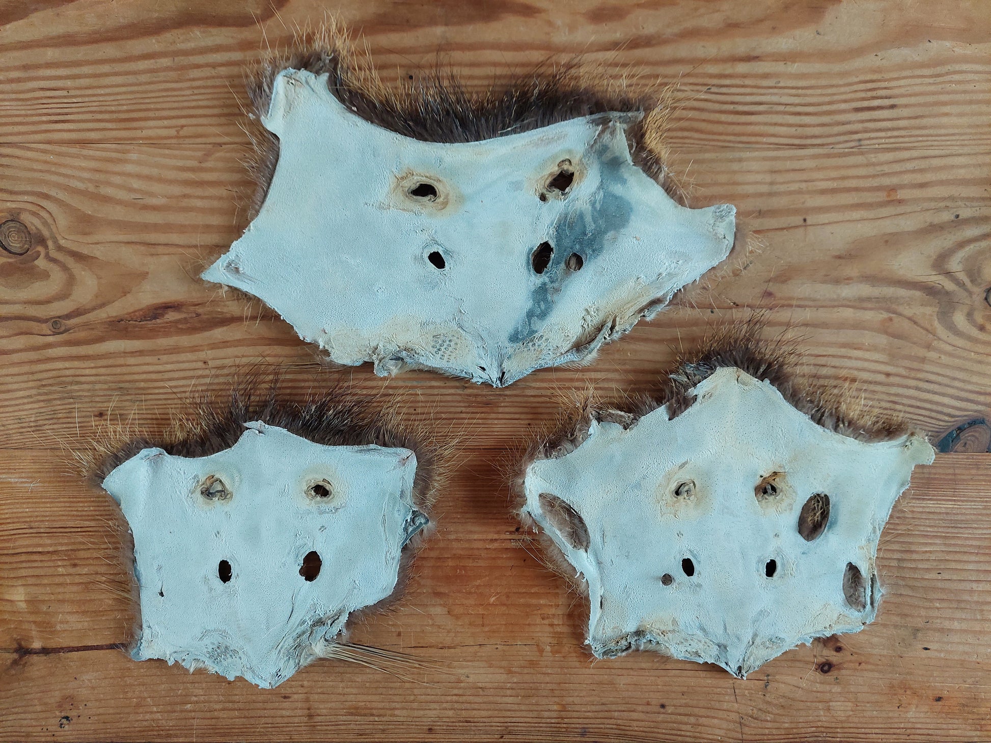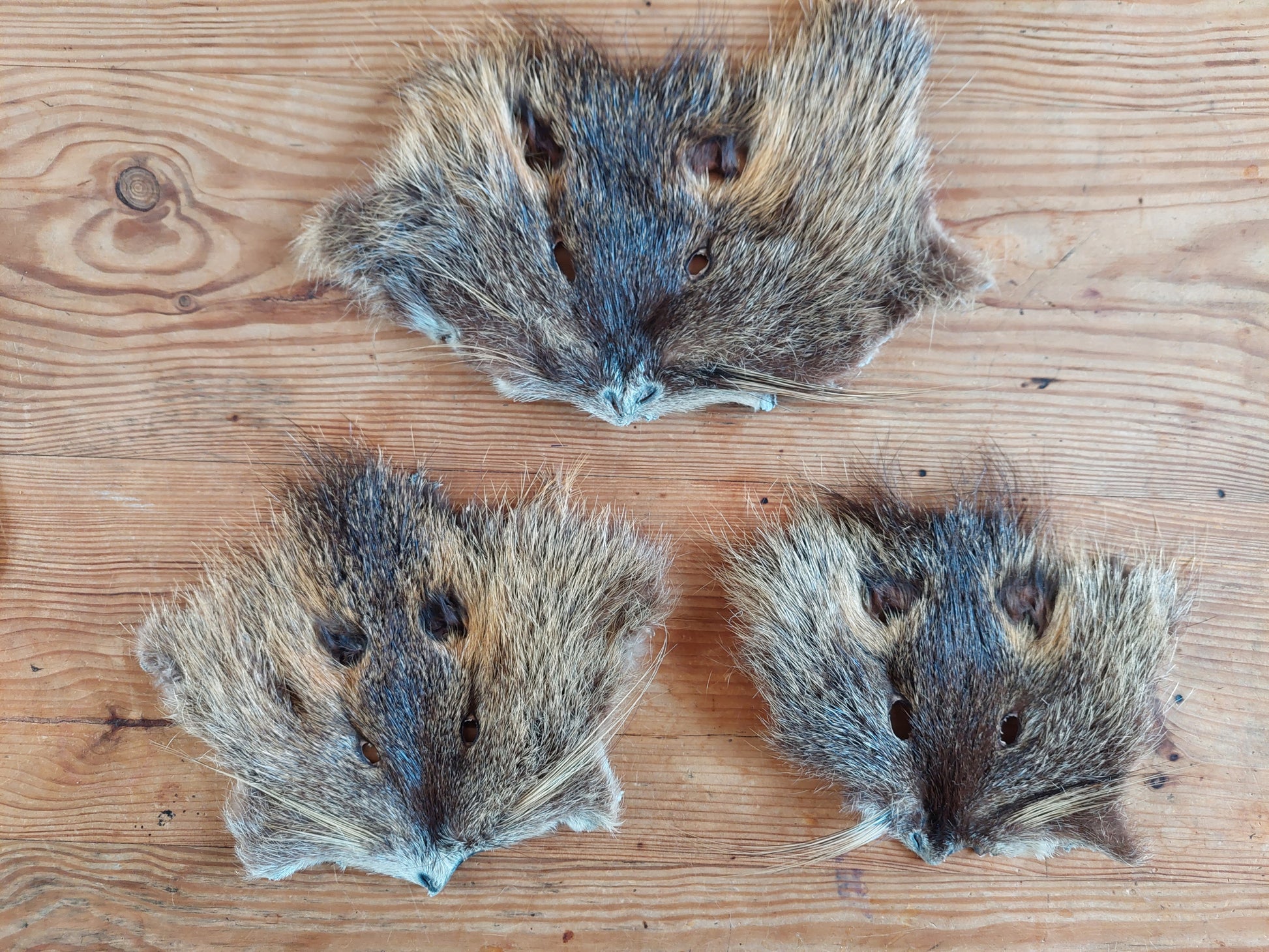 Prepared head skins from beaver rats. Somewhat flexible, so can be sewn (with heavy quality needle and thread of course) on for example your ritual clothing or drumbag.