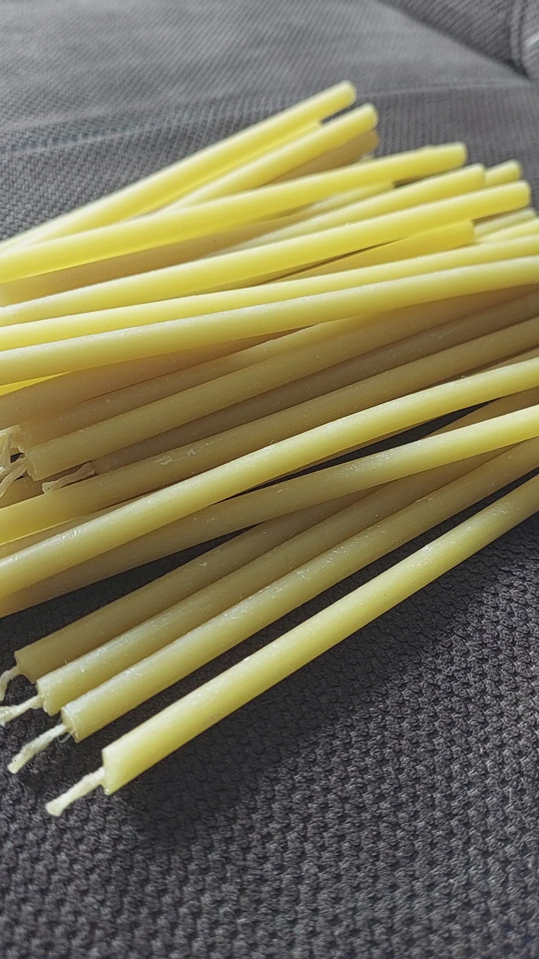 These beeswax candles are approximately 15 centimeters long and have a diameter of 5 millimeter. Each candle burns approximately 30 minutes; exactly a nice time-span for your daily ritual or spellwork. They can easily be modelled or twisted together for your personal magical purposes.