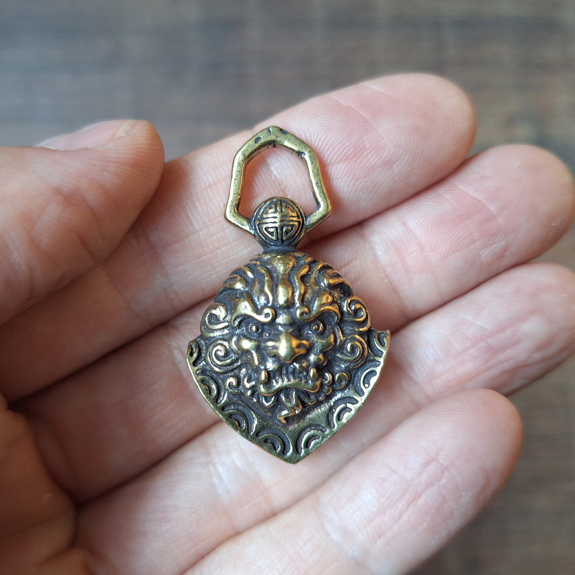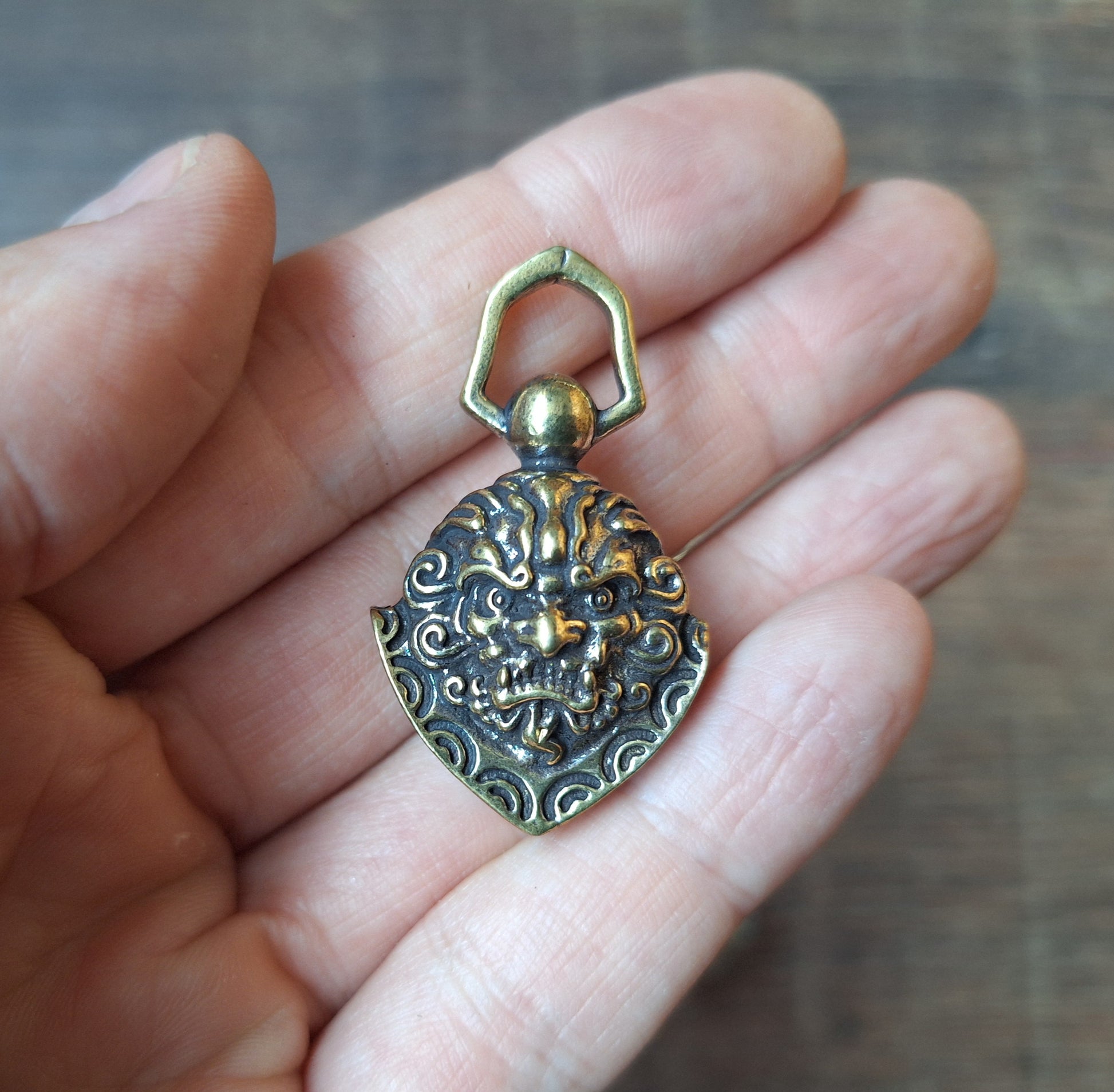 On both sides of this bell there's a detailed, high relief depiction of a very fierce, forceful being. A wrathful spirit. In Himalayan regions, images of freightening faces of wrathful spirits and deities can be found everywhere, from bigger sized architectural ornaments or wooden masks to smaller sized pendants or bells to use as personal amulets