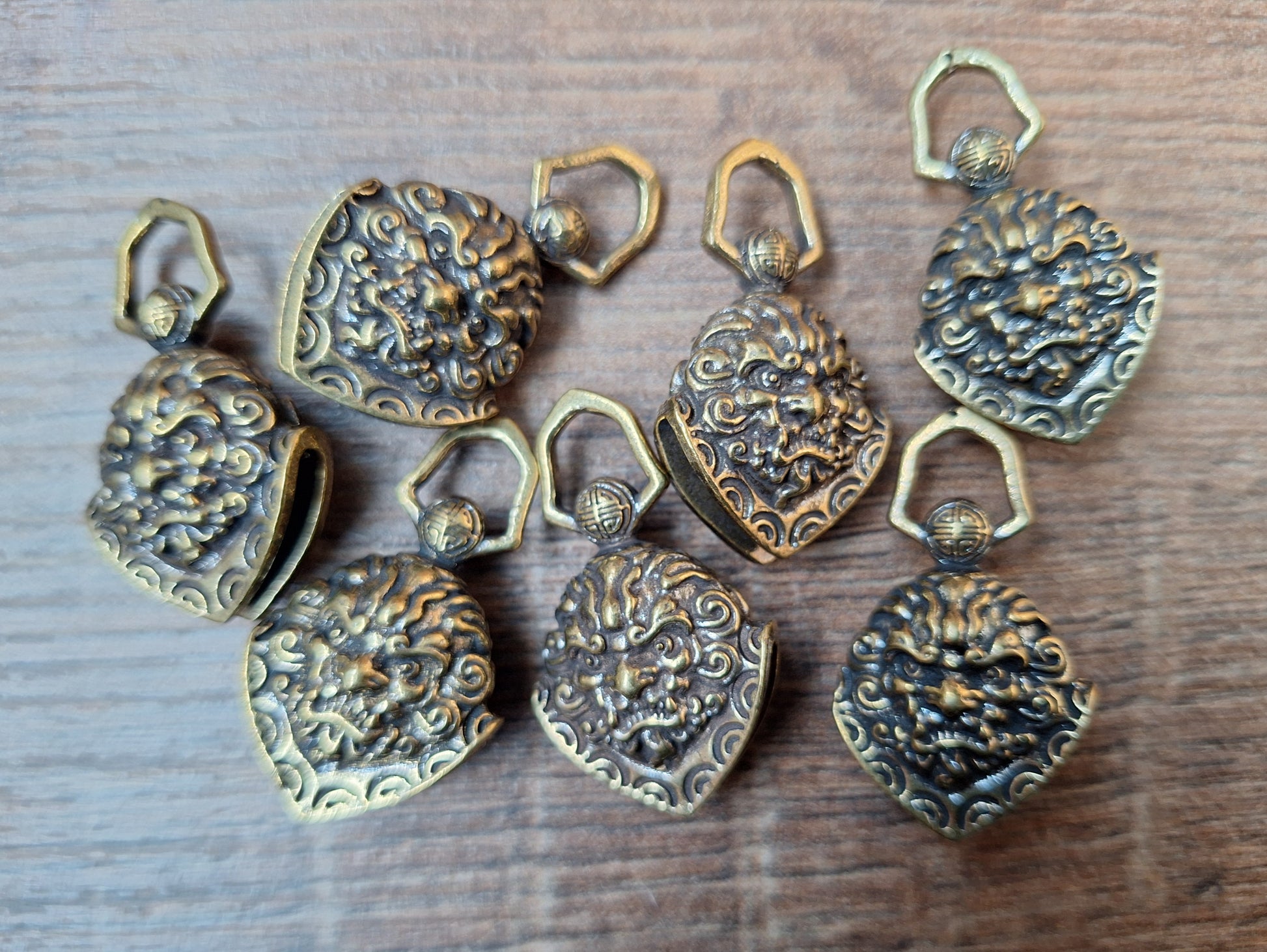 These brass bells are made in Tibet and measure approximately 25 millimeters wide, 26 millimeters high (measured without eyelet) and 15 millimeters deep.