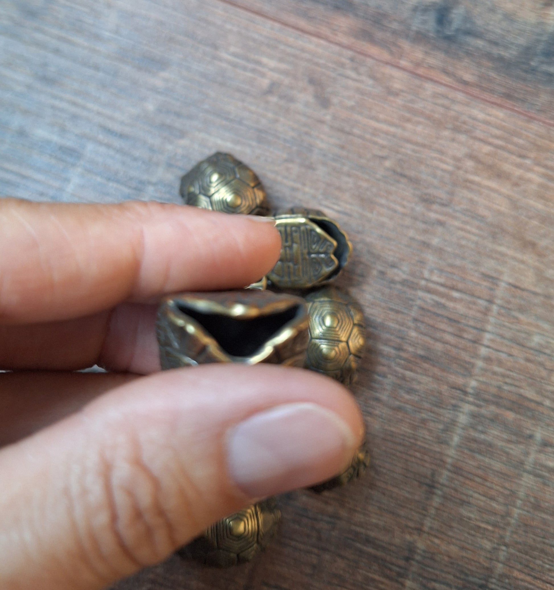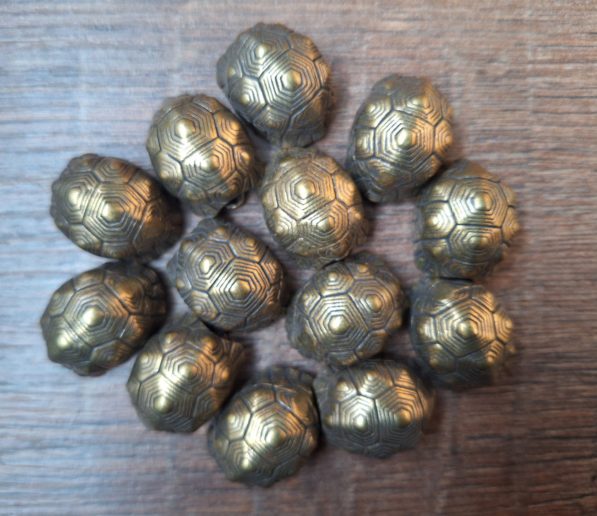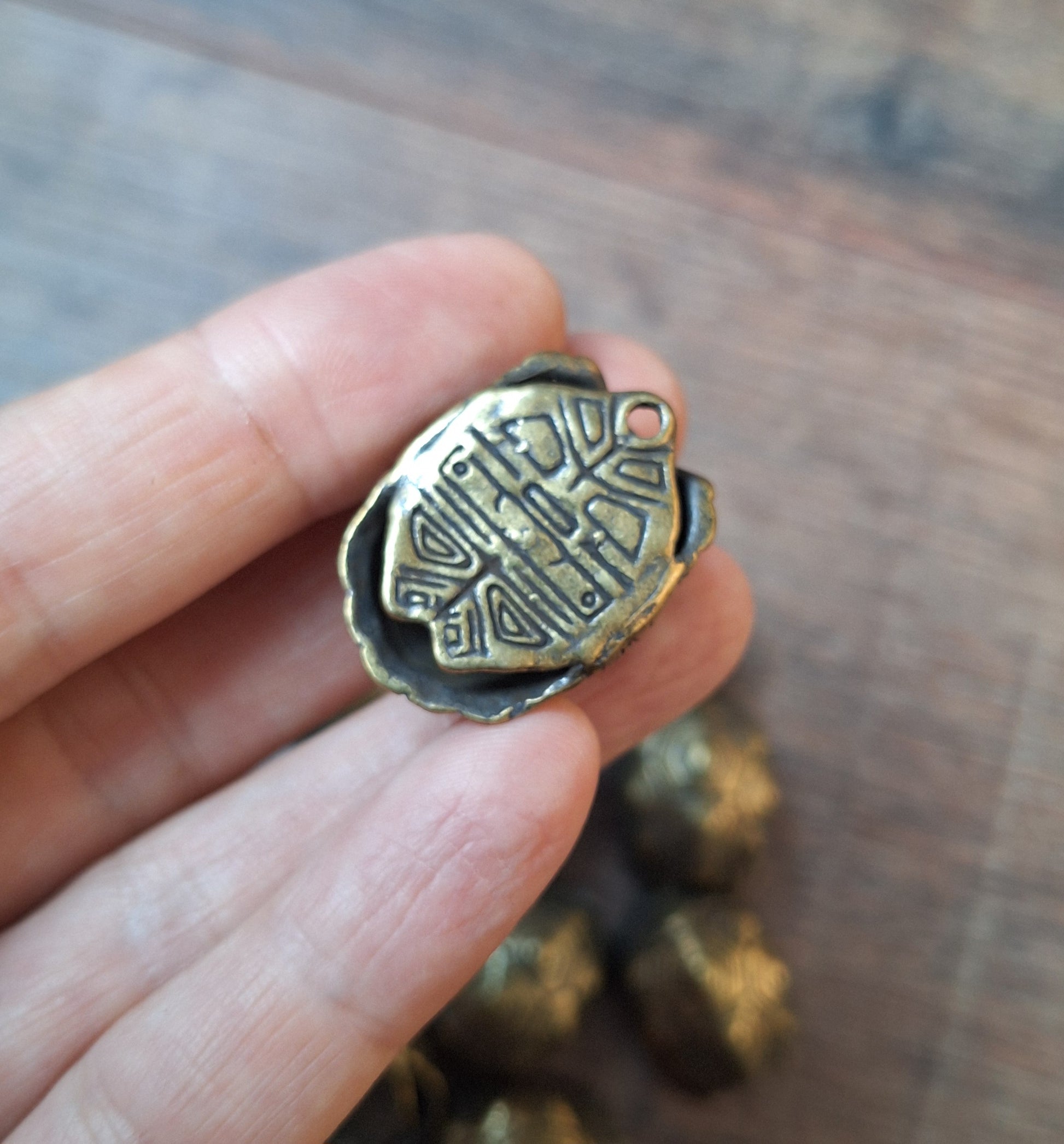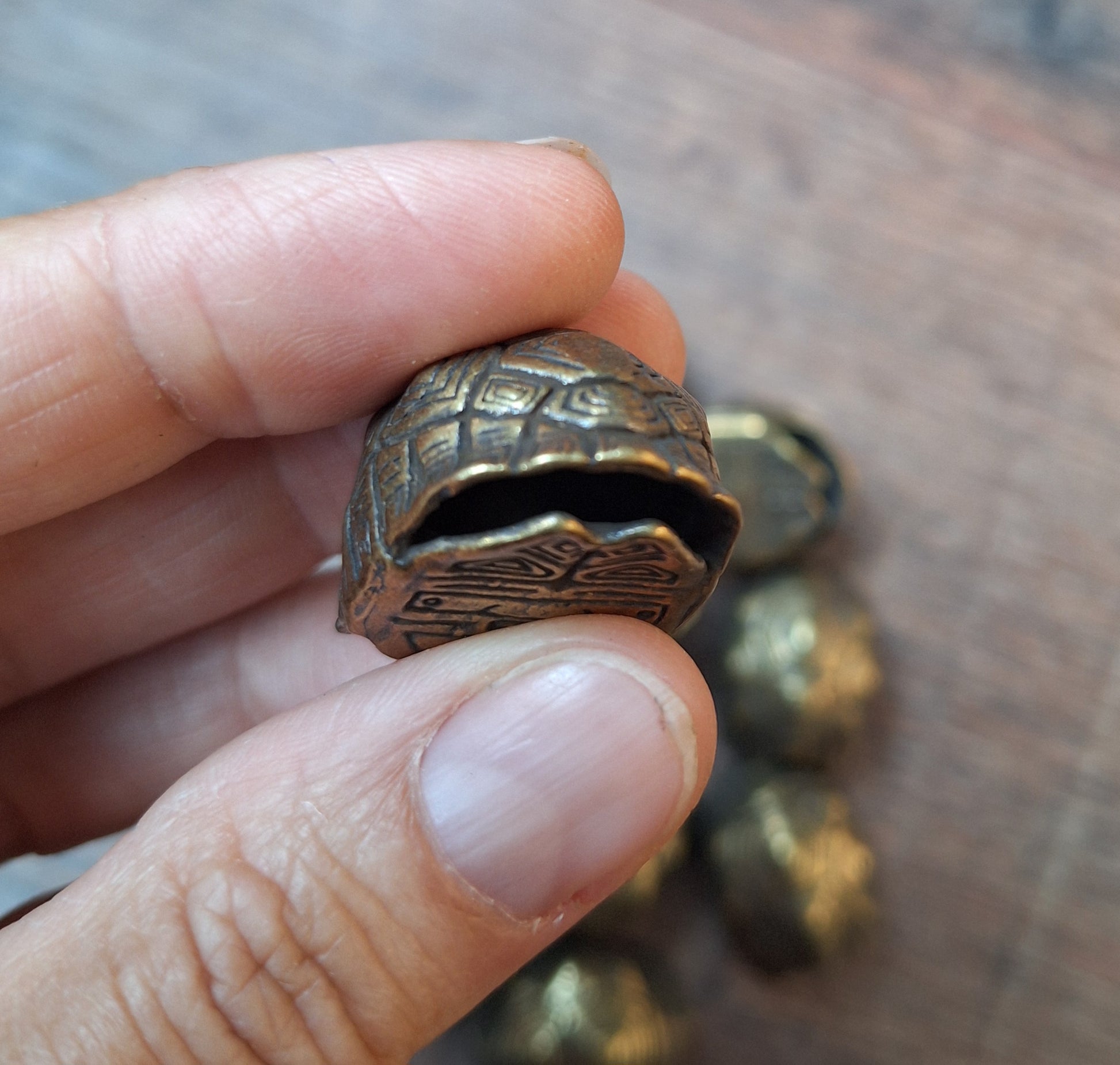 In traditional shamanism, bells are used for many purposes, because they can serve as houses for spirits and their sound represents the voice of those spirits. These beautiful bells are made in the shape of a tortoise shield and are very nicely detailed on both sides.