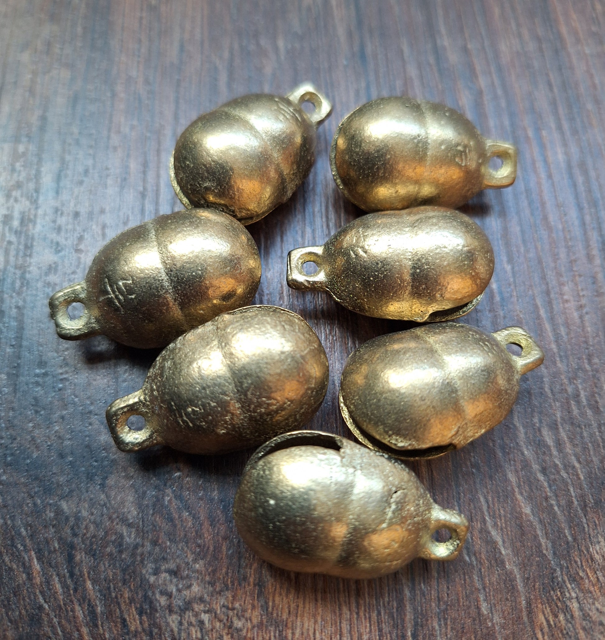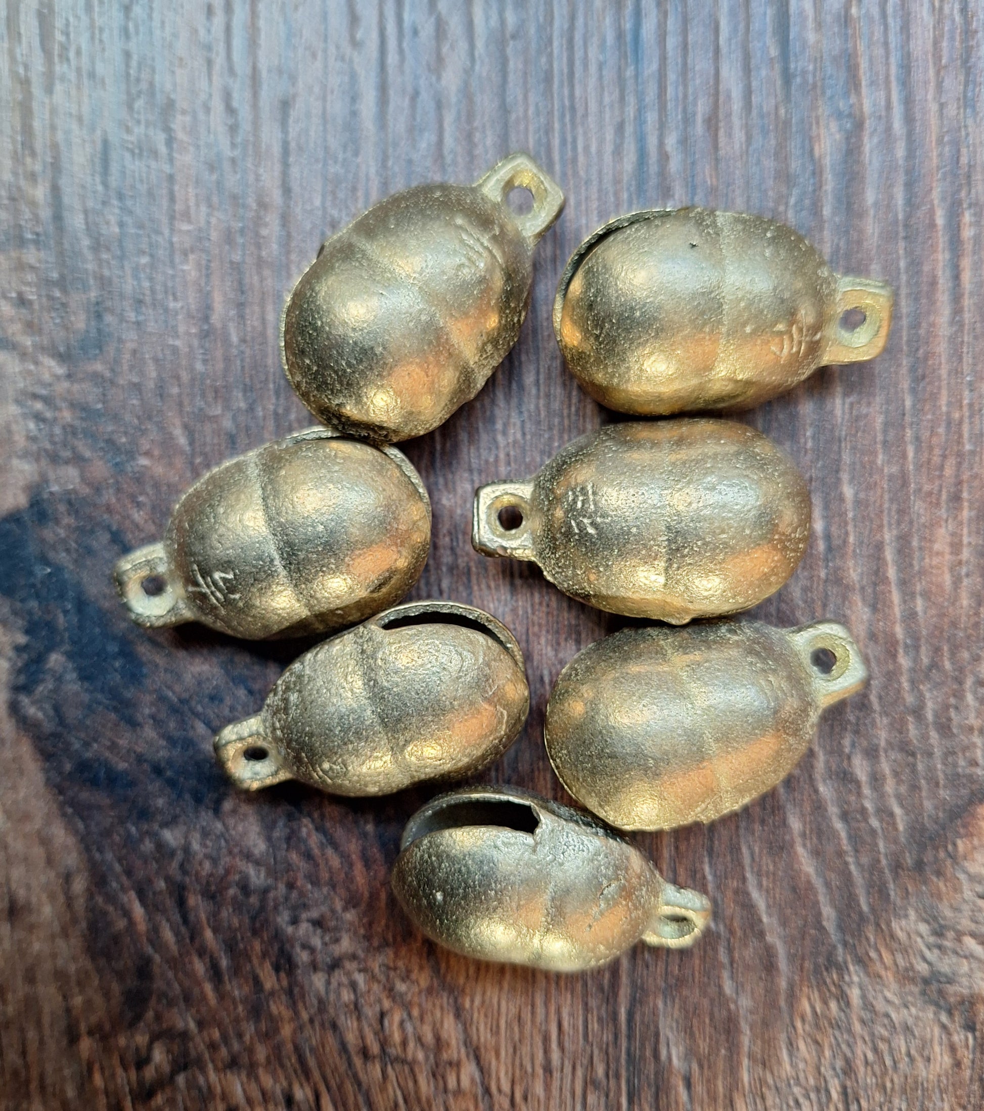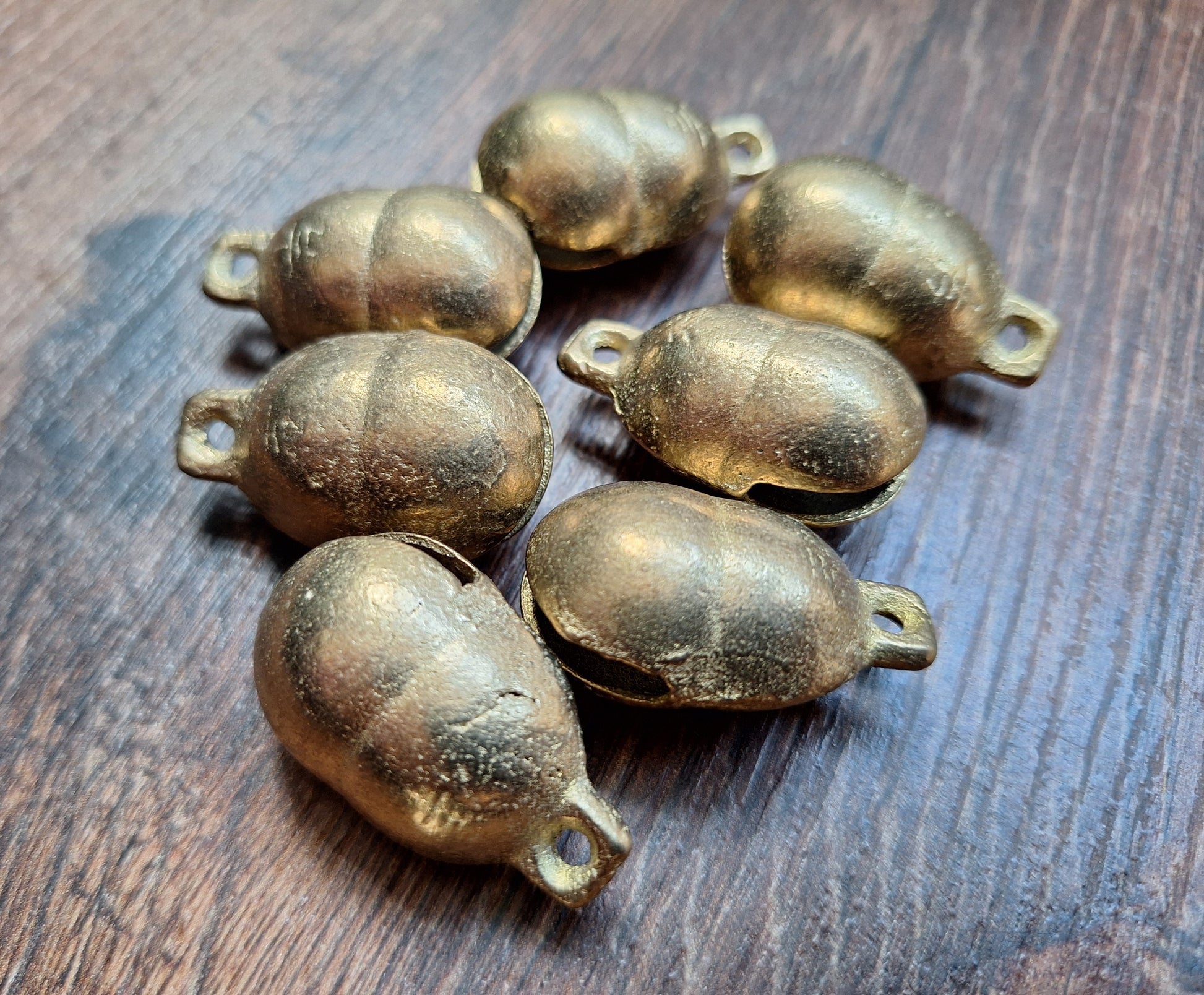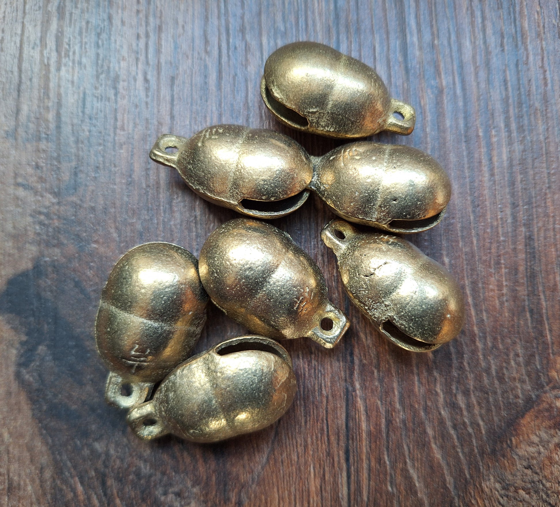 These bells are made of brass and measure 28 millimeters long (measured without the eyelet) and 20 millimeters wide. They come to us via our friends at Shaman Bazar.