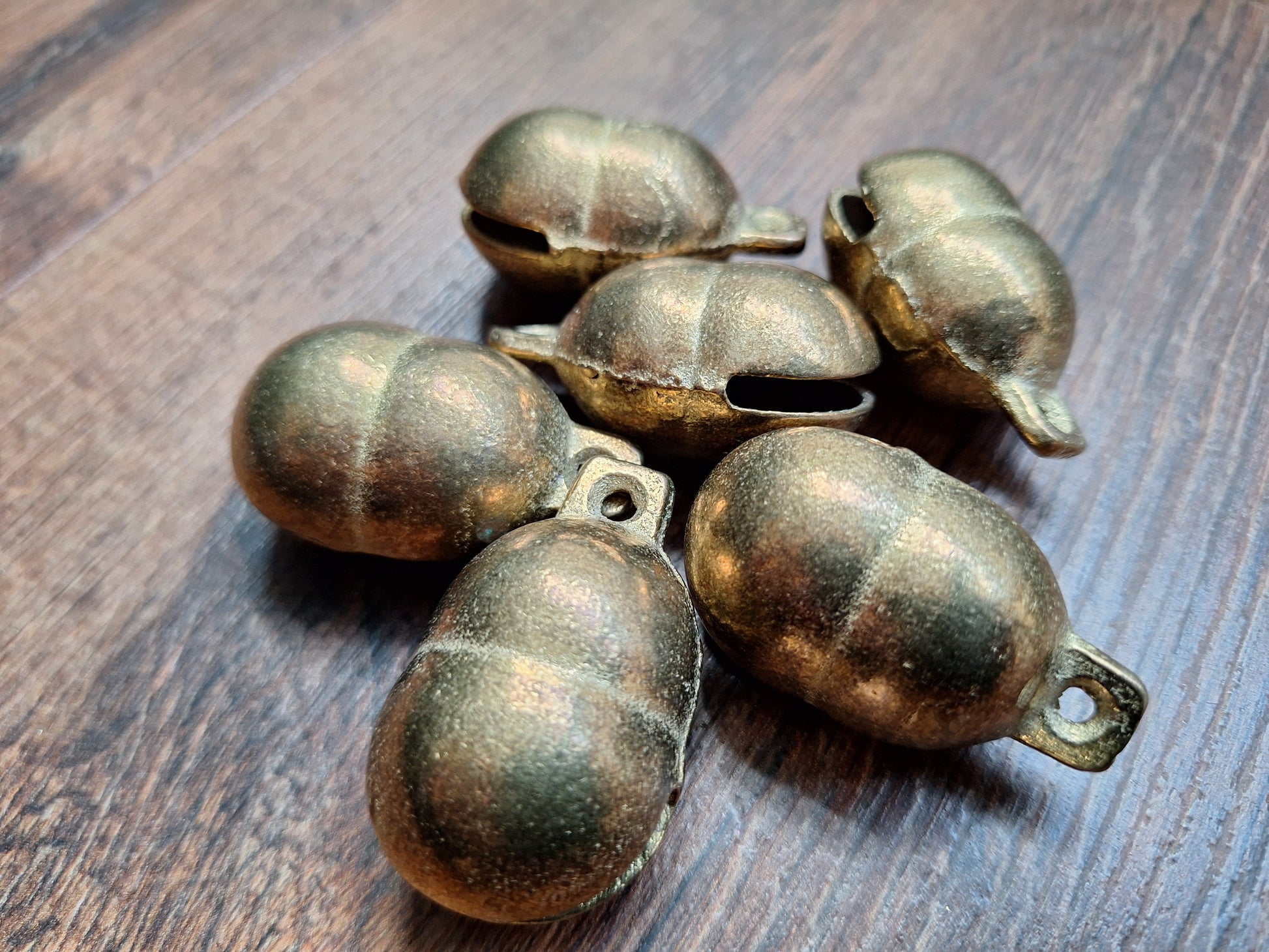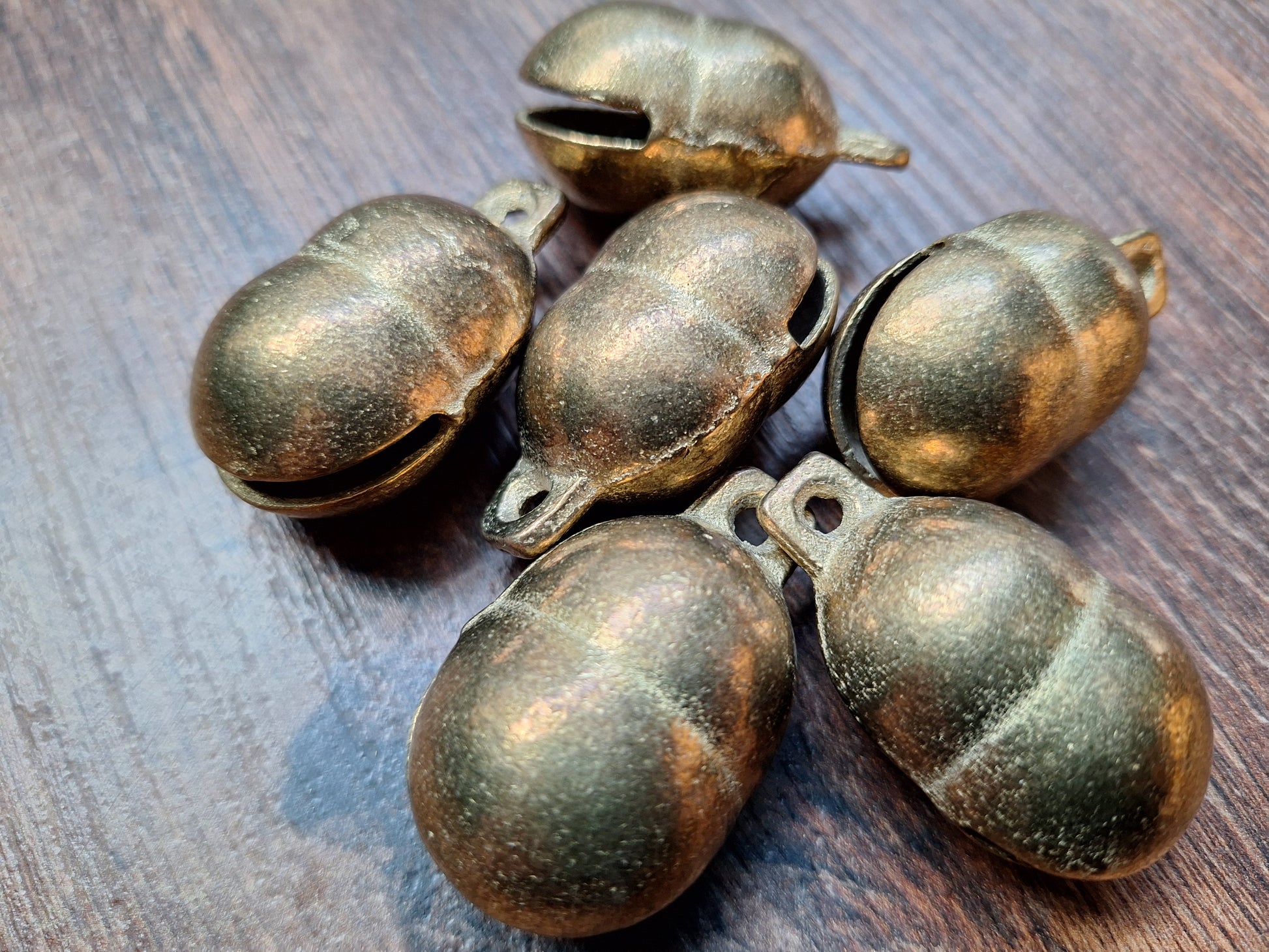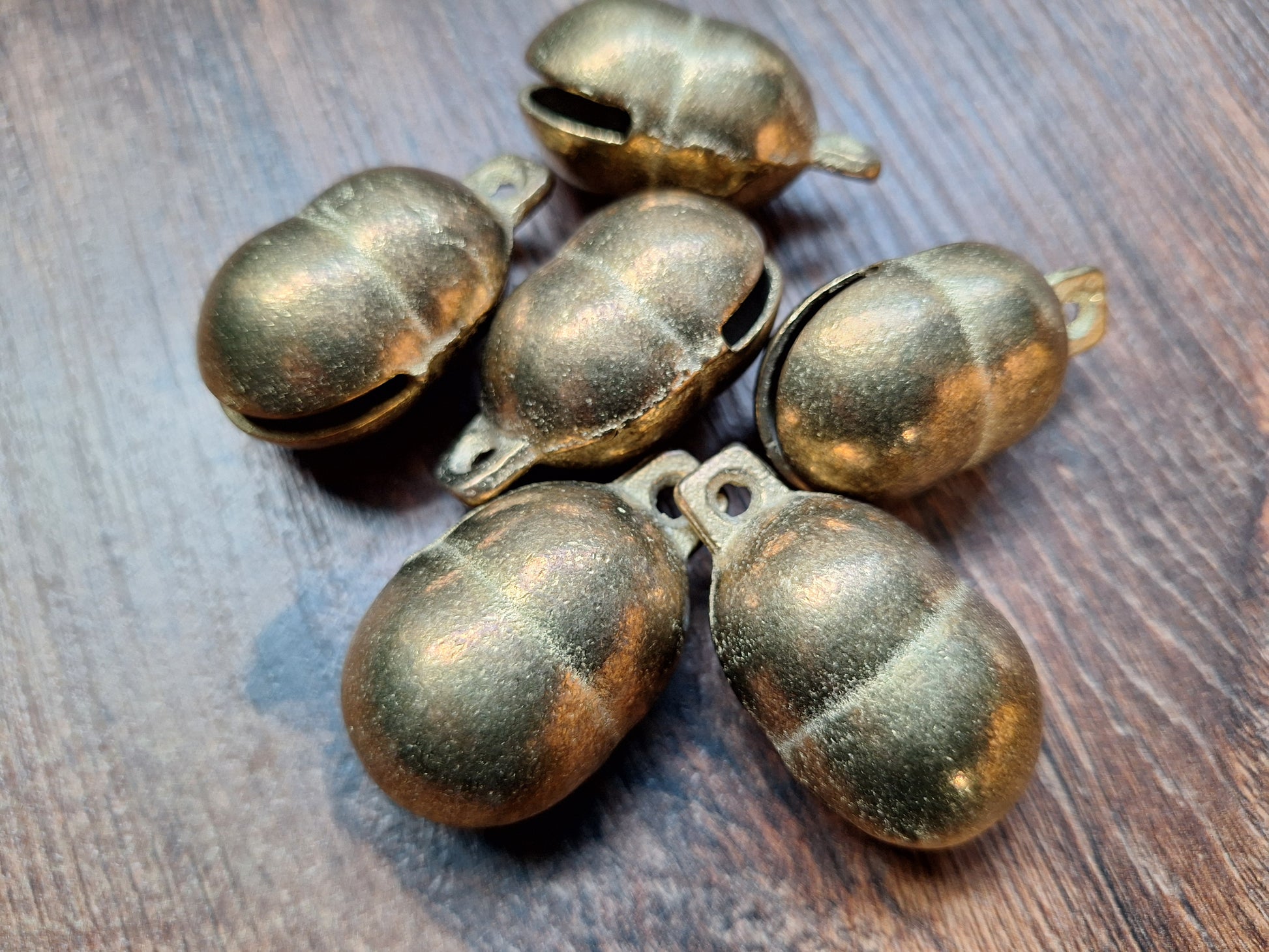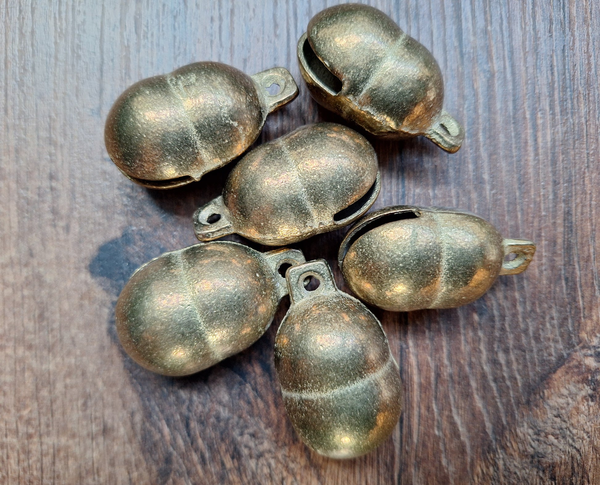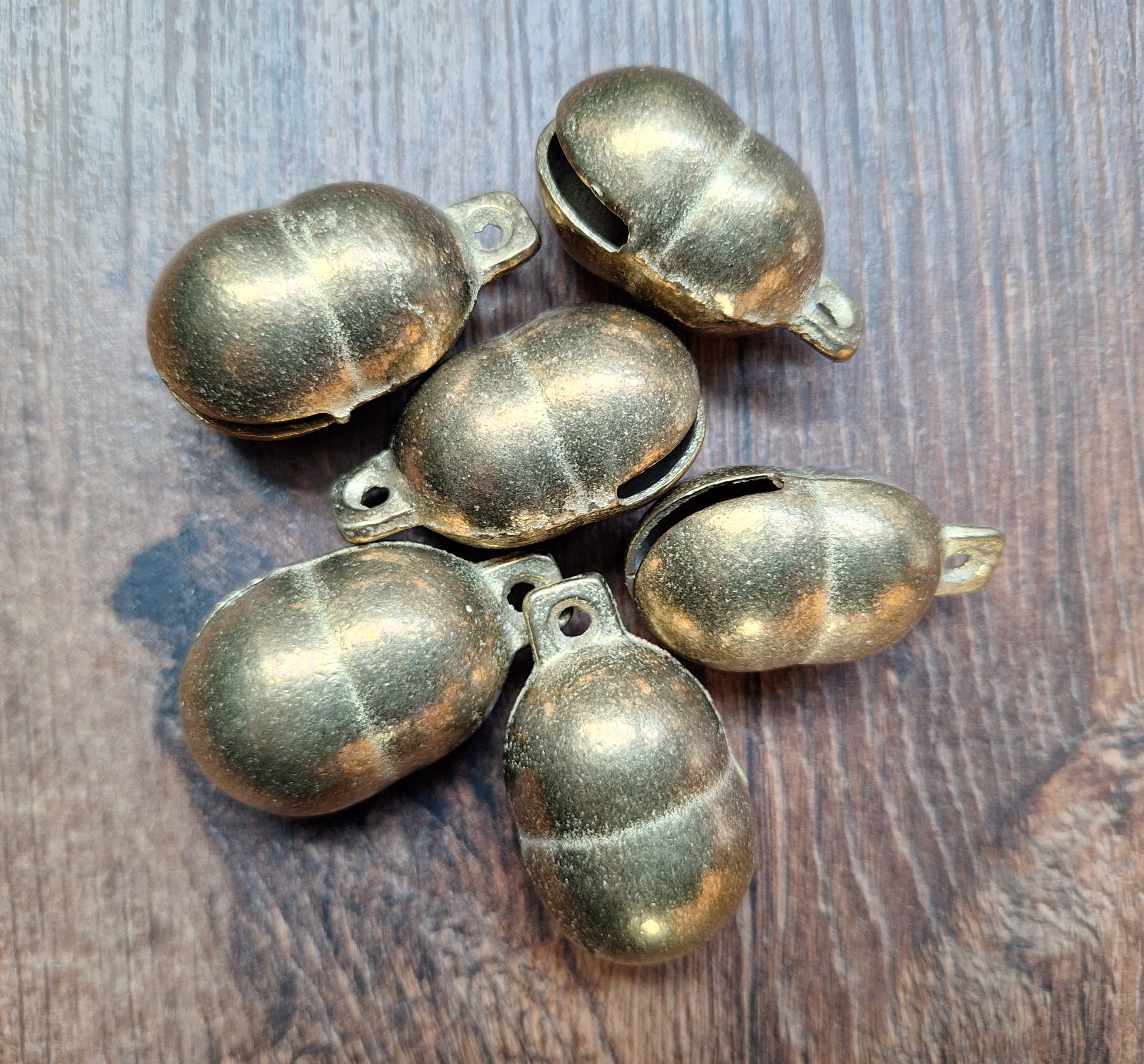These bells are made of brass and measure 35 millimeters long (measured without the eyelet) and 28 millimeters wide. They come to us via our friends at Shaman Bazar.