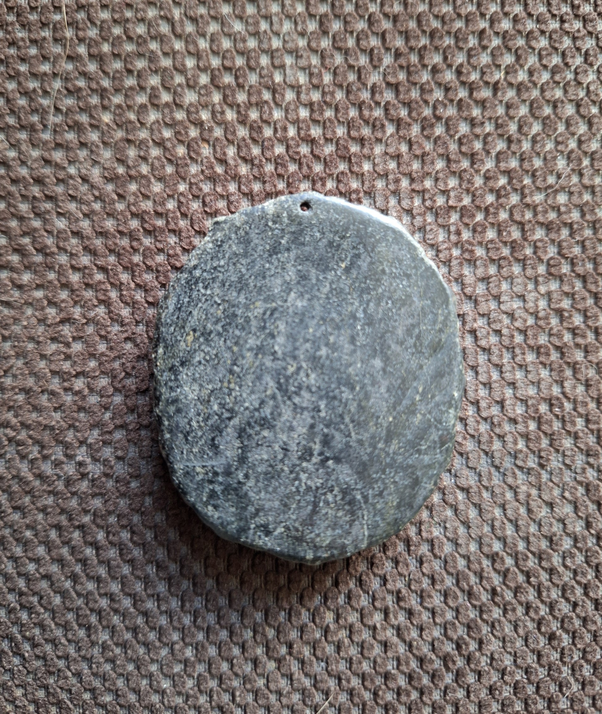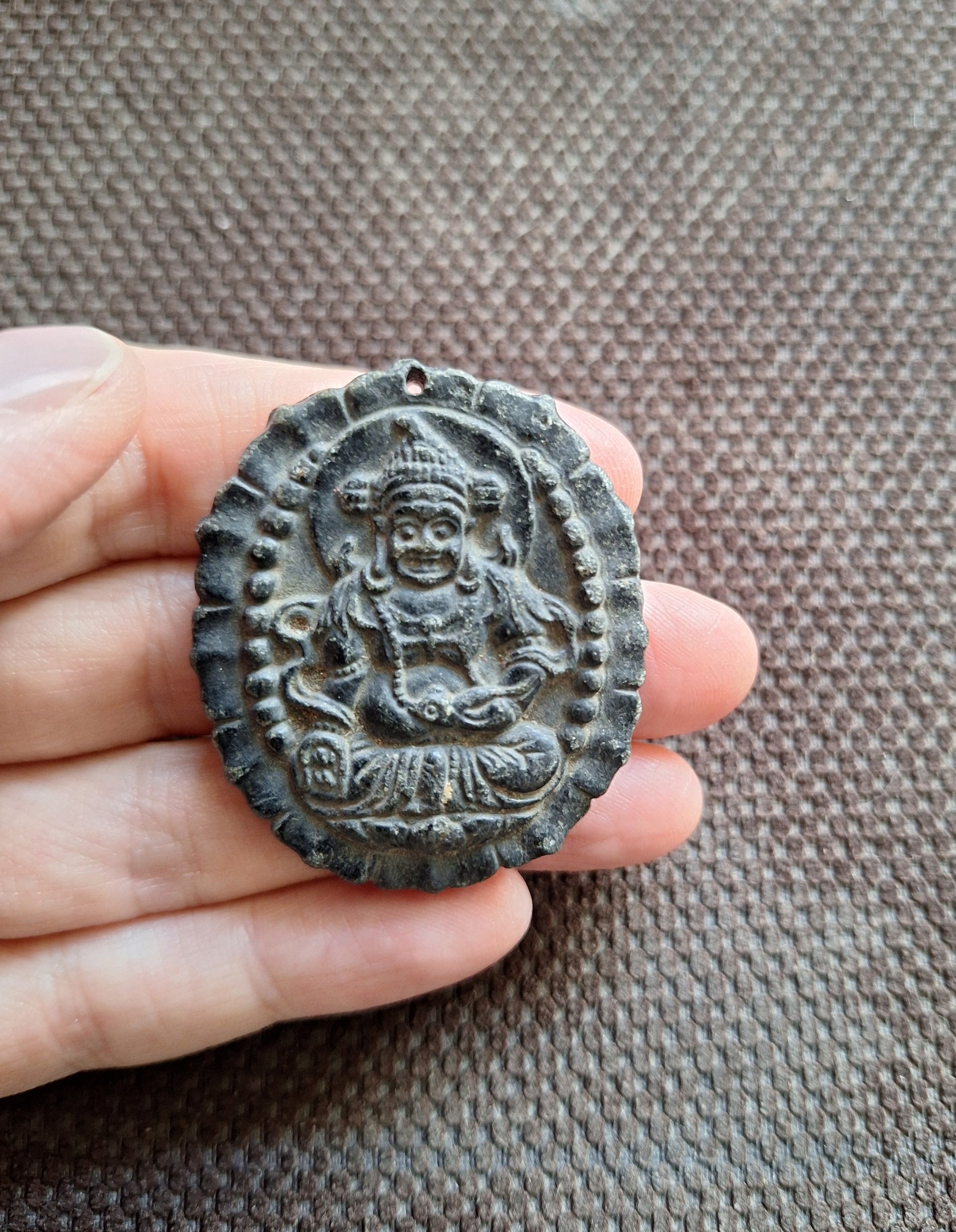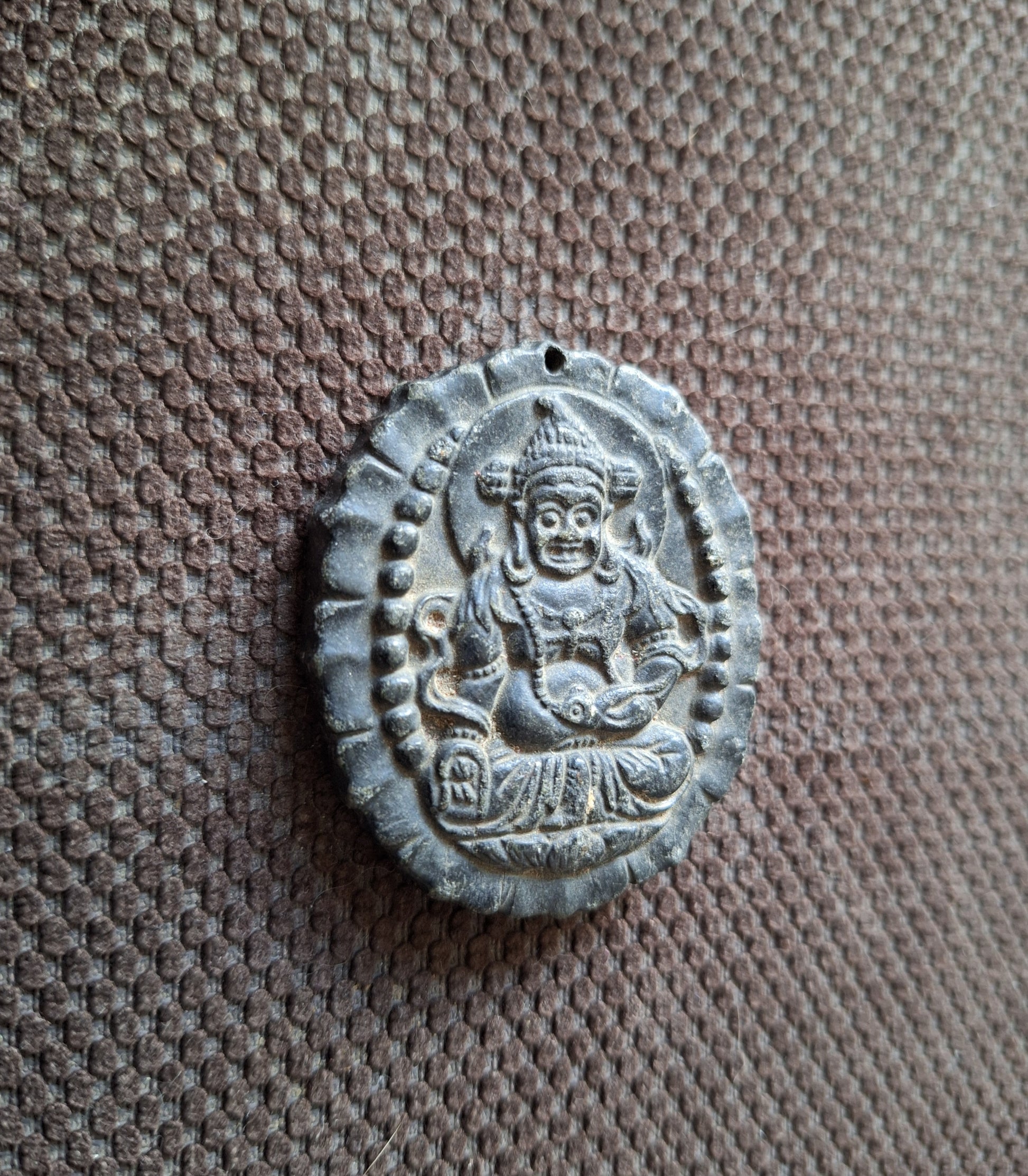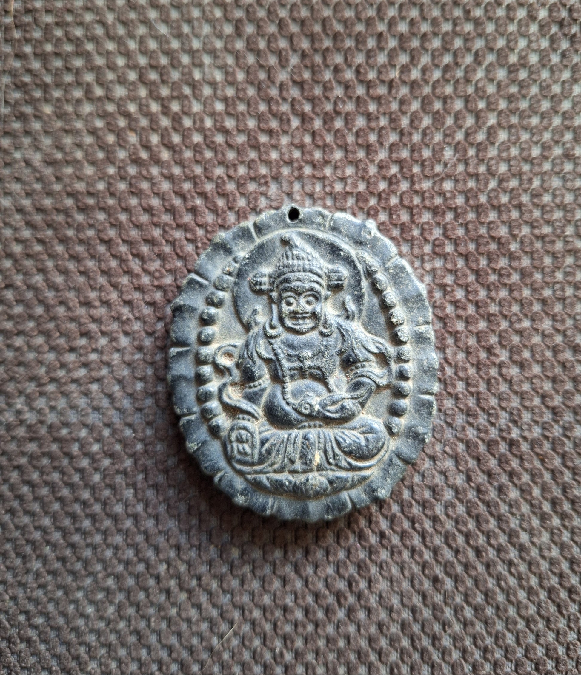 Vintage jade pendant carved with a depiction of Kubera (also named Dzambala), the Tibetan god of wealth. The jade used for this piece has a somewhat rough, stone-like appearance in an almost black, not-transparent color.