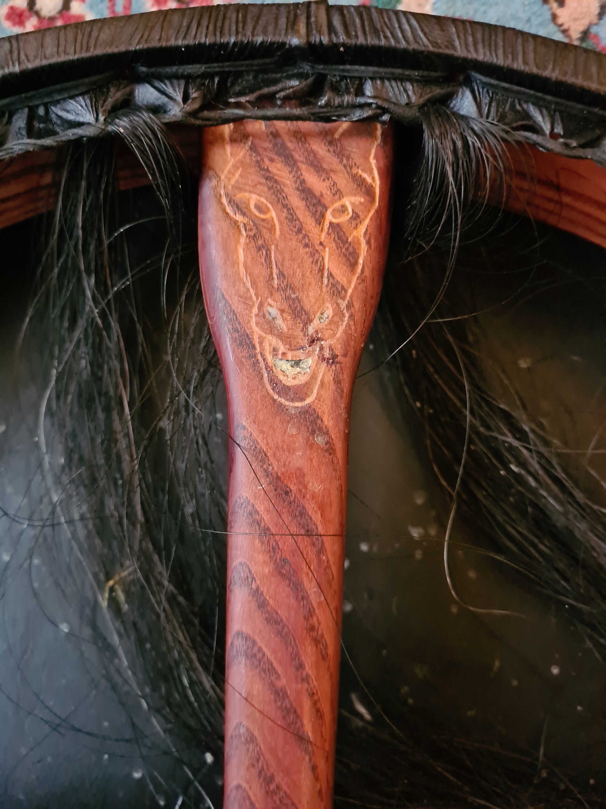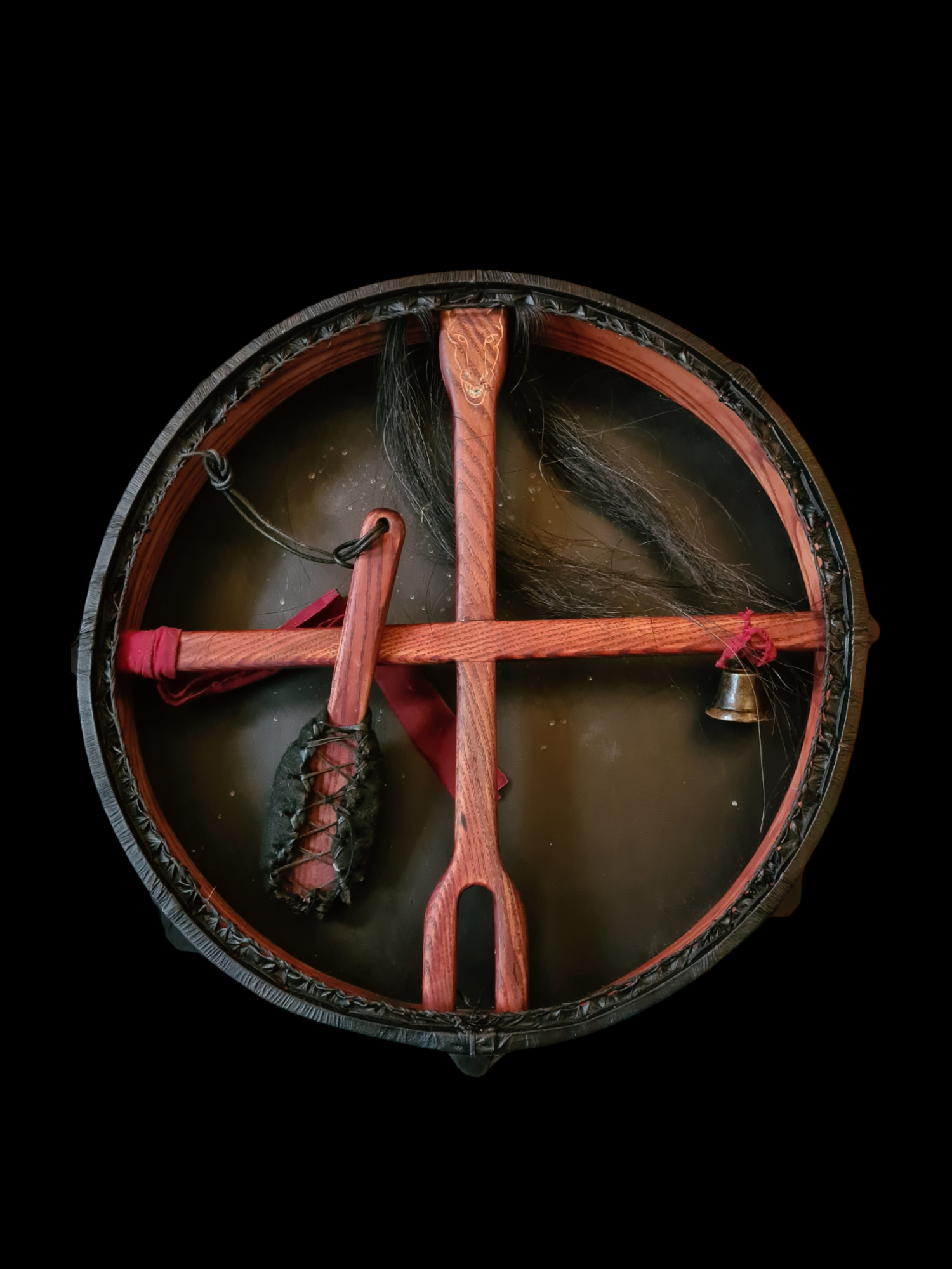 Beautiful and fierce black stallion shamanic drum made by our Spirit of Wolf collegue Timir Kam. This drum is used by someone before but only a couple of times. The energy from it's former owner is removed by Izih Deer Kam.