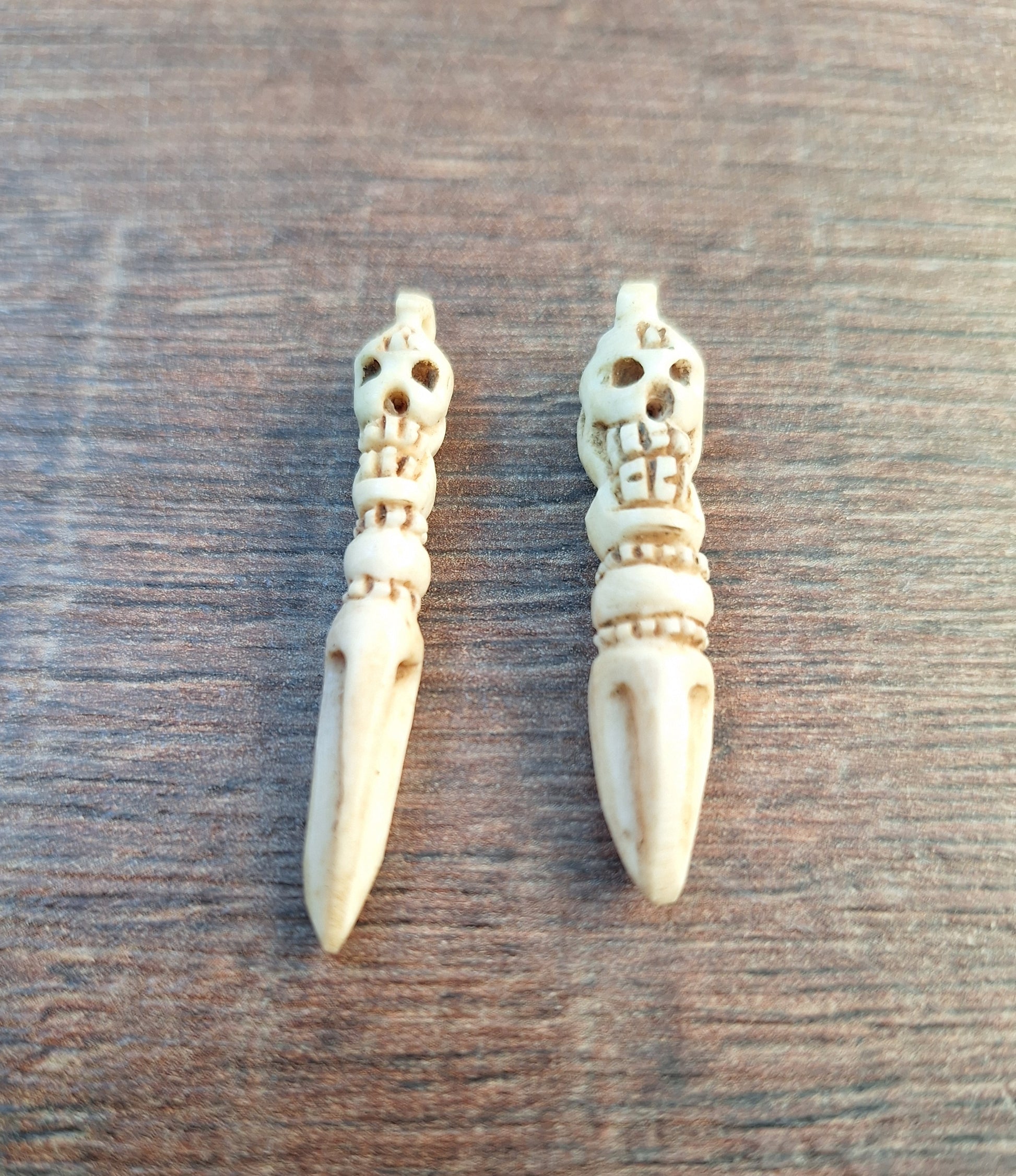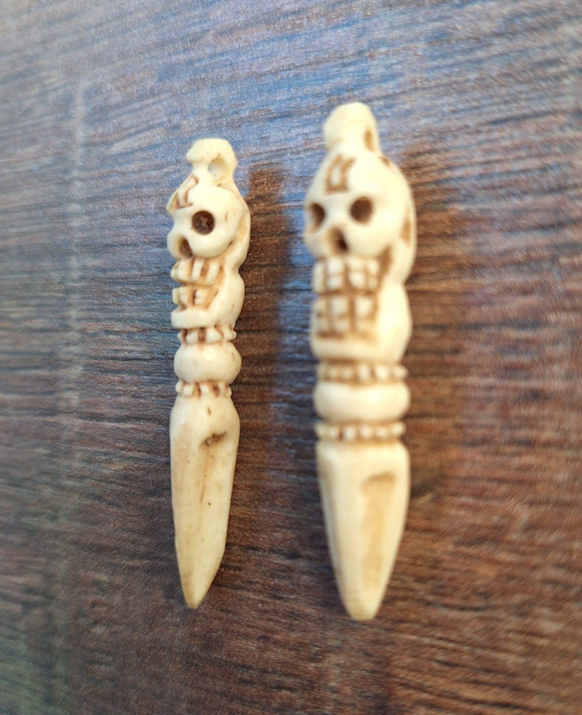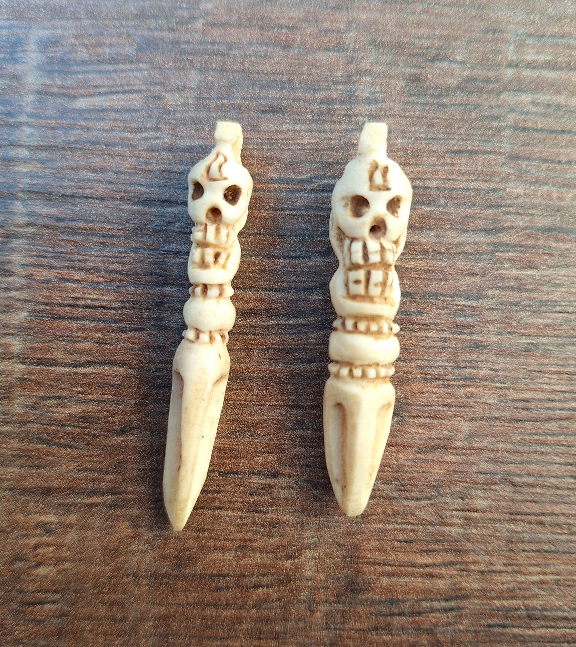 These Nepalese phurba pendants are handcarved from yak bone by an artisan craftsman in Kathmandu. Phurba pendants such as these can be worn as a personal protective amulet or for that reason be attached to your ritual attributes or clothing, but can also be used as a fully-functional ritual weapon in handy travel size.