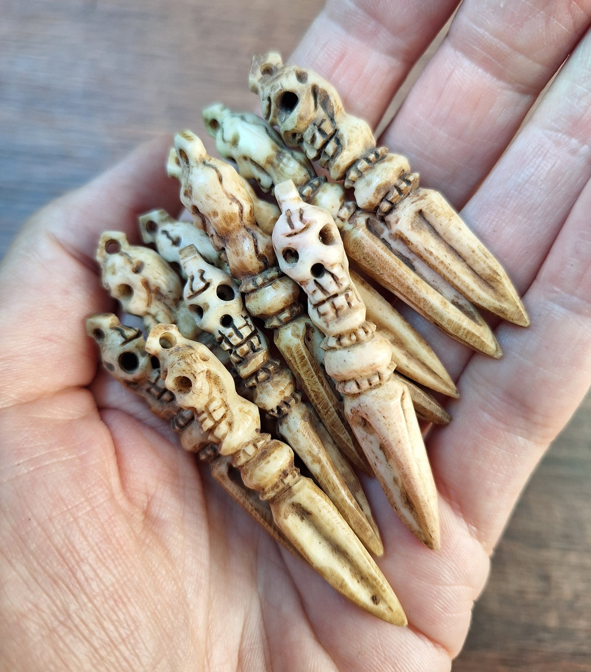 Multiple ones available, we will handpick one at random for you. Being all handcarved and from organic material, of course they all differ slightly in appearance. Length of each pendant is between 5,5 - 6 centimeters (measured including the eyelet). They are from vintage origin and therefore might have some minor damages and imperfections that come with age and previous usage, but overall they are in very good condition.
