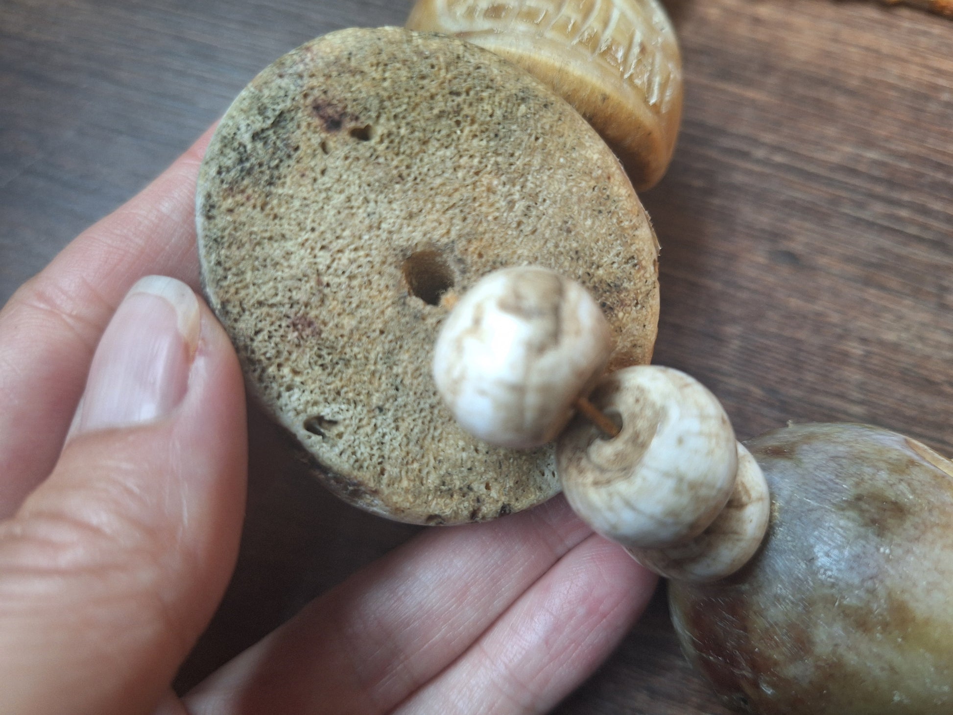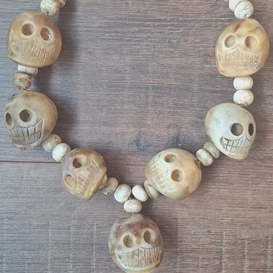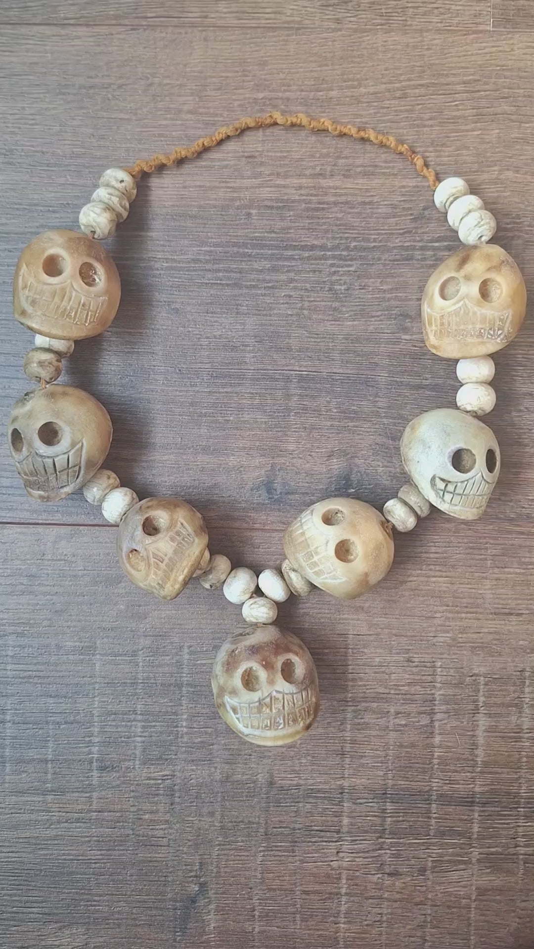 Unique necklace made with 7 large skulls carved from the joint heads of cattle bones. The skulls have been strung upon a saffron cotton cord, together with groups of beautiful old conch shell beads.