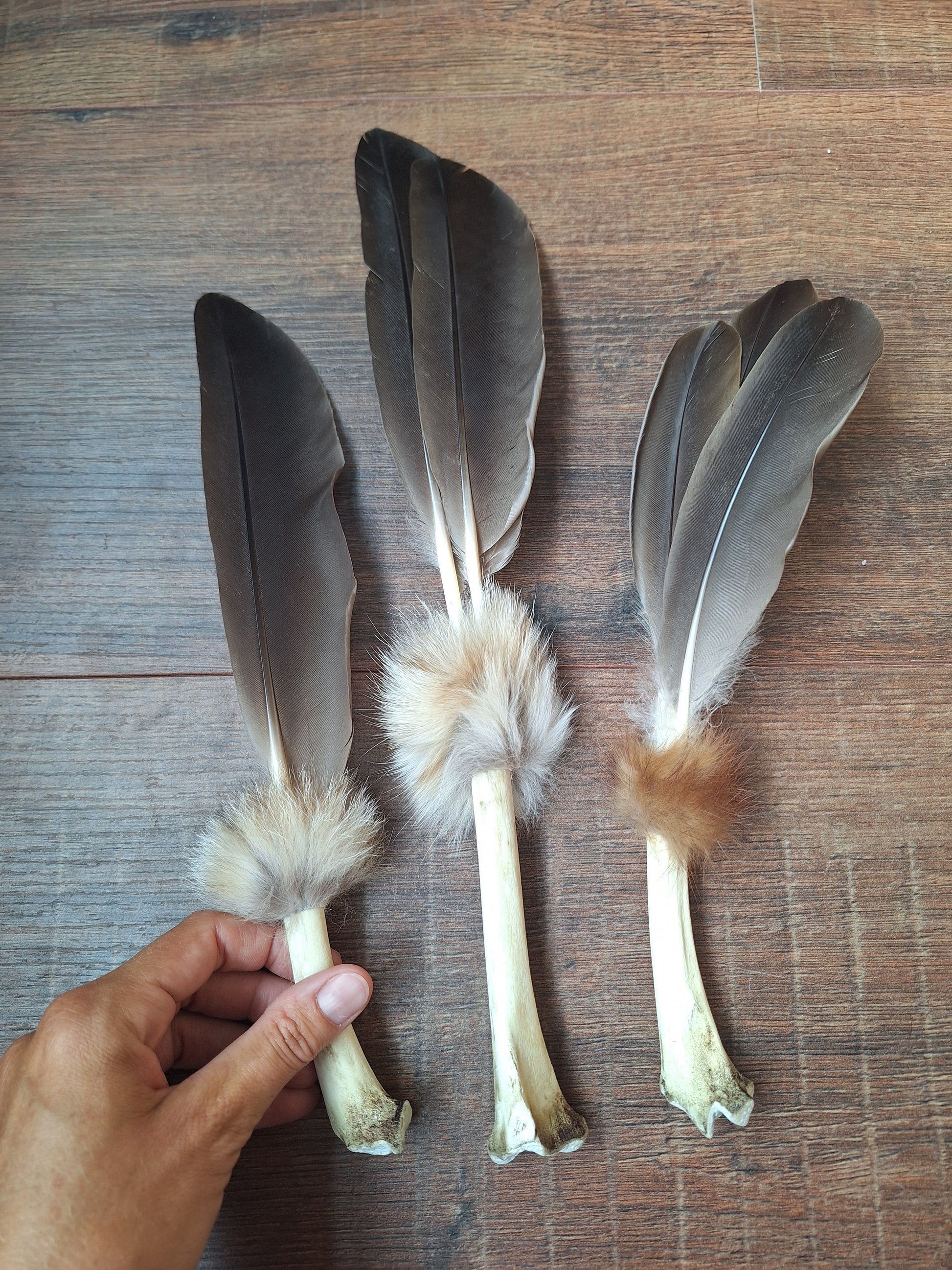Feather fans made with forest found legbones from roe deer, combined with feathers from grey goose and decorated with a scrap piece of fur. The bones are in a charming rustique condition; they have been completely cleaned and bleached by nature itself.