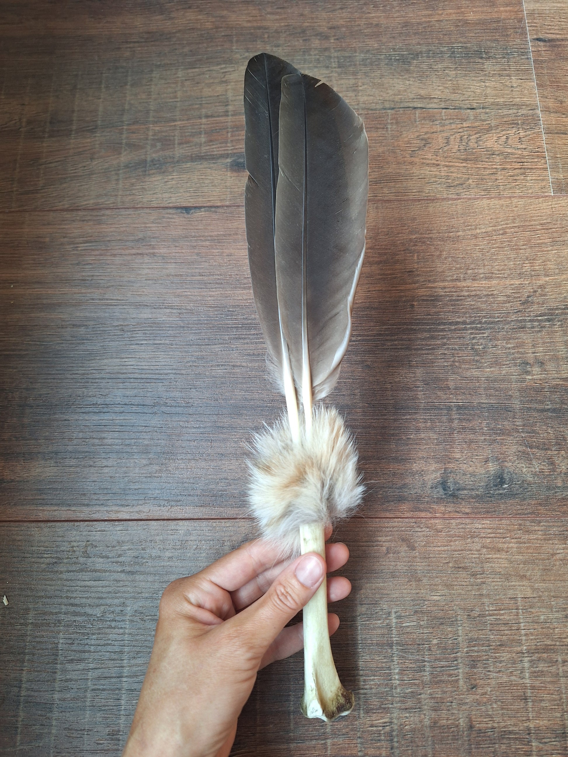 #2; 2 goose feathers, coyote fur, approximately 40 centimeters long