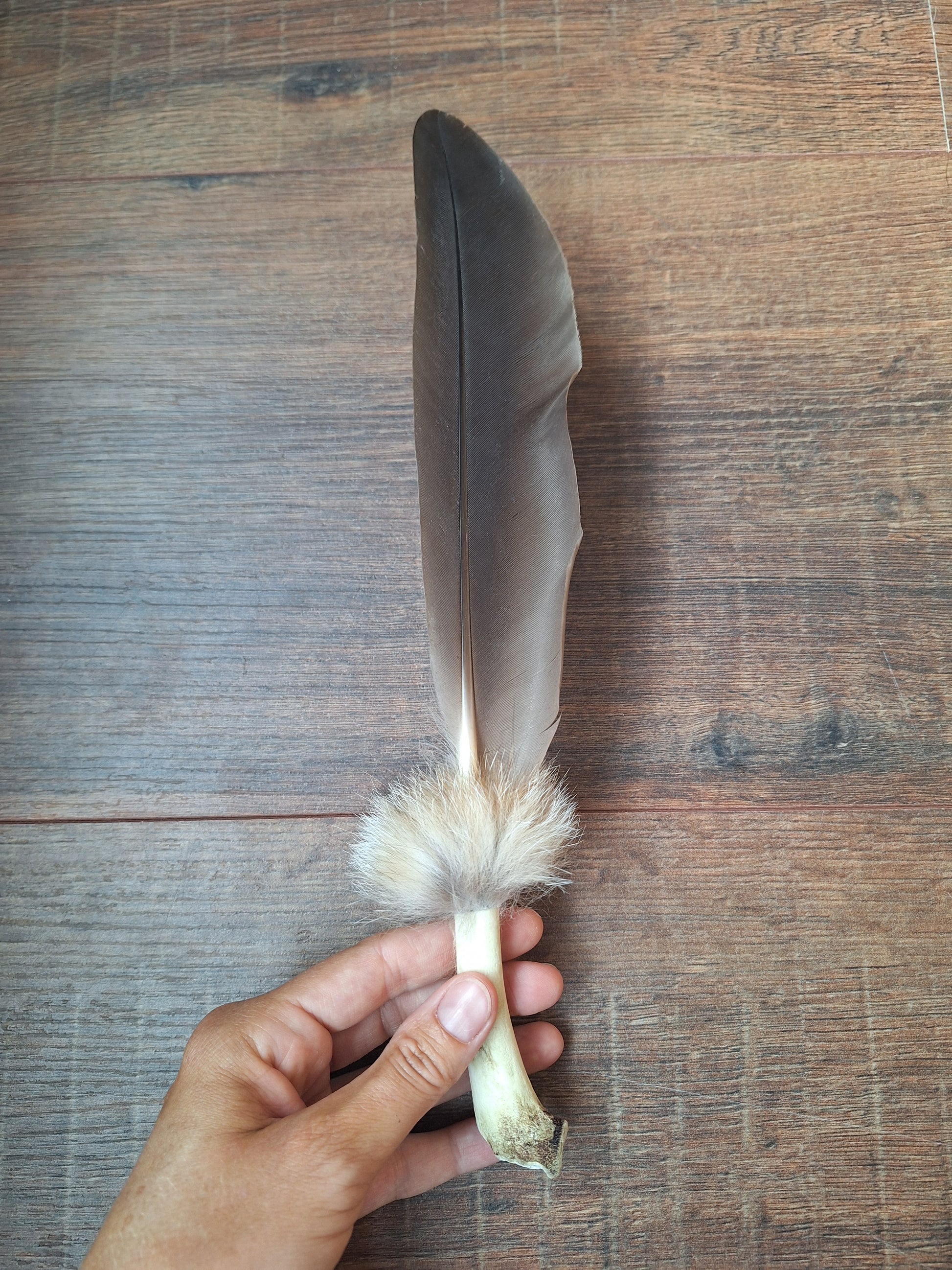 #1; 1 goose feather, fox fur, approximately 32 centimeters long