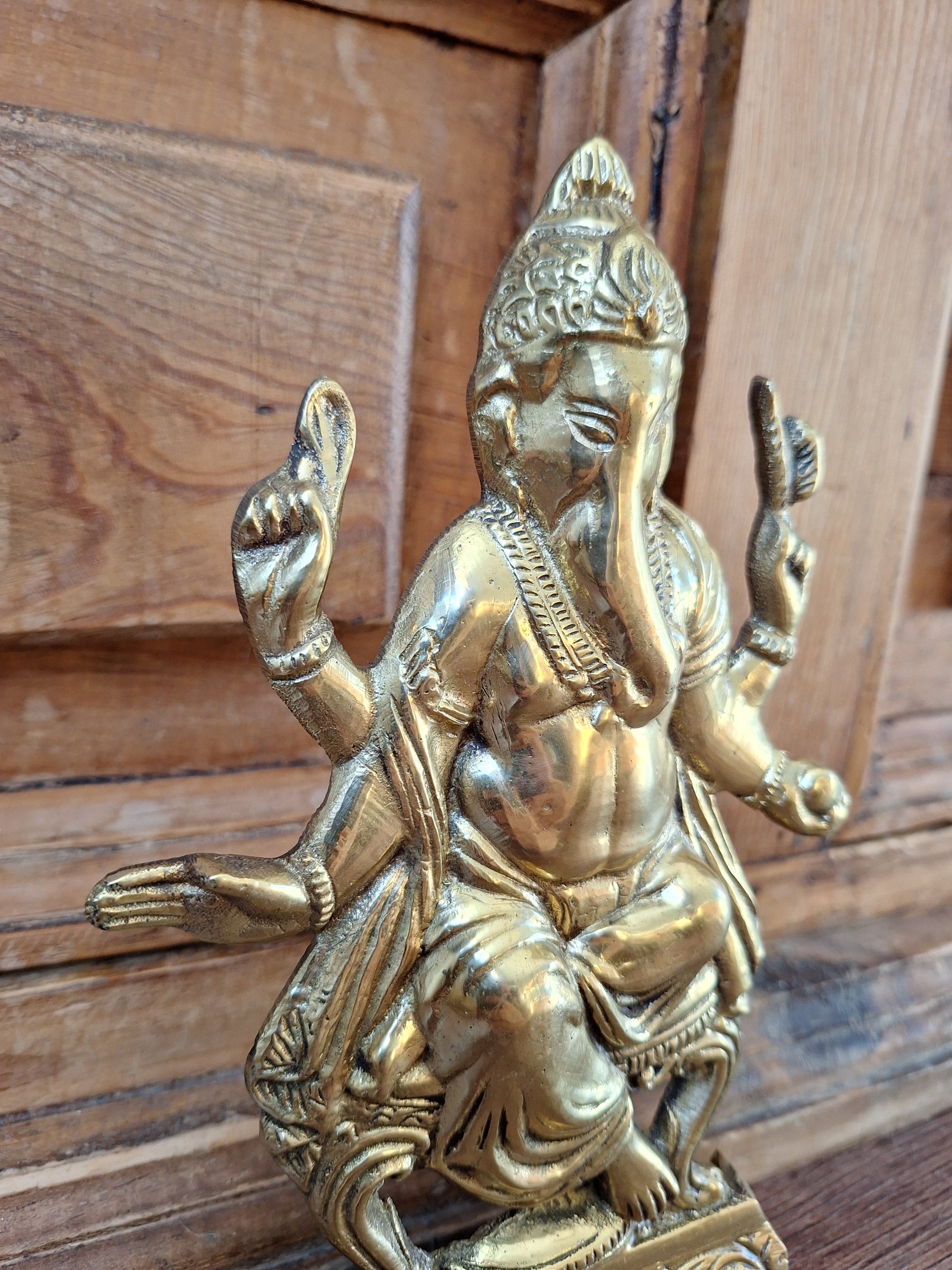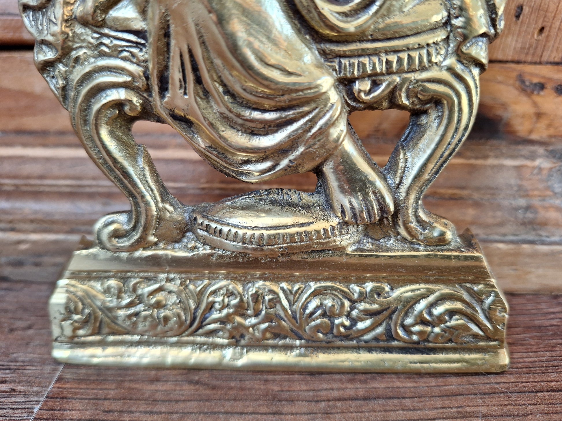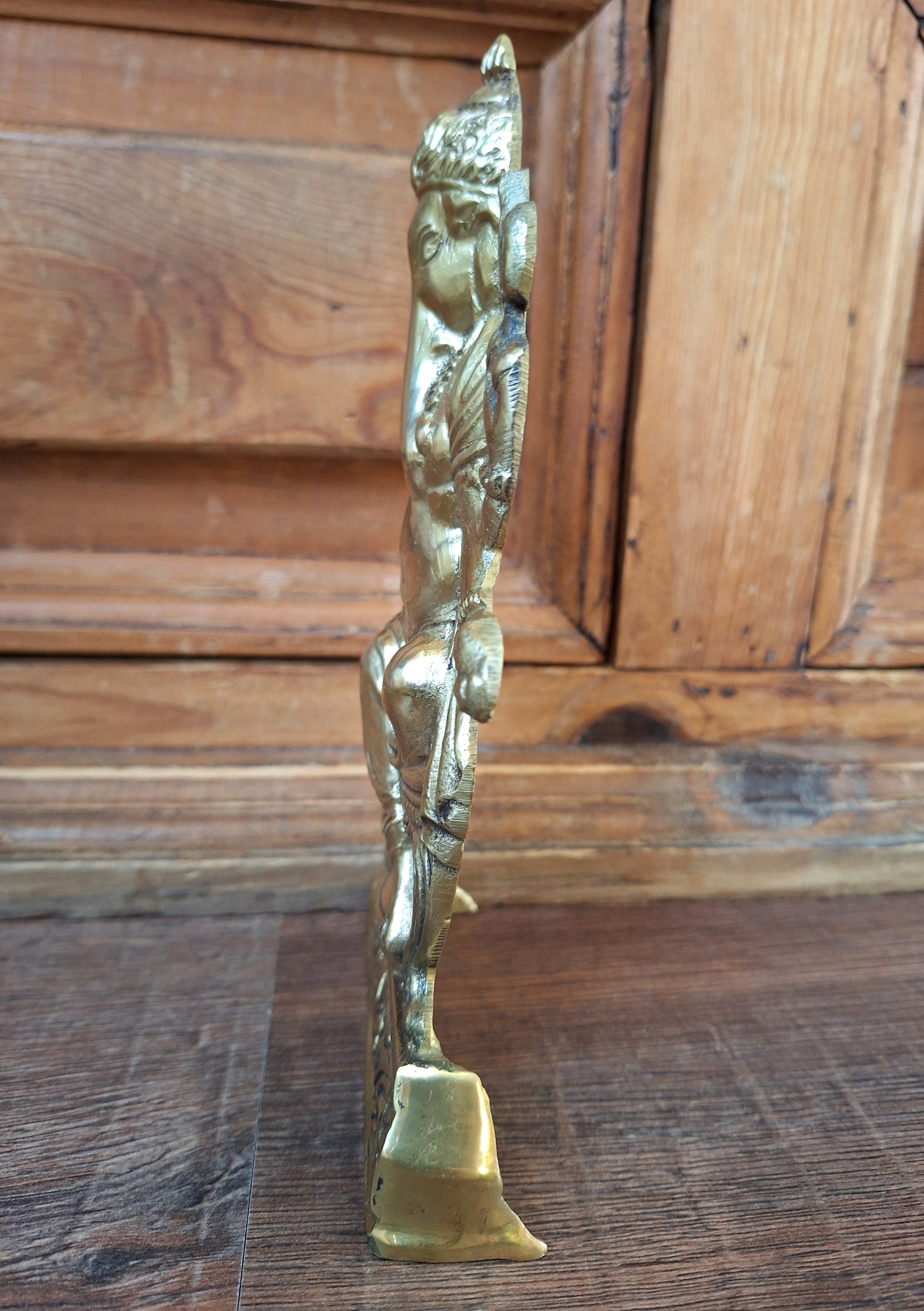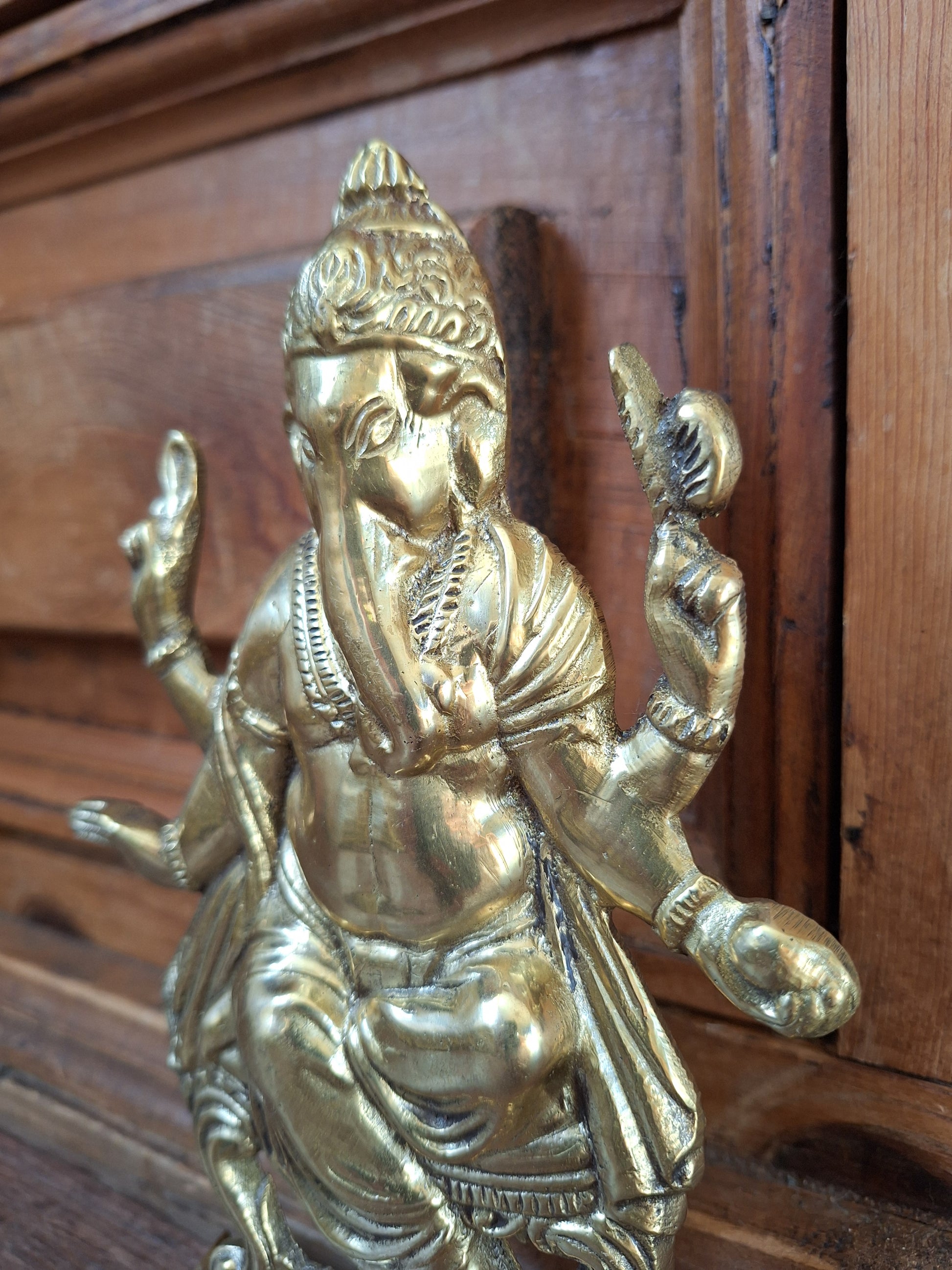 This figurine of Ganesha is made from brass. It is approximately 21 centimeters high and 12 centimeters wide. It weighs 544 grams. This is a back-less, flat statue, ideal to be used at the rear of an altar or if you have only a very small space for it. As can be seen on the pictures, the decoration is done in a simple way, not very finely detailed. But overall it is in good condition and will make a nice altarpiece.
