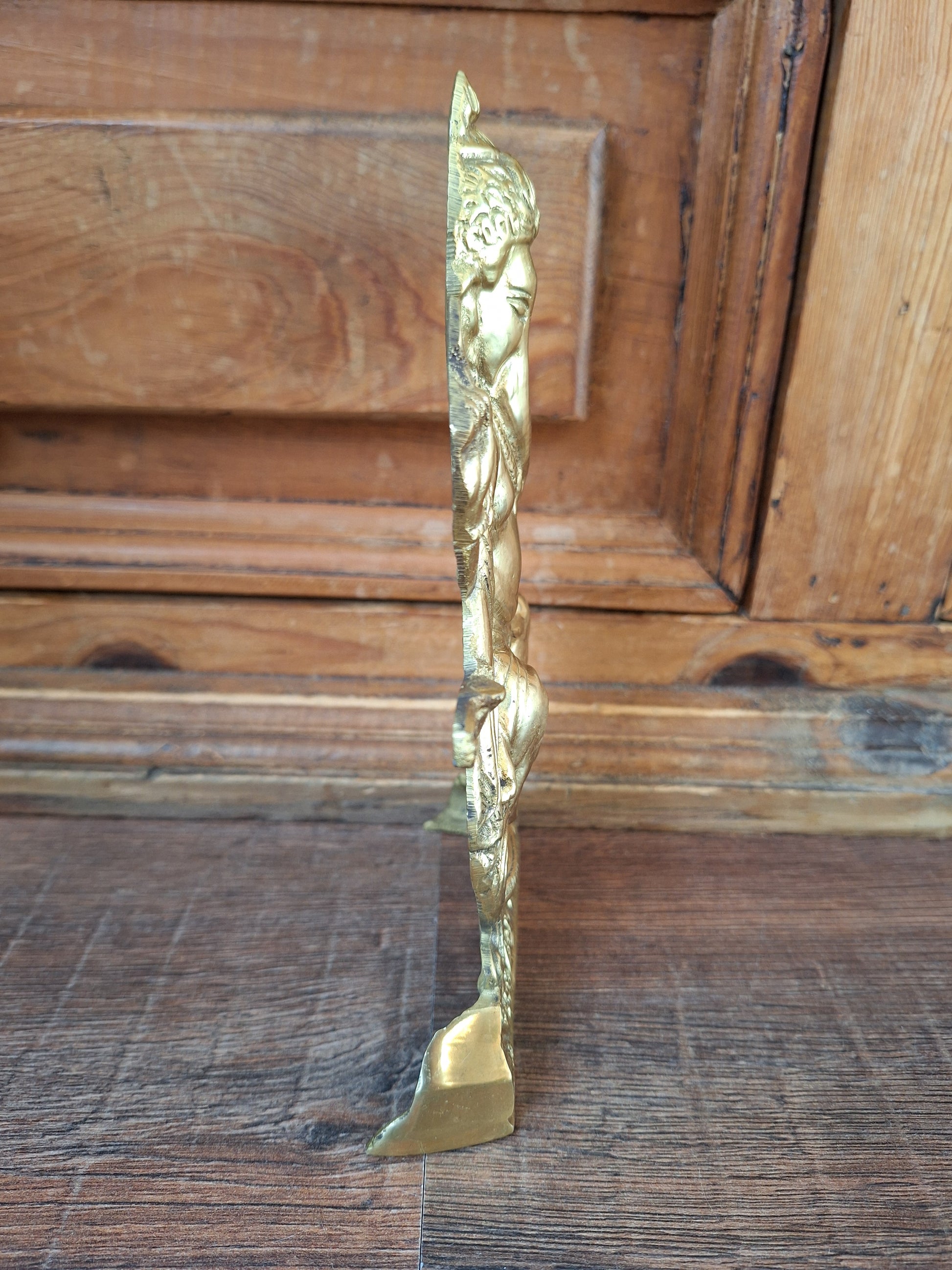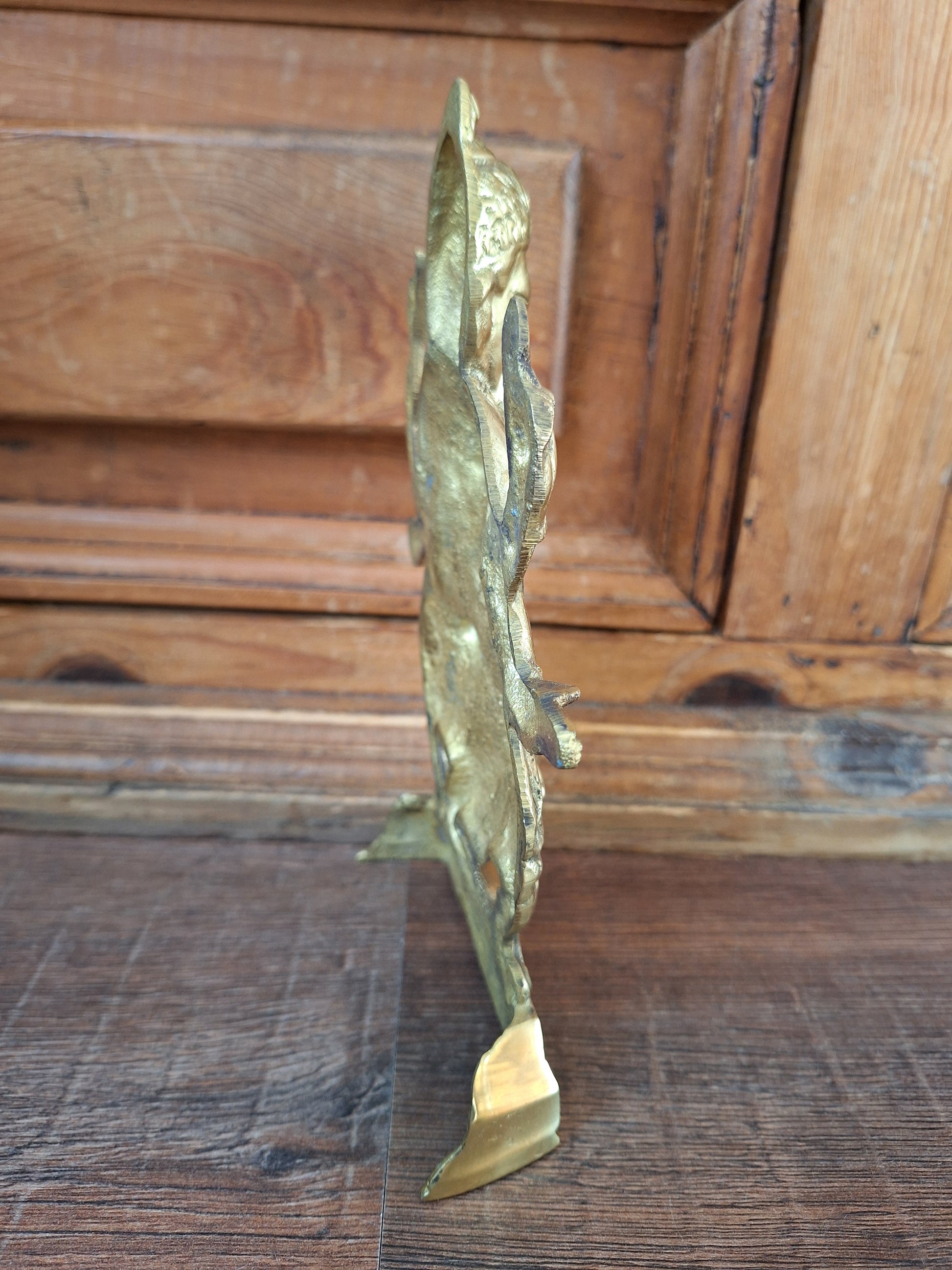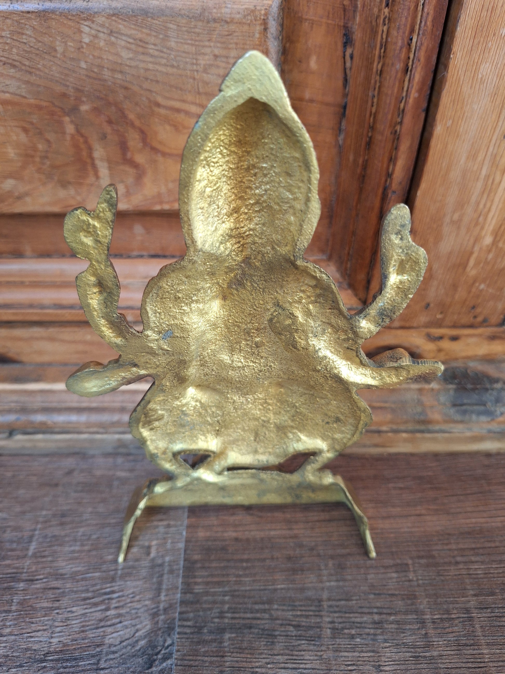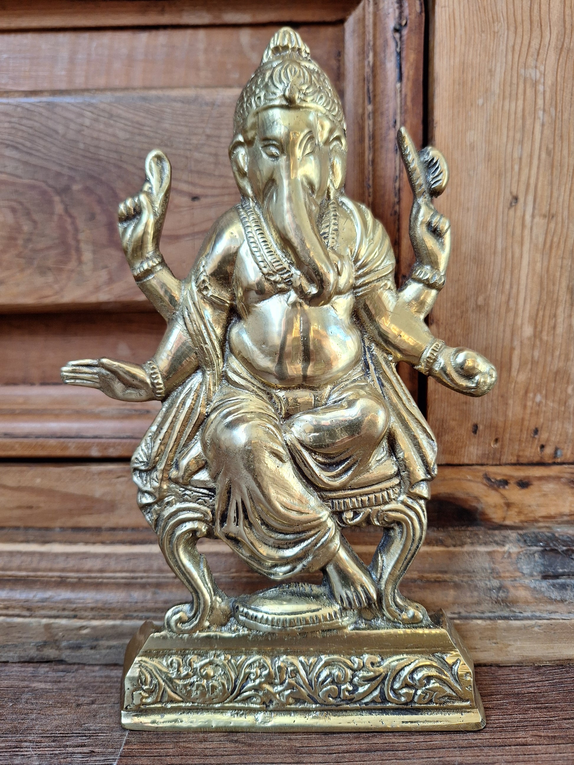 This figurine of Ganesha is made from brass. It is approximately 21 centimeters high and 12 centimeters wide. It weighs 544 grams. This is a back-less, flat statue, ideal to be used at the rear of an altar or if you have only a very small space for it. As can be seen on the pictures, the decoration is done in a simple way, not very finely detailed. But overall it is in good condition and will make a nice altarpiece.