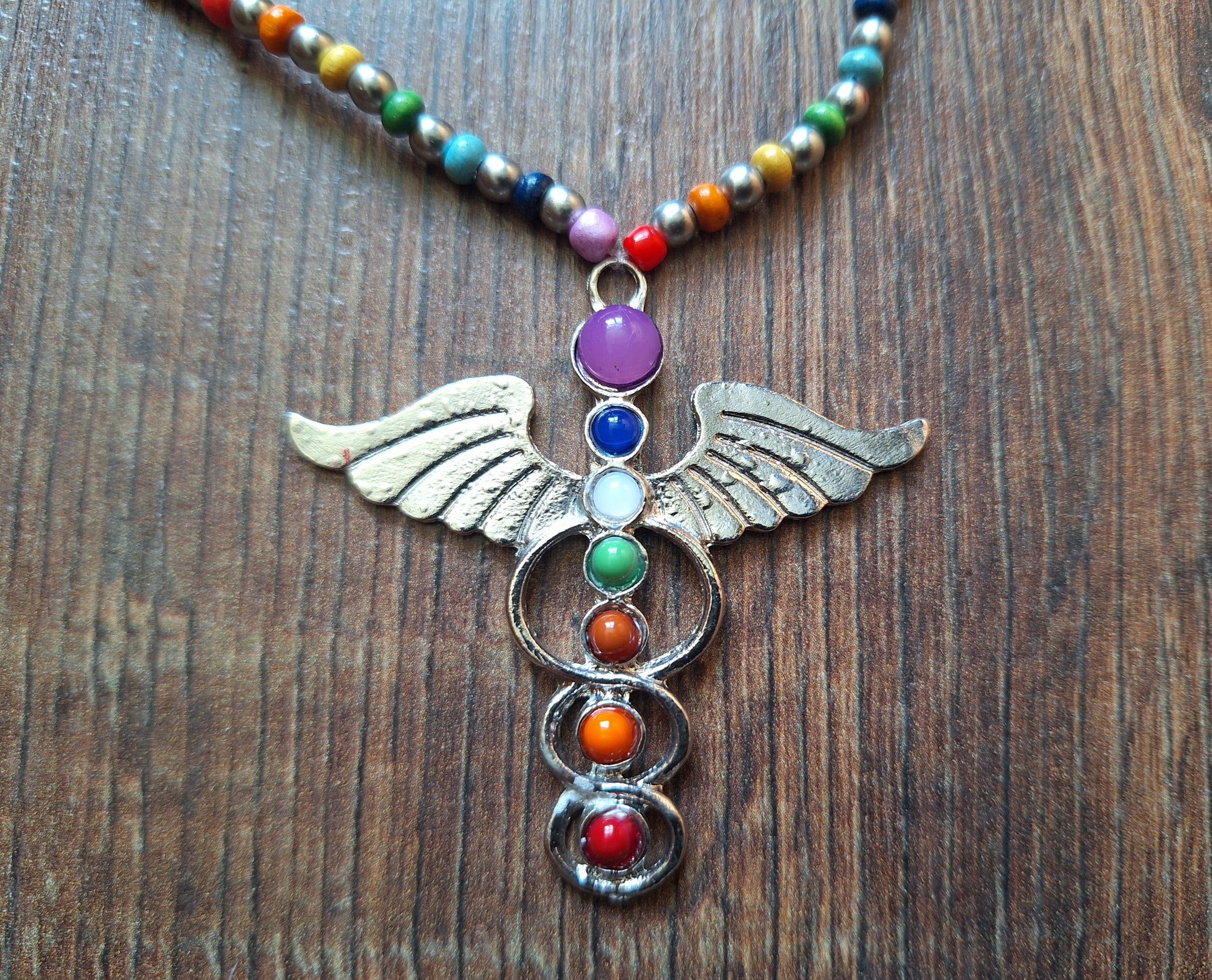 Recently made, lightweight chakra necklace, with colorful metal and wooden beads strung on nylon wire, closing with a lobster-style clasp. The central pendant is made of alpaca metal and decorated with synthetic cabochons. Please note that all parts are simple and factory made, therefore the price is kept low.