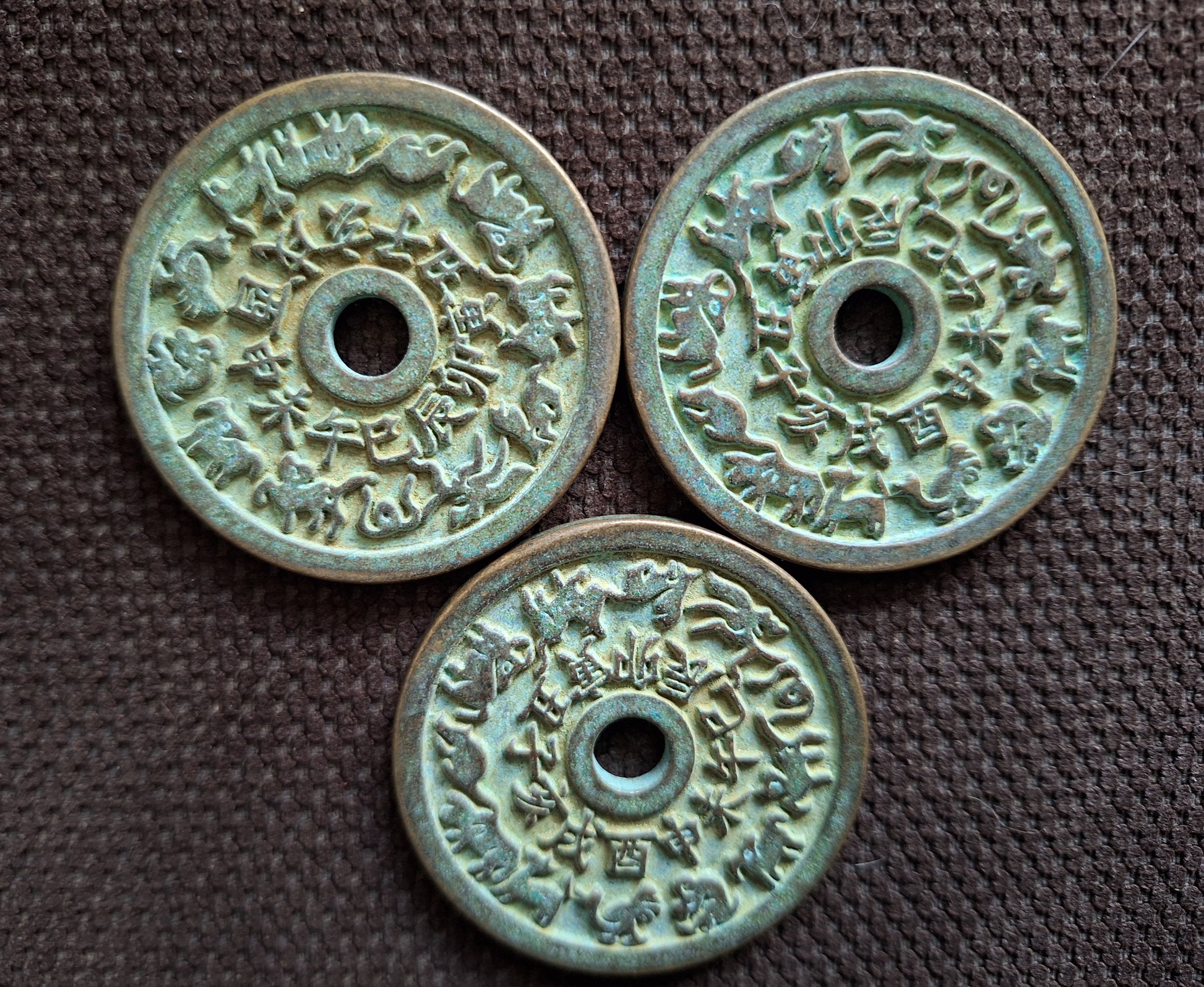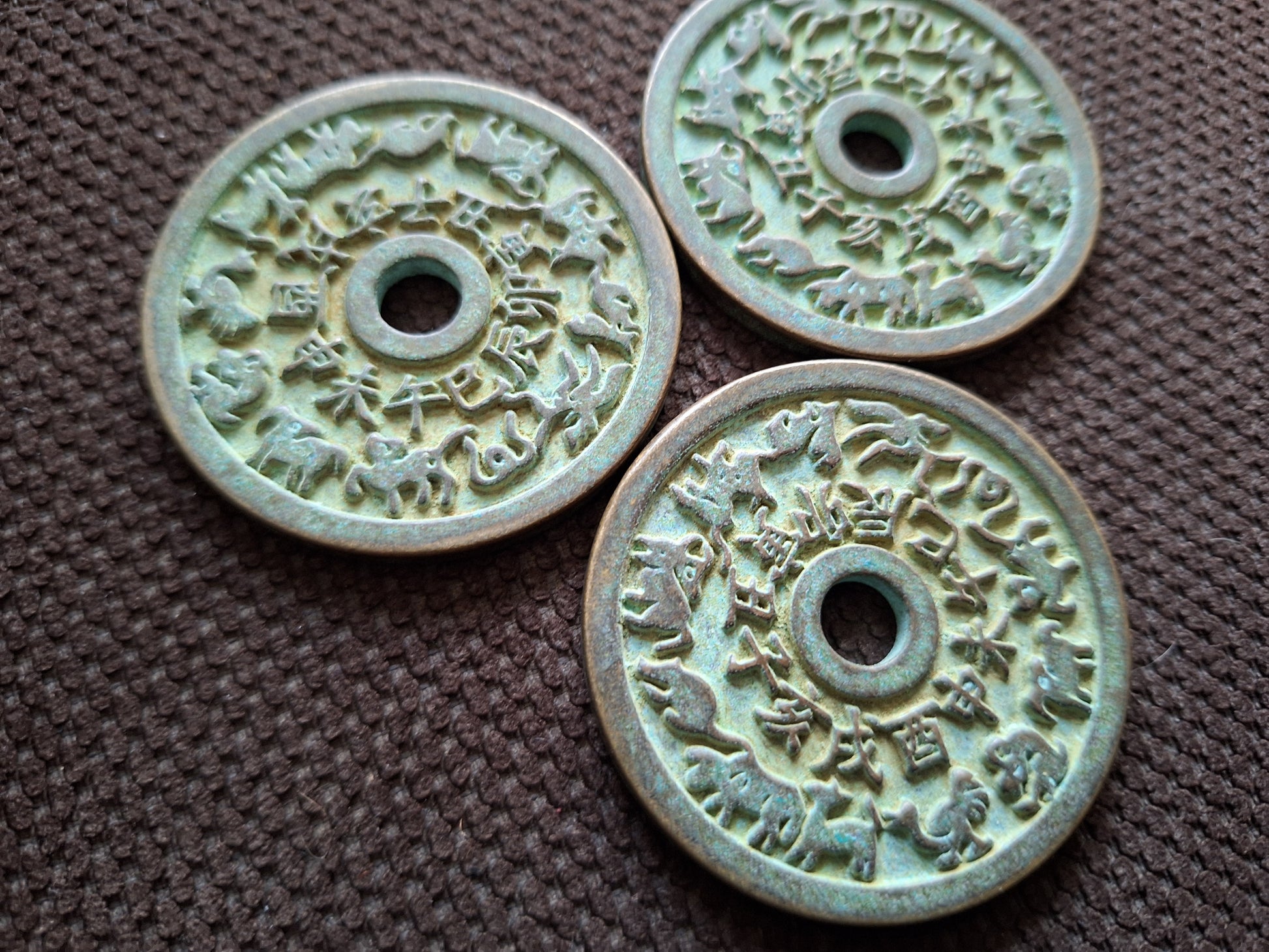 Vintage bronze numismatic charm Trigrams and Zodiac