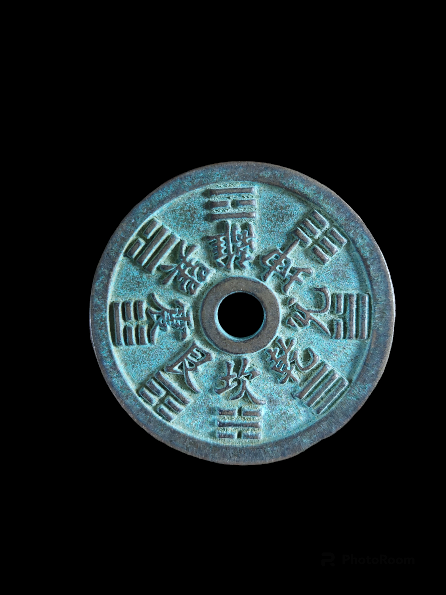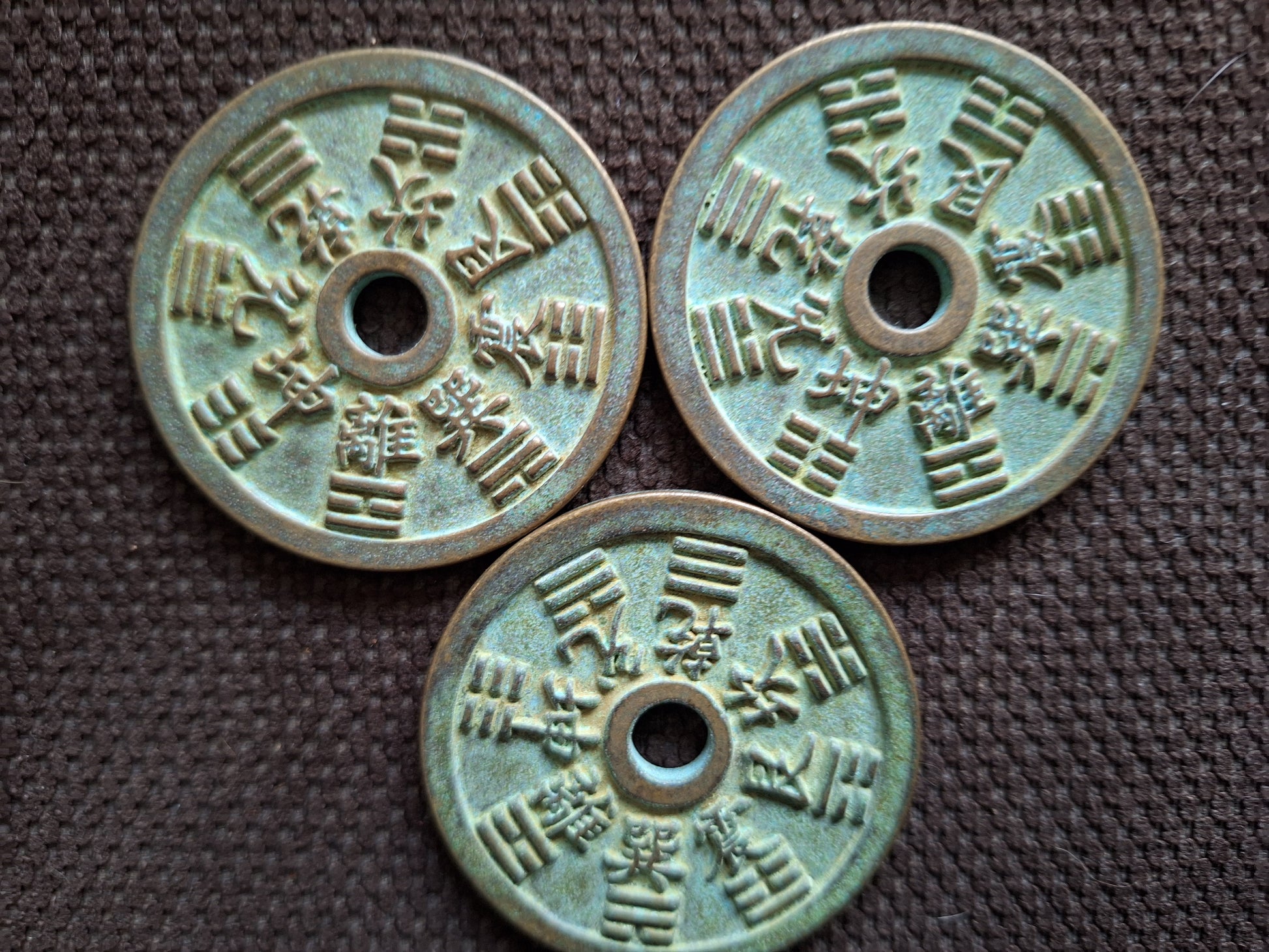 These numismatic charms are decorated on one side with the symbols and characters for the 8 Trigram symbols (' Ba Gua'), which form the core of the I Tjing. They represent different dynamics, energies, cardinal points, animals, seasons etc. Depicting the 8 of them together, forming a circle, symbolizes heavenly order, a healthy balance and right flow of energy.