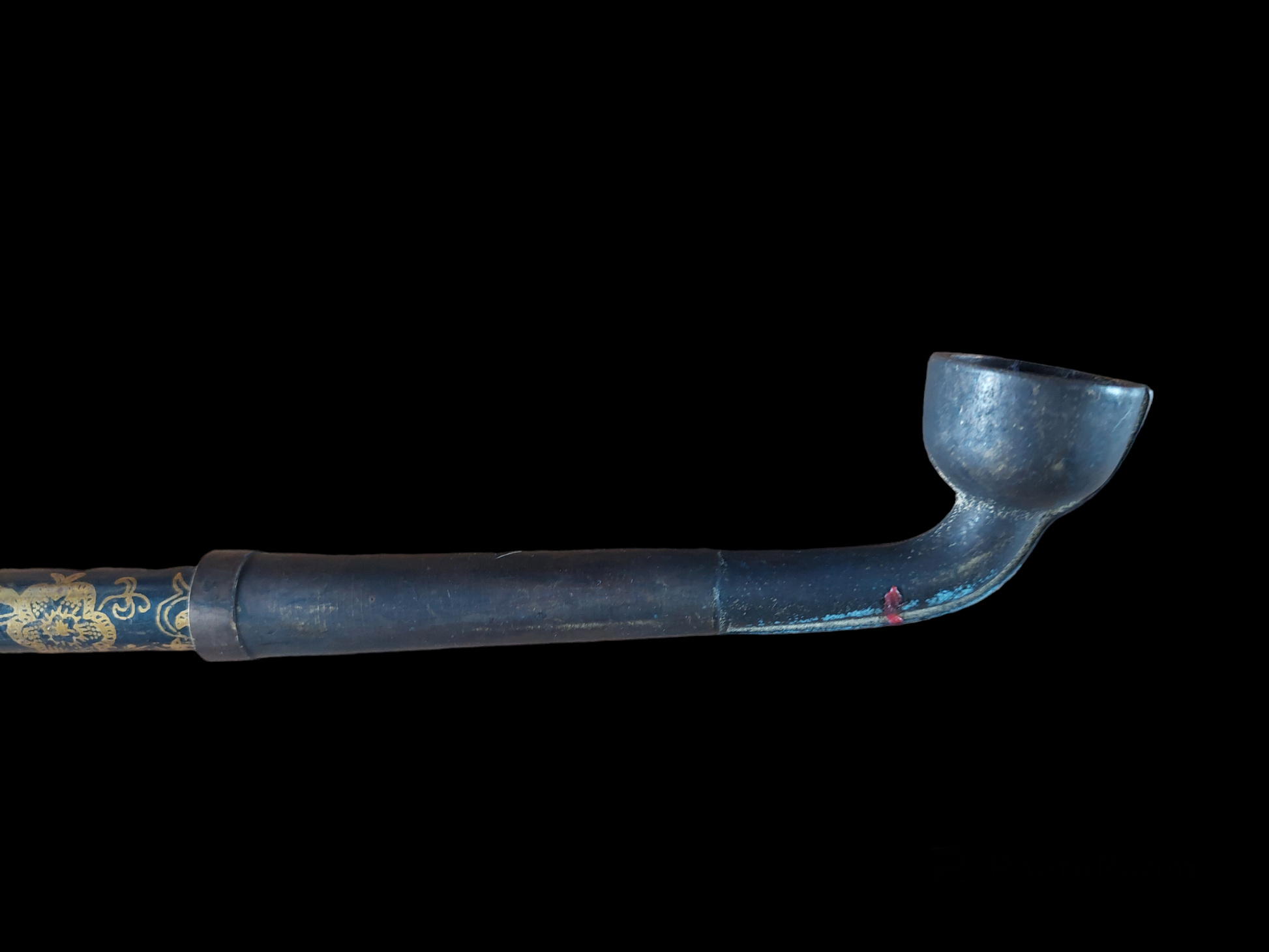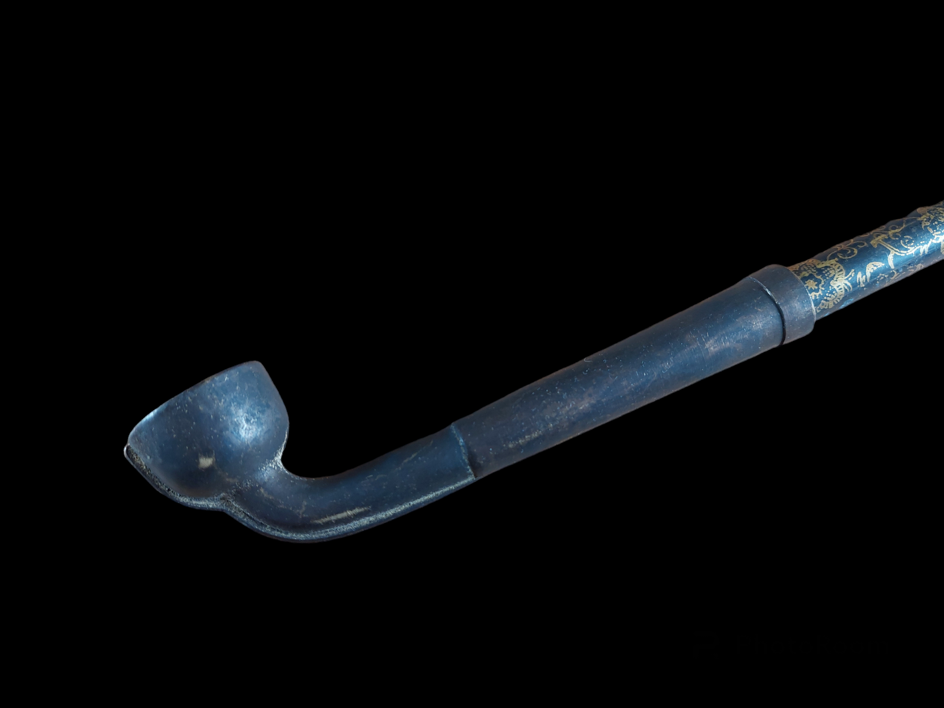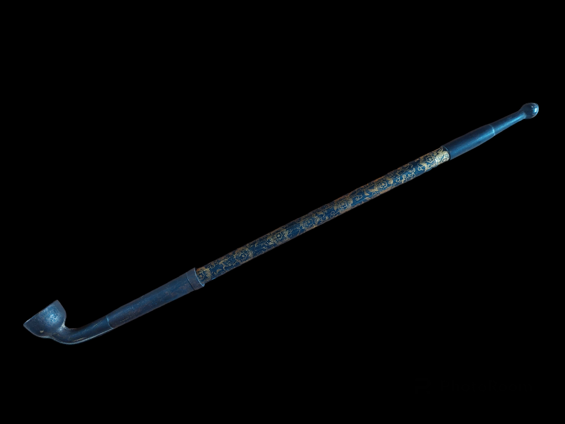 Stem etched with gold colored decorations, mouthpiece and pipe bowl made from bronze.