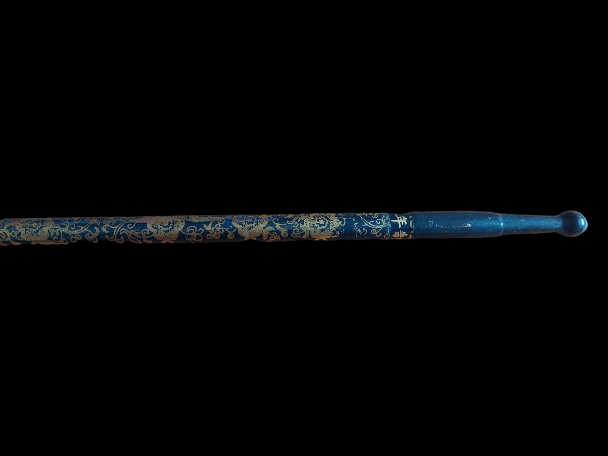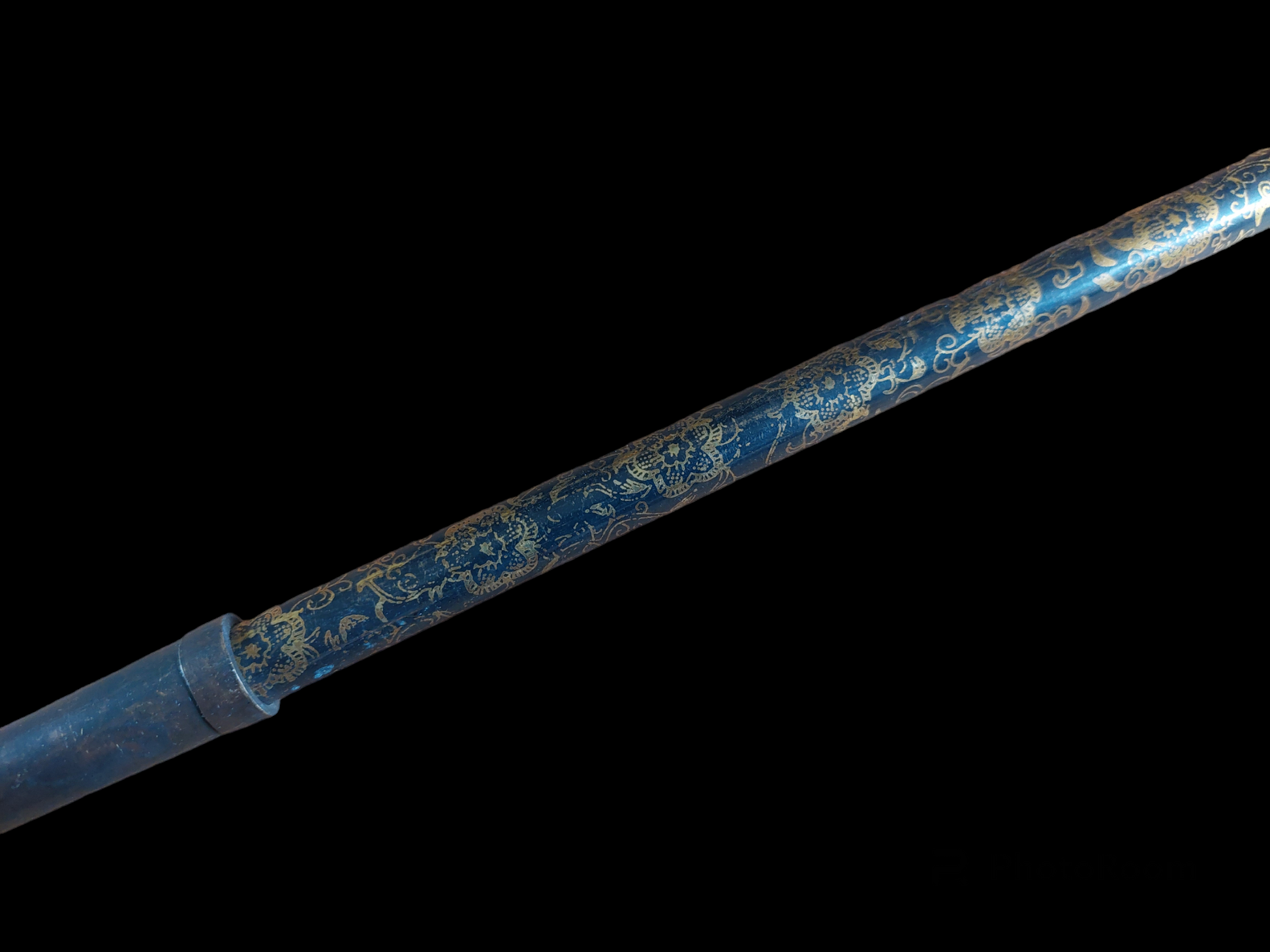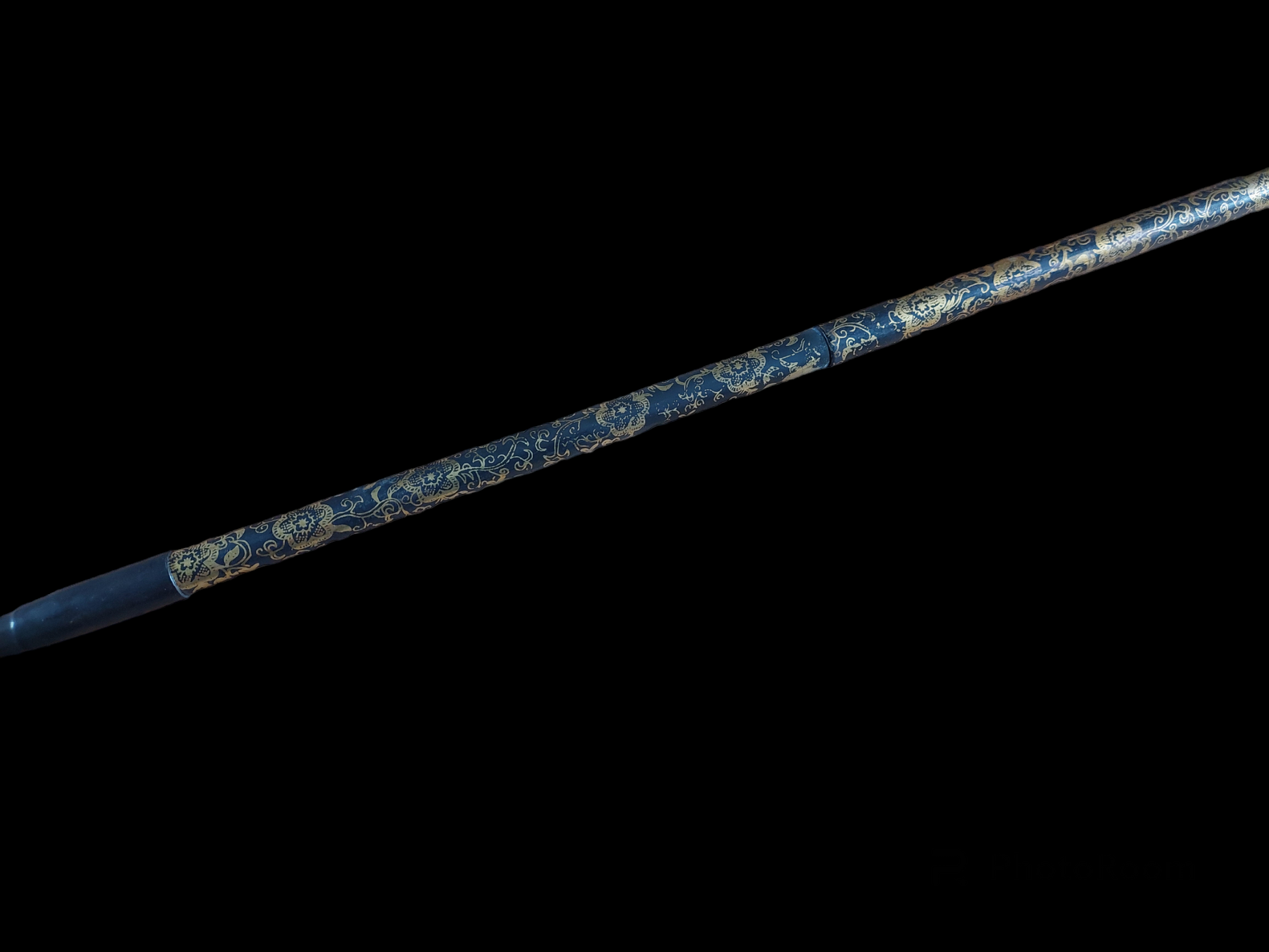 Stem etched with gold colored decorations, mouthpiece and pipe bowl made from bronze.
