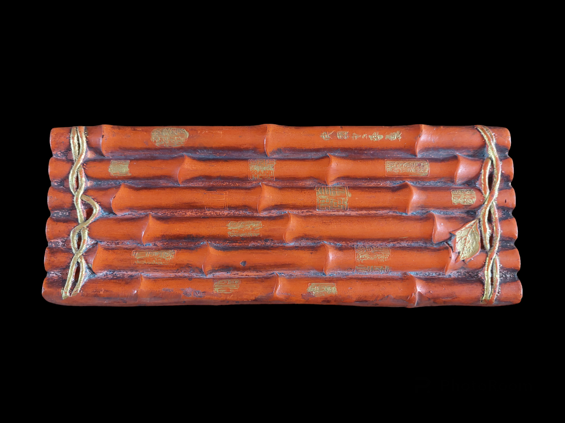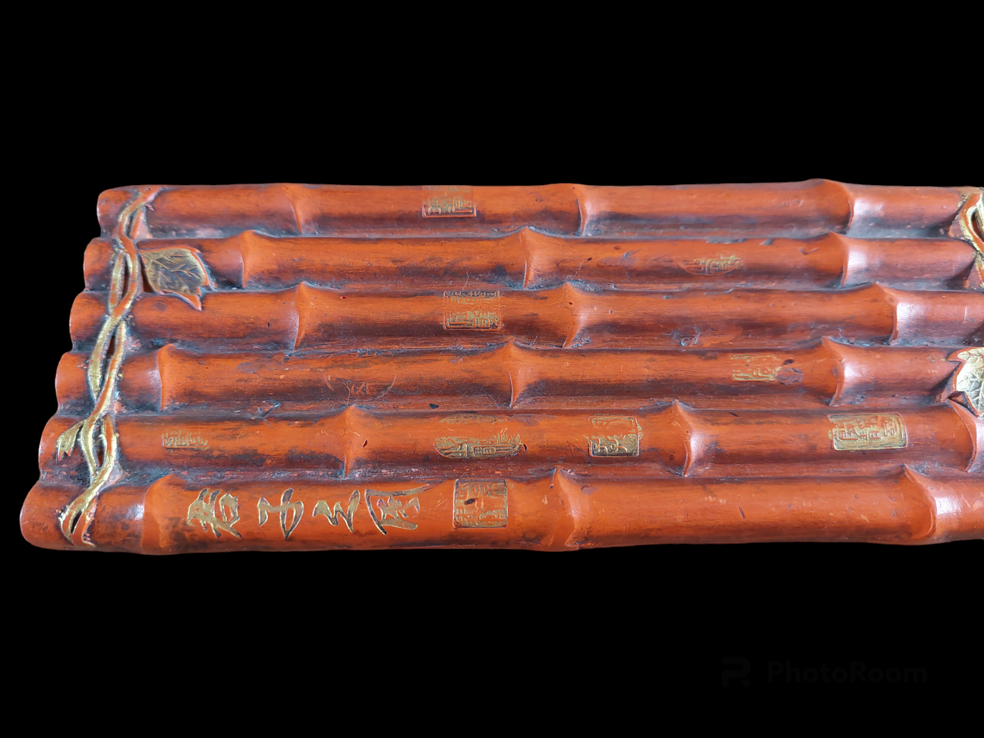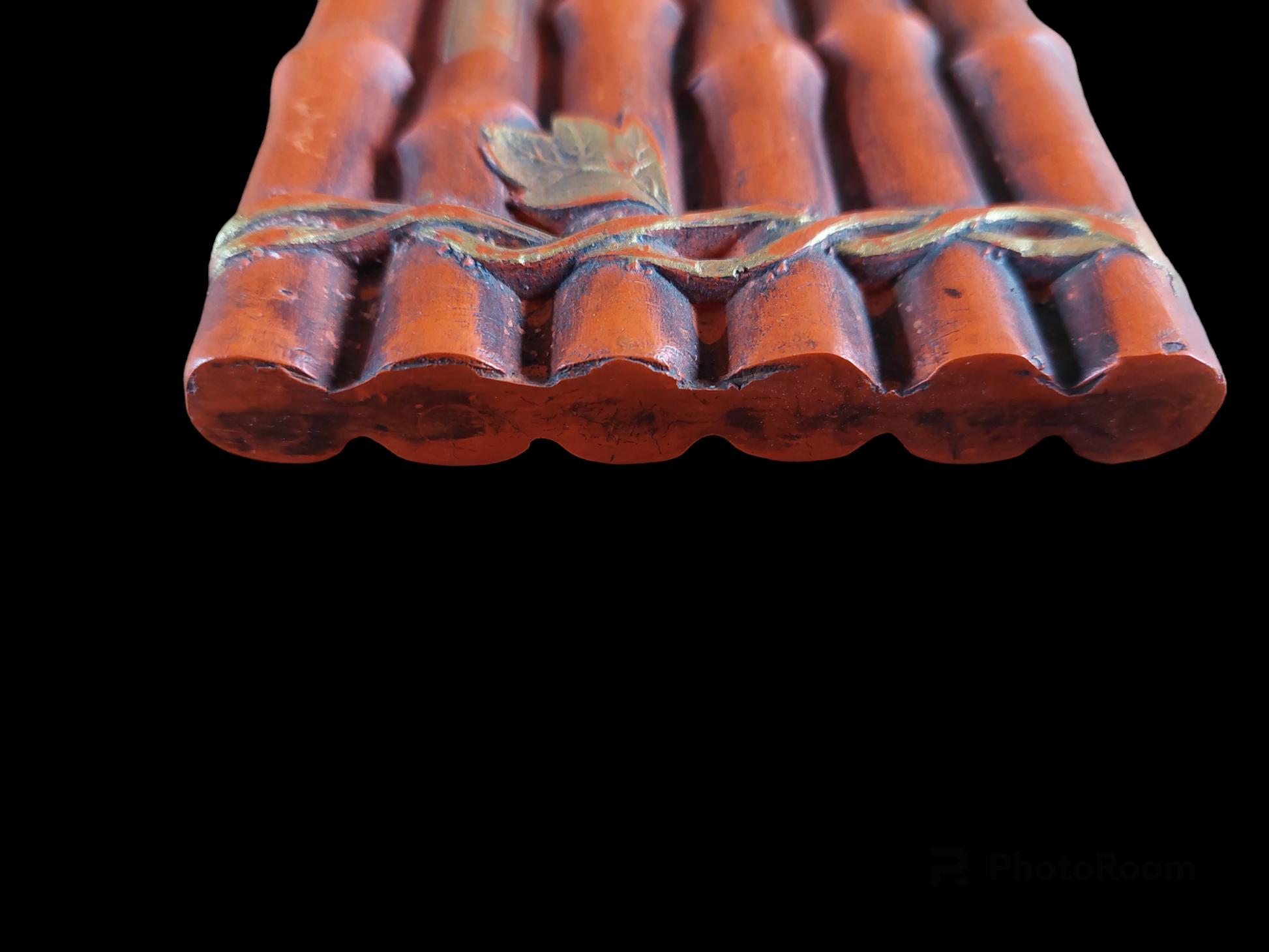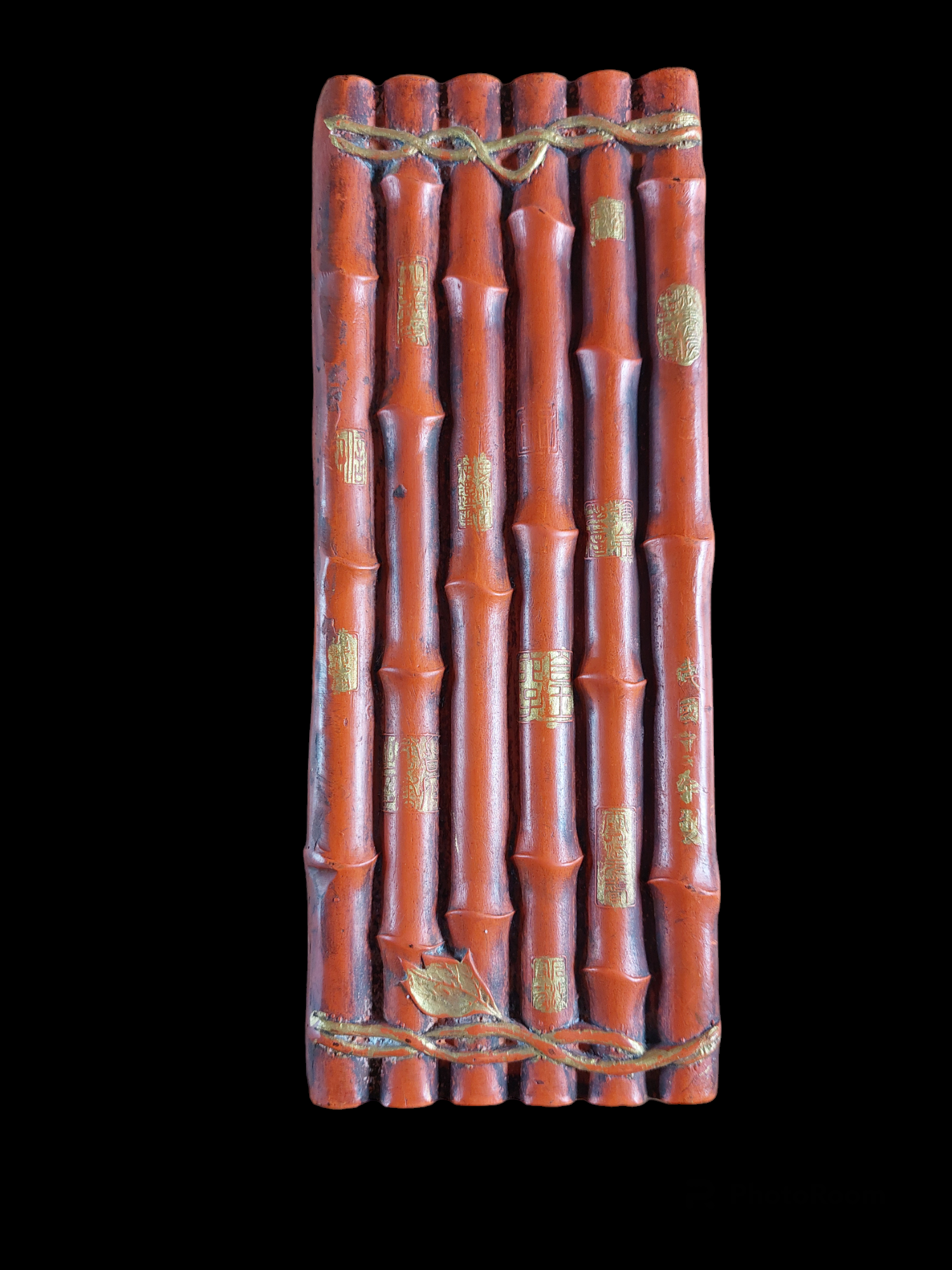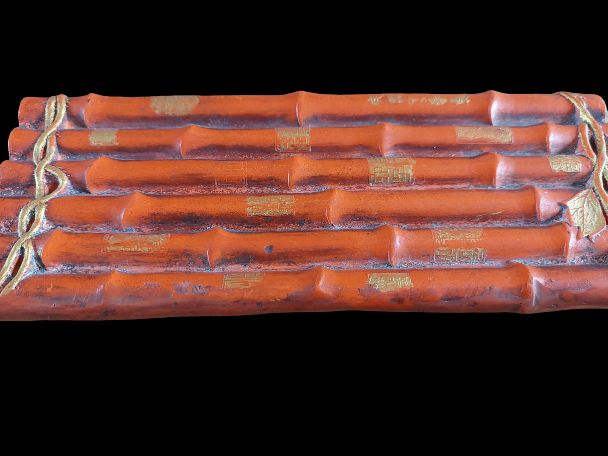 Nice Chinese planchet, made from some kind of heavy metal, made into the shape of bamboo sprouts. Painted in a dark orange color with goldpainted Chinese symbolism.
