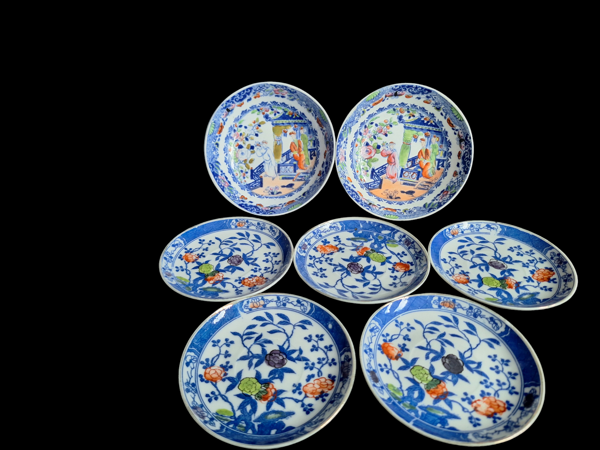 Mixed set of vintage Chinese porcelain, consisting of 4 cups and 5 saucers from the same design and 2 small plates in another design.