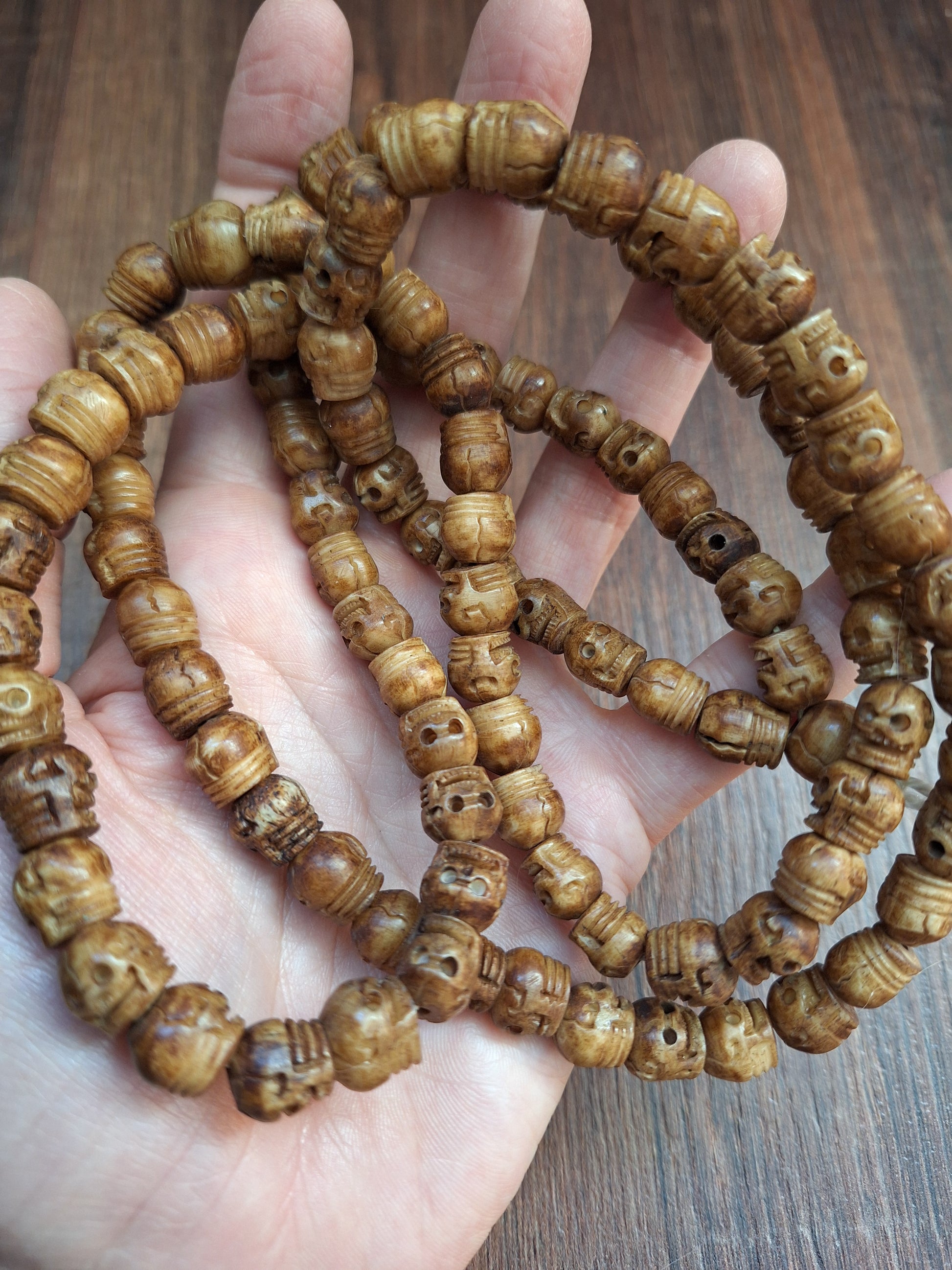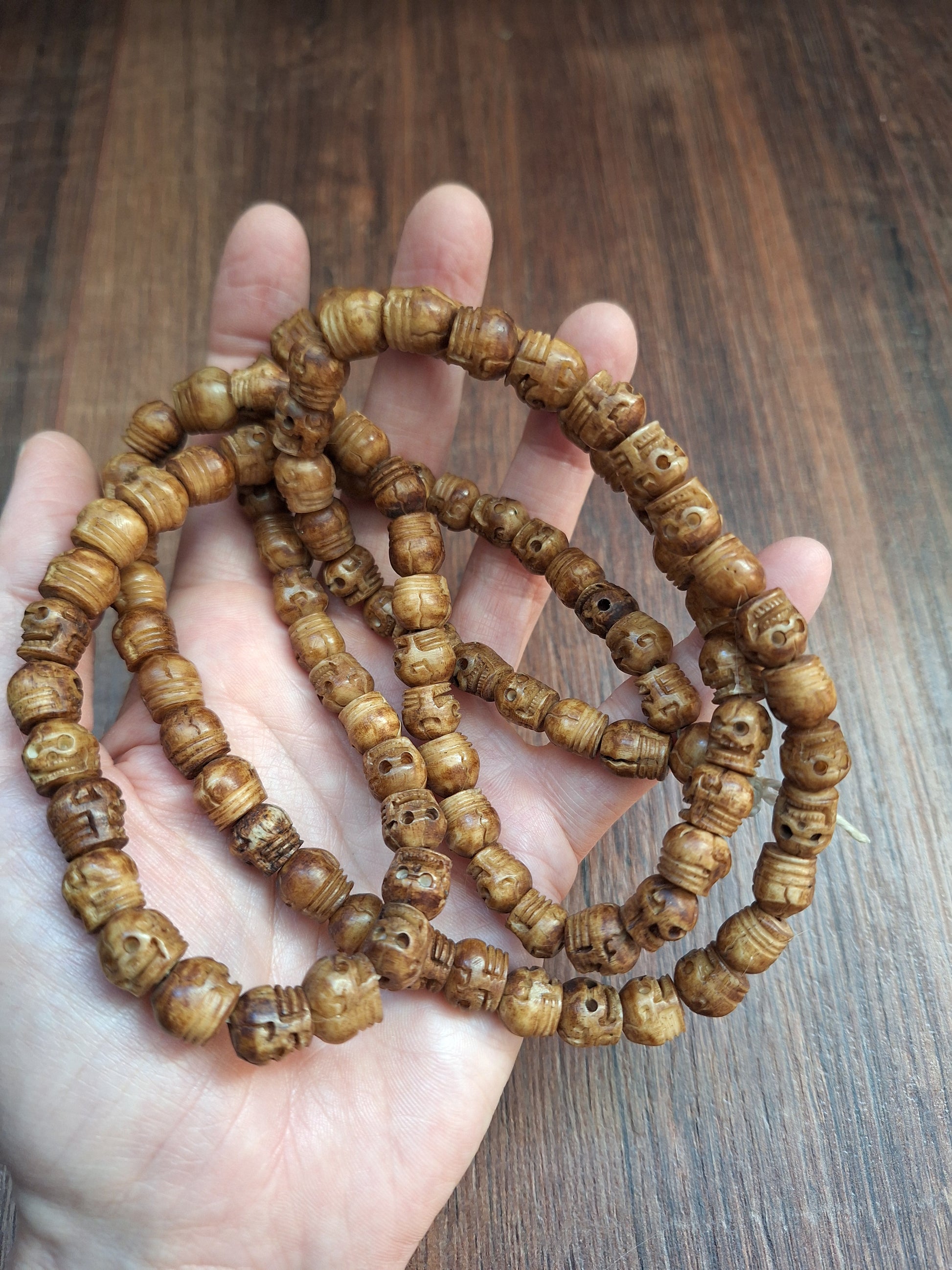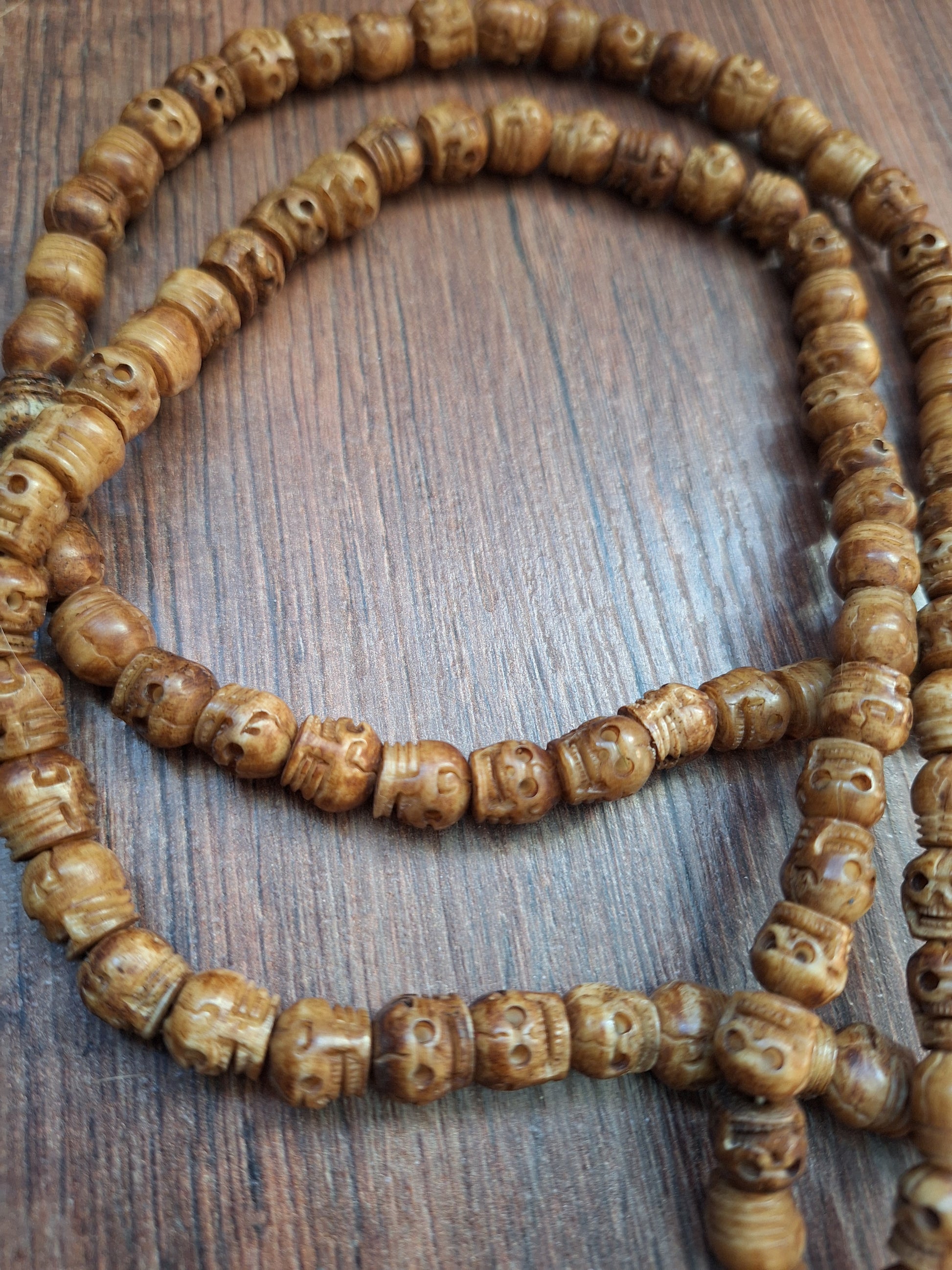 Each bead is approximately 8-10 millimeters high, with the guru bead slightly bigger. Since these are all handcarved beads, each one is slightly different and unique in appearance. Total length of the mala is approximately 106 centimeters.
