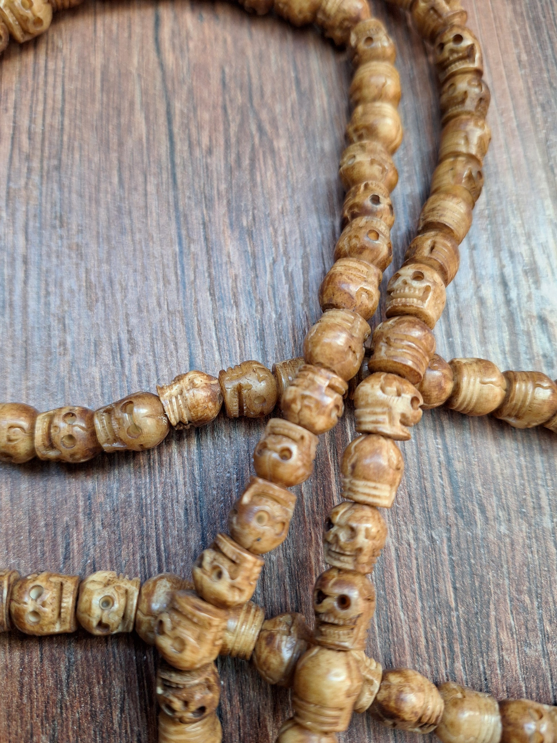 Very beautiful vintage Nepalese mala, made with 108 beads (+ 1 guru bead) from yak bone, handcarved into human skulls.