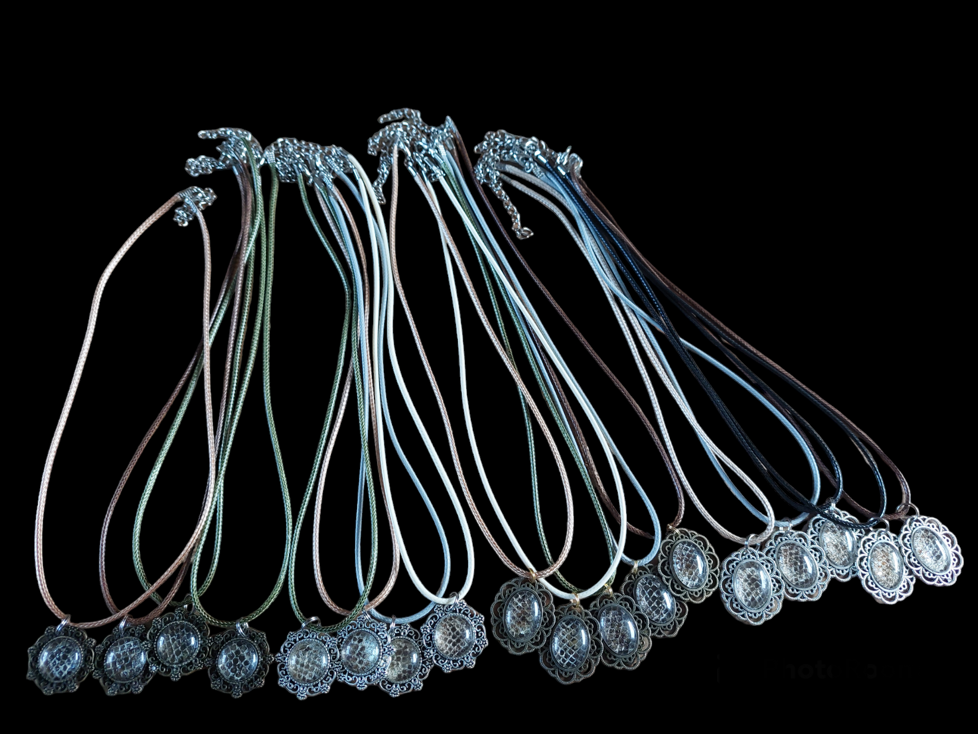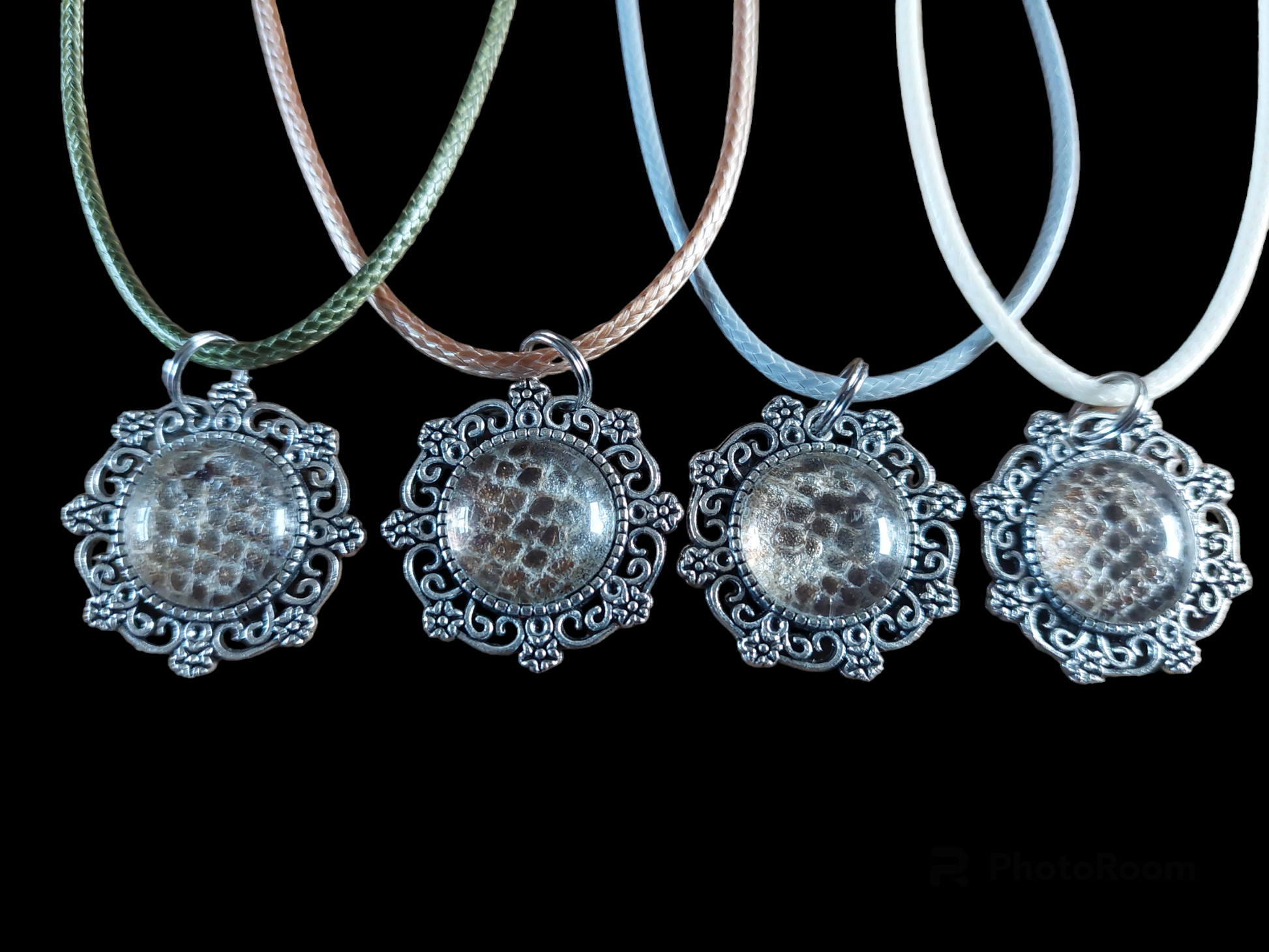 The snake skin has been put in glass cabochon jewelry pendants.The cabochons are hung on simple wax cord necklaces, closing with a lobster-style jewelry clasp.