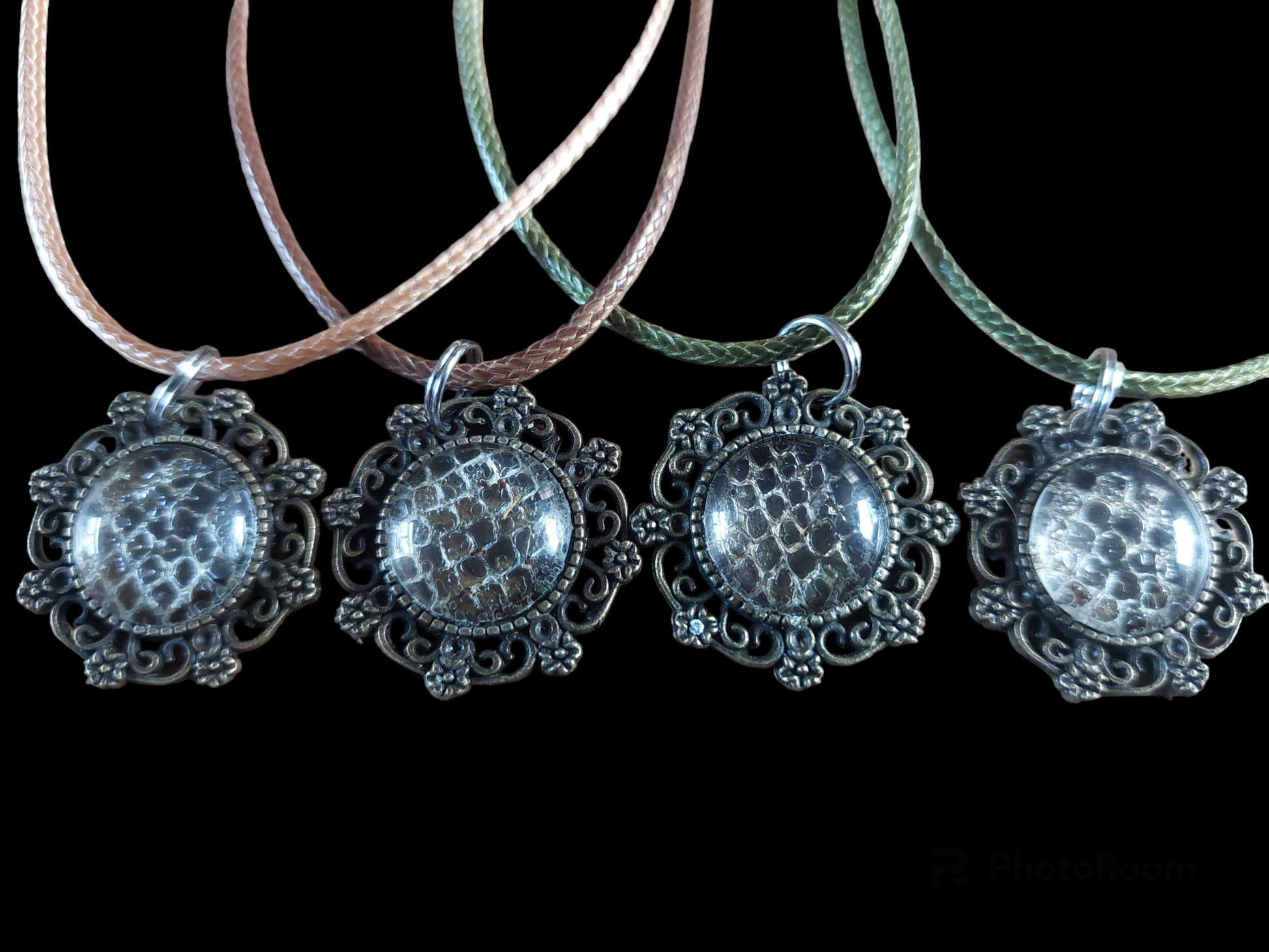 Amulet necklaces made with crawl skin from a constrictor snake, held as a pet animal in the household from one of our acquaintances.