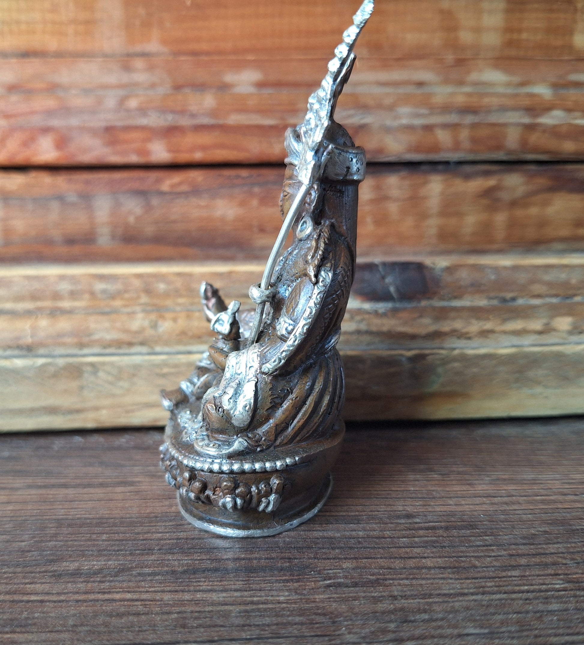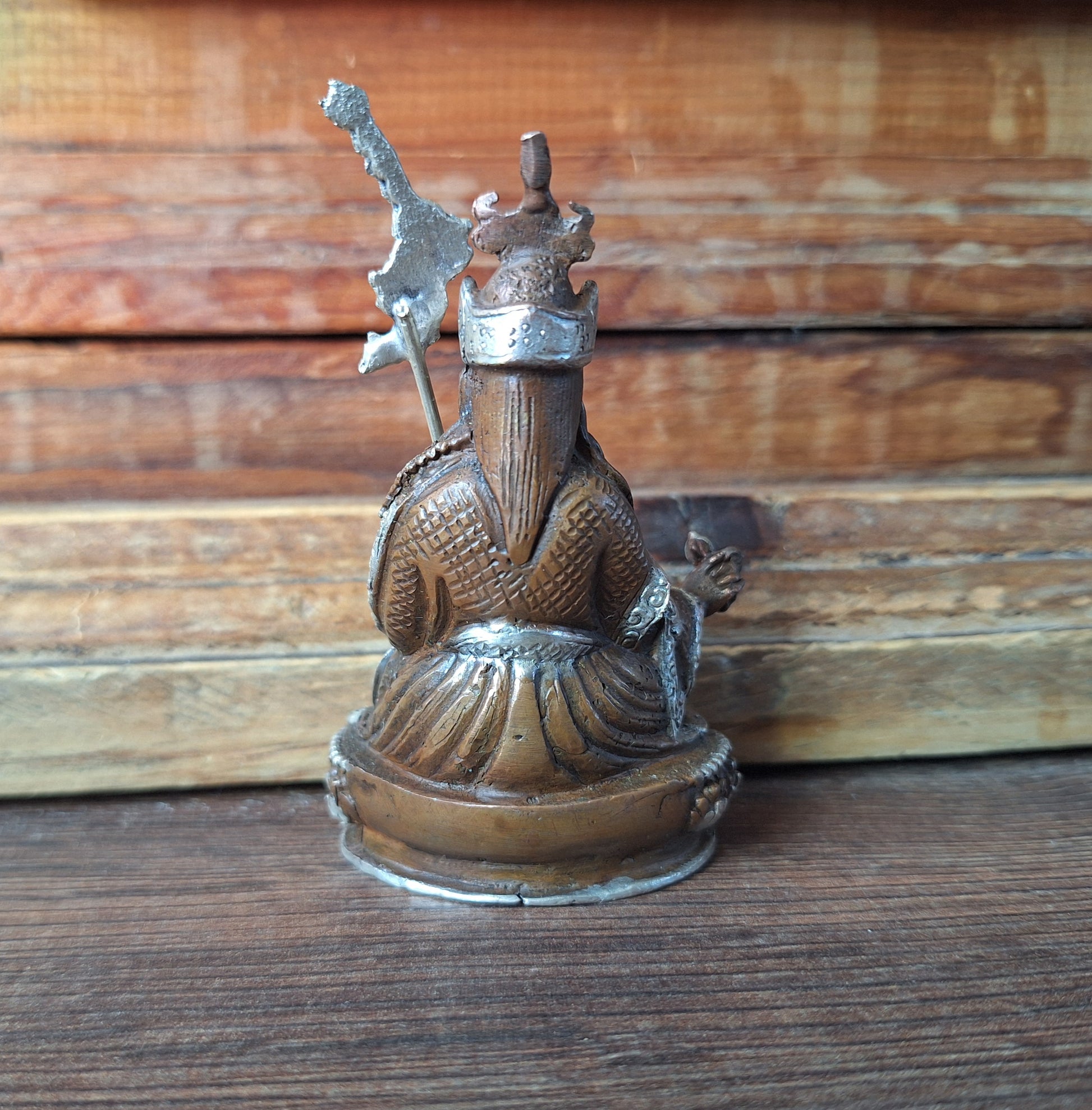 This figurine is made of red copper and painted with brown and silver colors. In his left hand Padmasambhava holds his iconic staff with symbols of a double dorje, skulls and a trident top. This staff is made of alpaca metal. The figurine is recently made and the decoration is, as can be seen on the pictures, not of really high quality. But of course it can still be a good item for your personal altar.