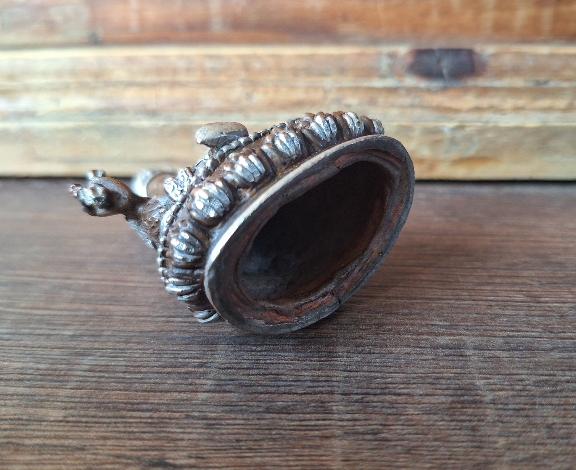 This figurine is a hollow one. Buddhist statues such as this one are often filled up with a mix of special sacred ingredients, such as chippings of precious stones and metals, herbs and grains, pieces of fabric or paper with symbols or mantra's on it and sometimes even relics from sacred places. These fillings are an offering to the spirit of the statue and adding them enlivens and blesses it for its purpose. After filling them, a thin metal plate is glued on to seal the bottom.