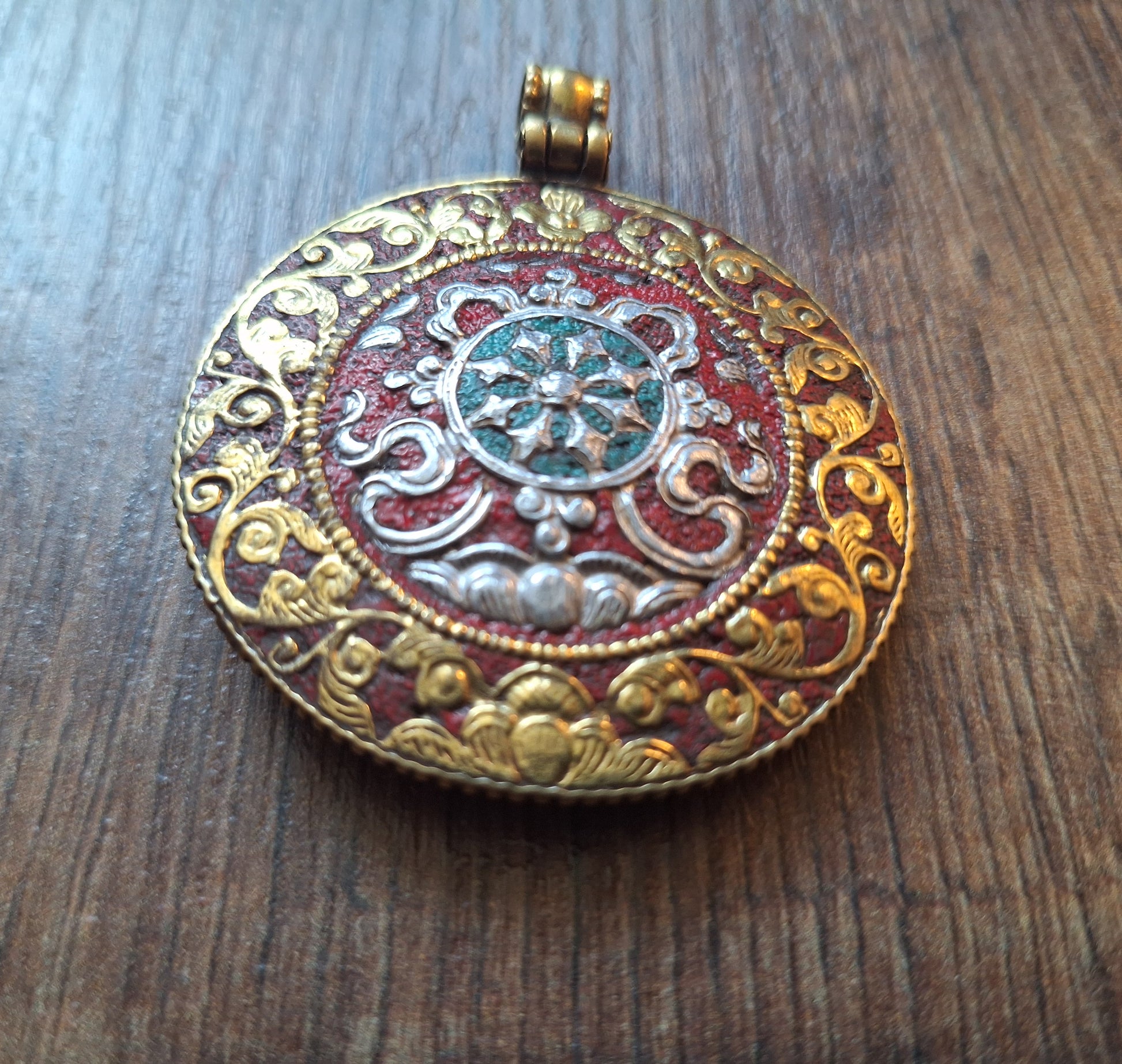 Beautifully decorated Nepalese melong with Buddhist symbolism on both sides. This melong is made of two thin, slighly convex plates of red copper, connected together at the edges, thus leaving a hollow space between them (which makes for a lightweight melong). The red copper is goldpainted all over and further decorated with red and green cloisonne accents on the frontside.
