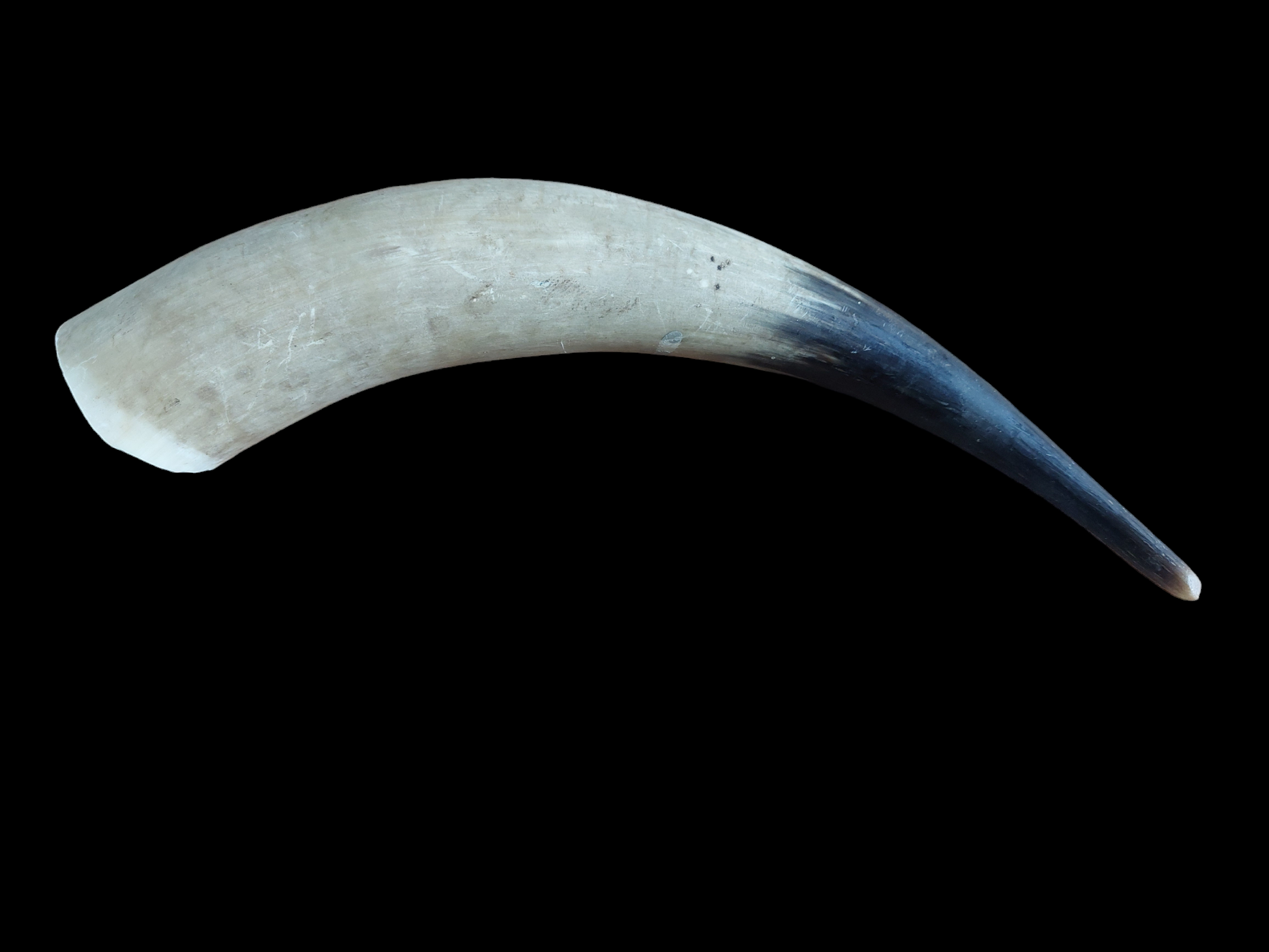 Nice horn from a cow, in white-beige colors with a black tip. Good heavy, stabile quality.
