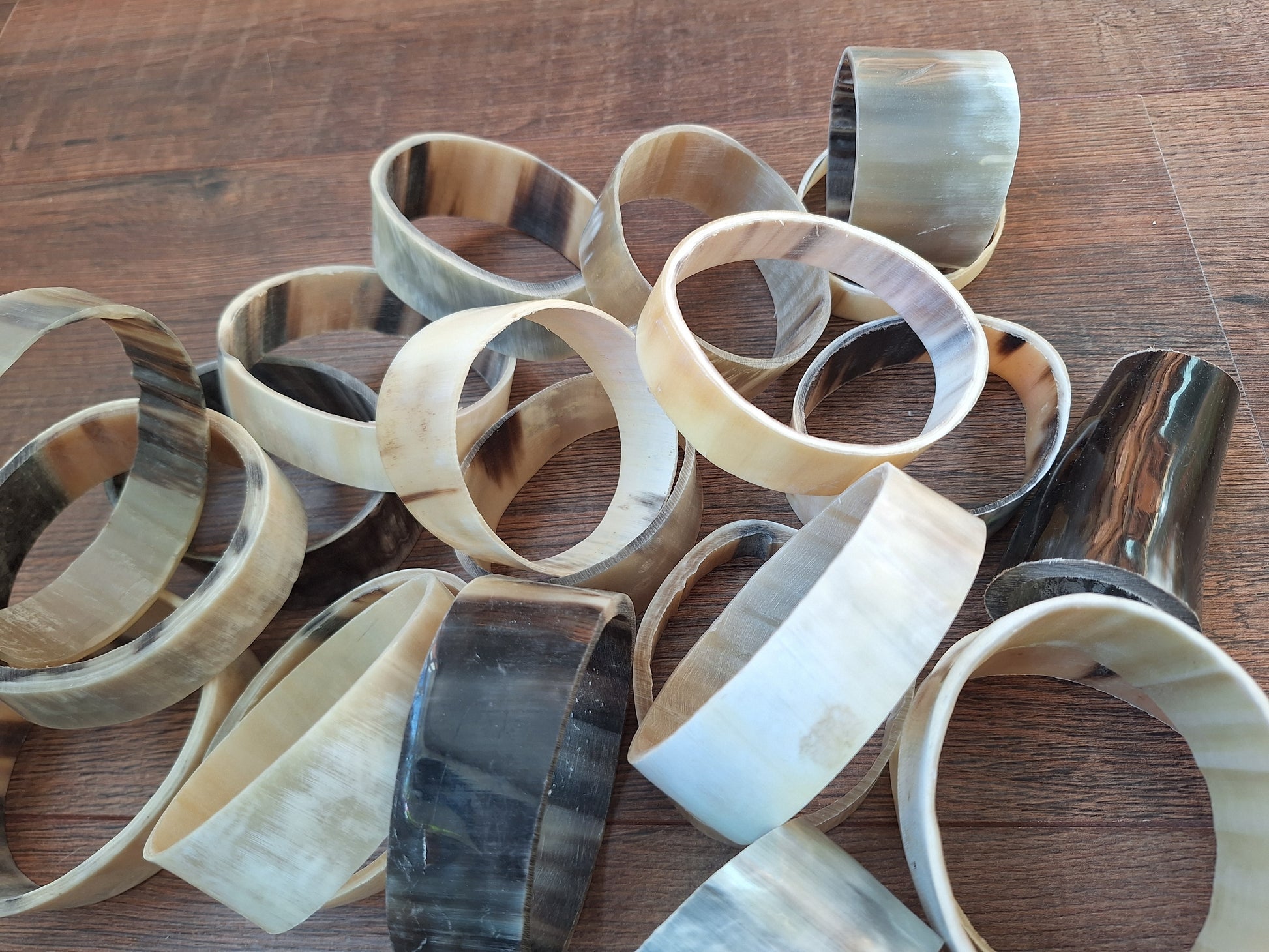 Set of slices/rings cut from polished cow horns. Different widths and diameters. Nice items for all kinds of personal crafting purposes.