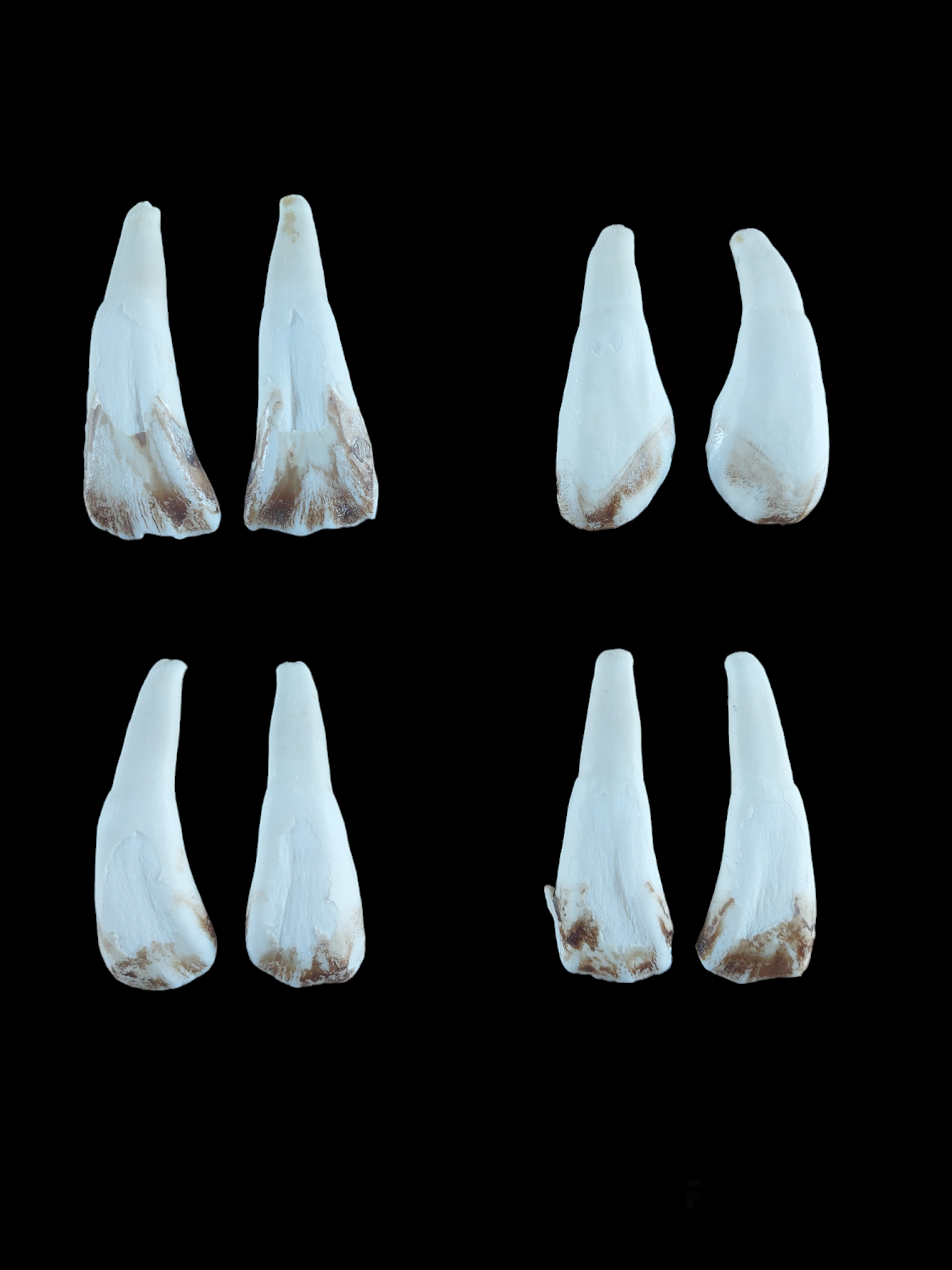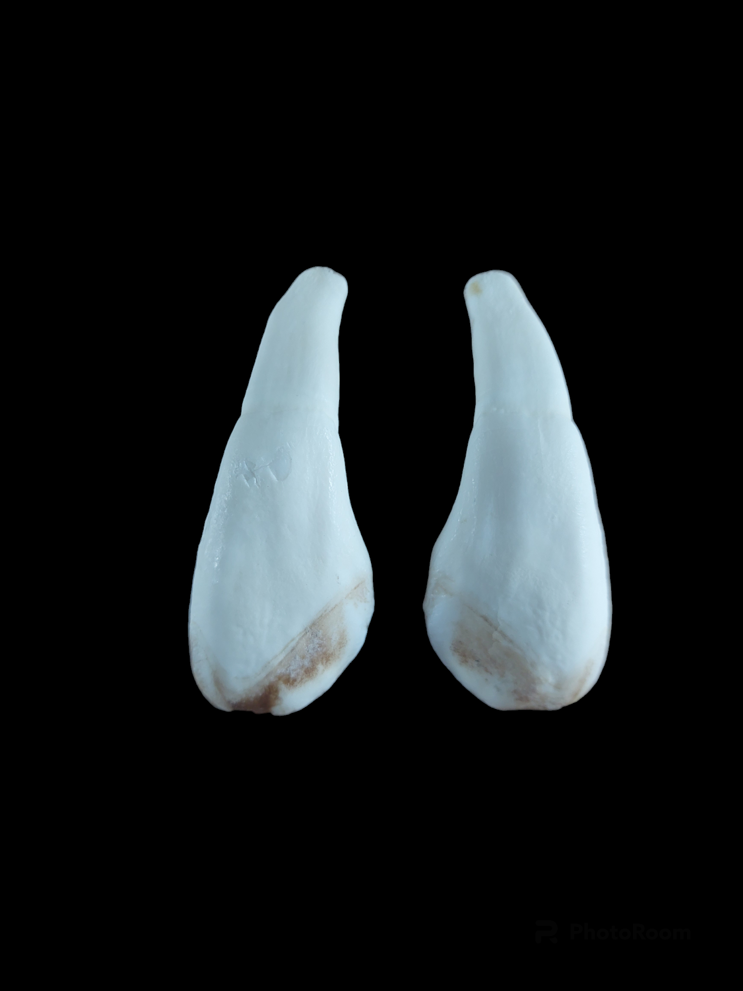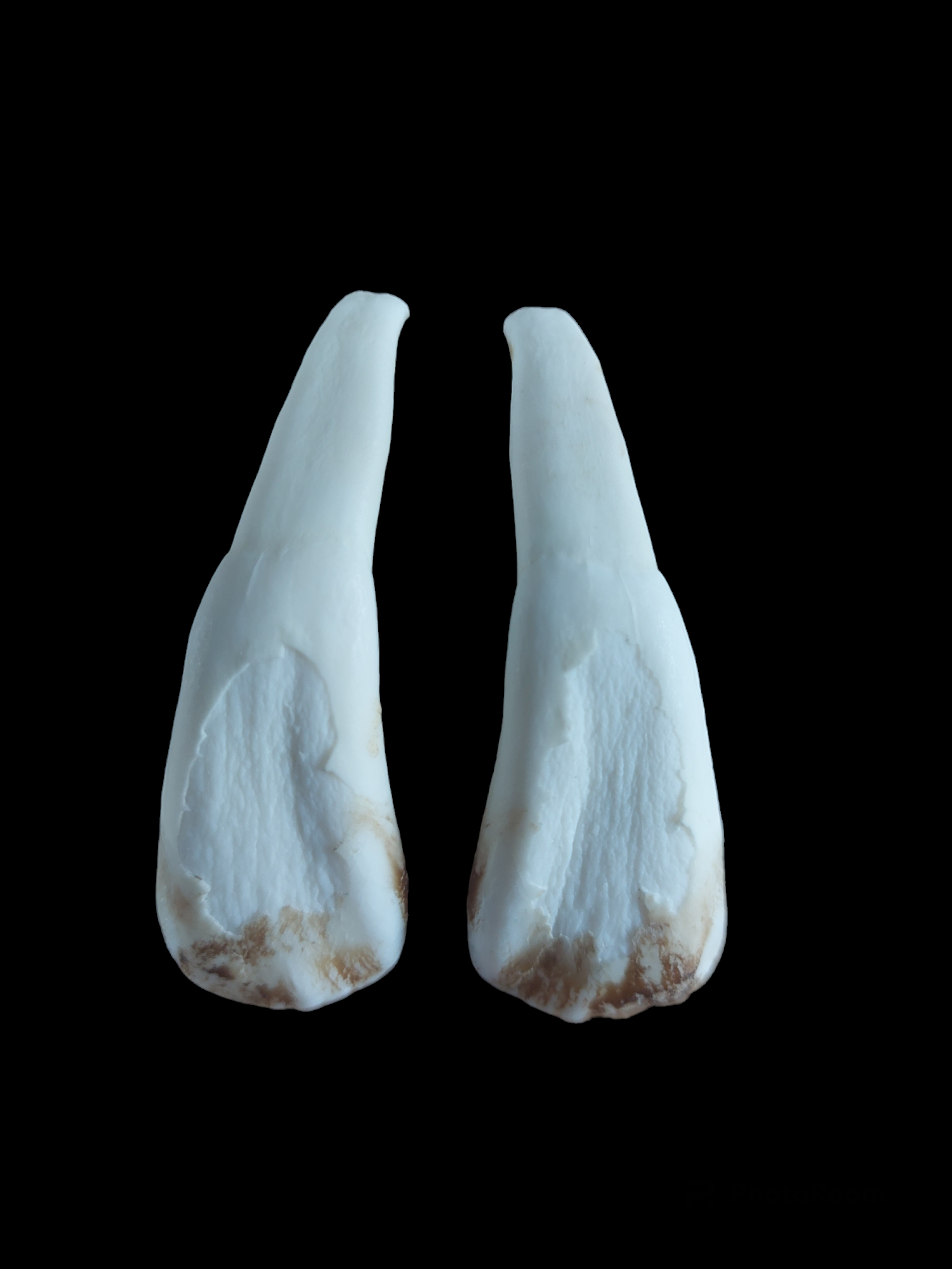 Nice sets of matching incisor teeth from dutch cows, thoroughly cleaned and slightly bleached. A little hole has already been drilled, so these teeth are ready to use in all your own (amulet) crafting purposes.