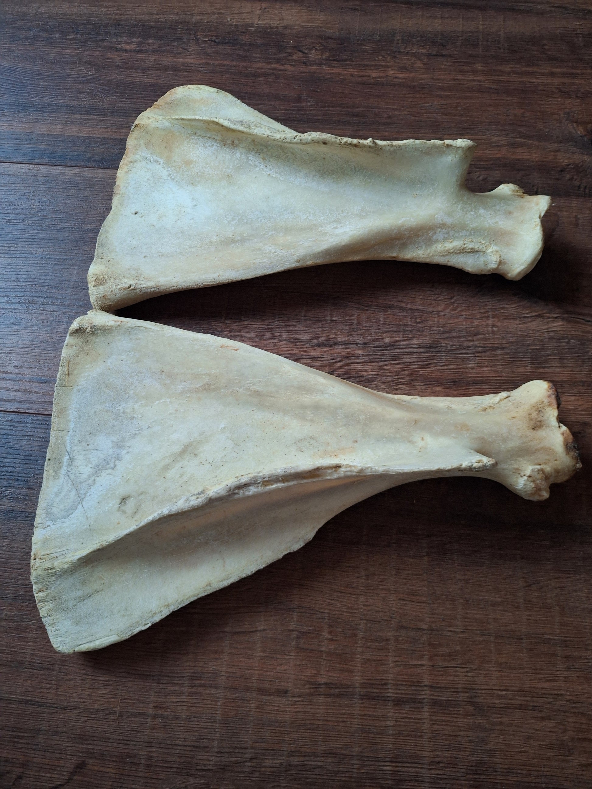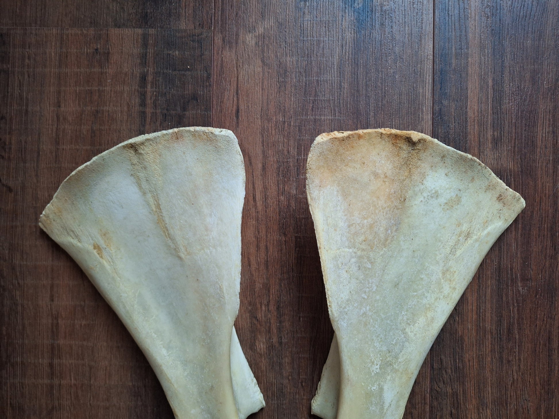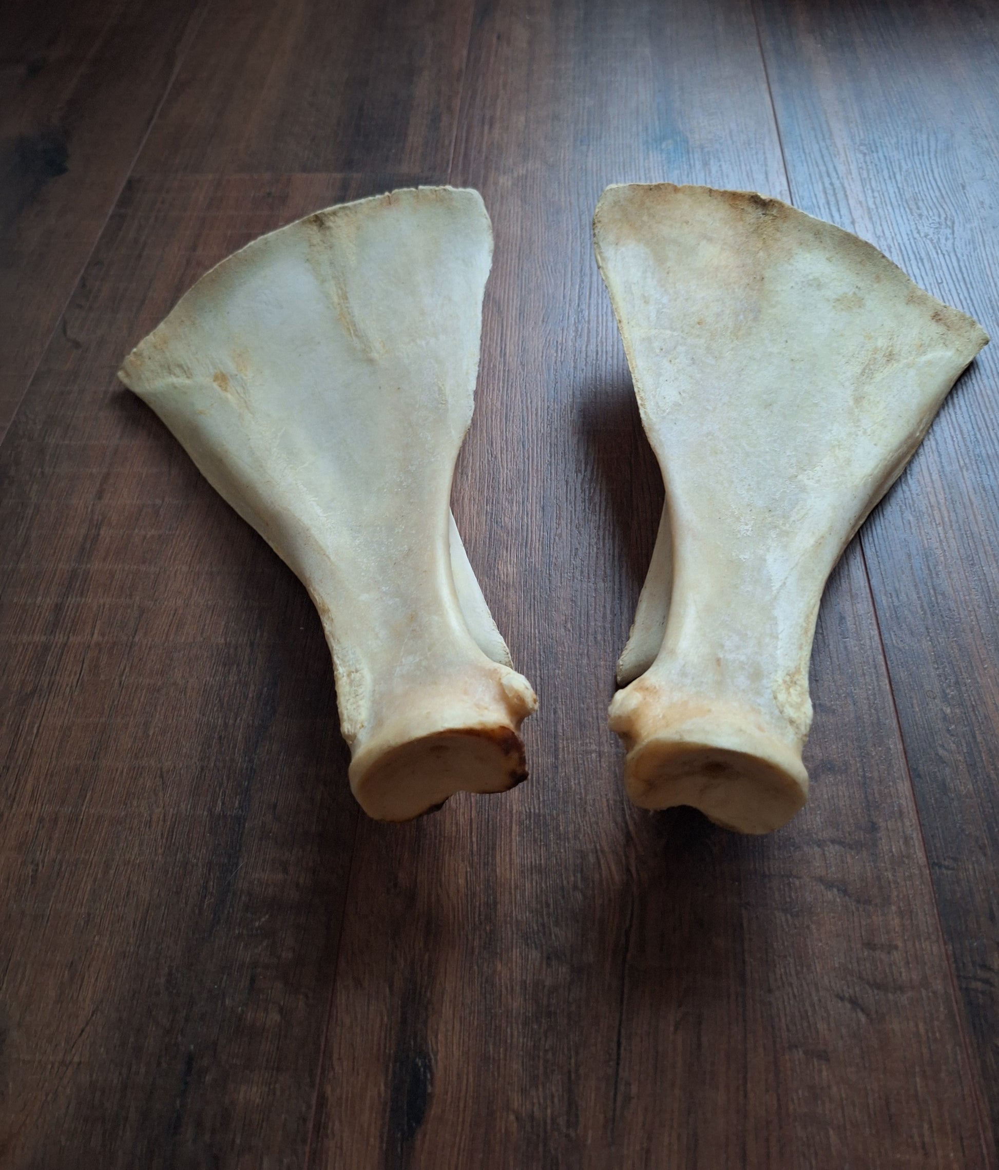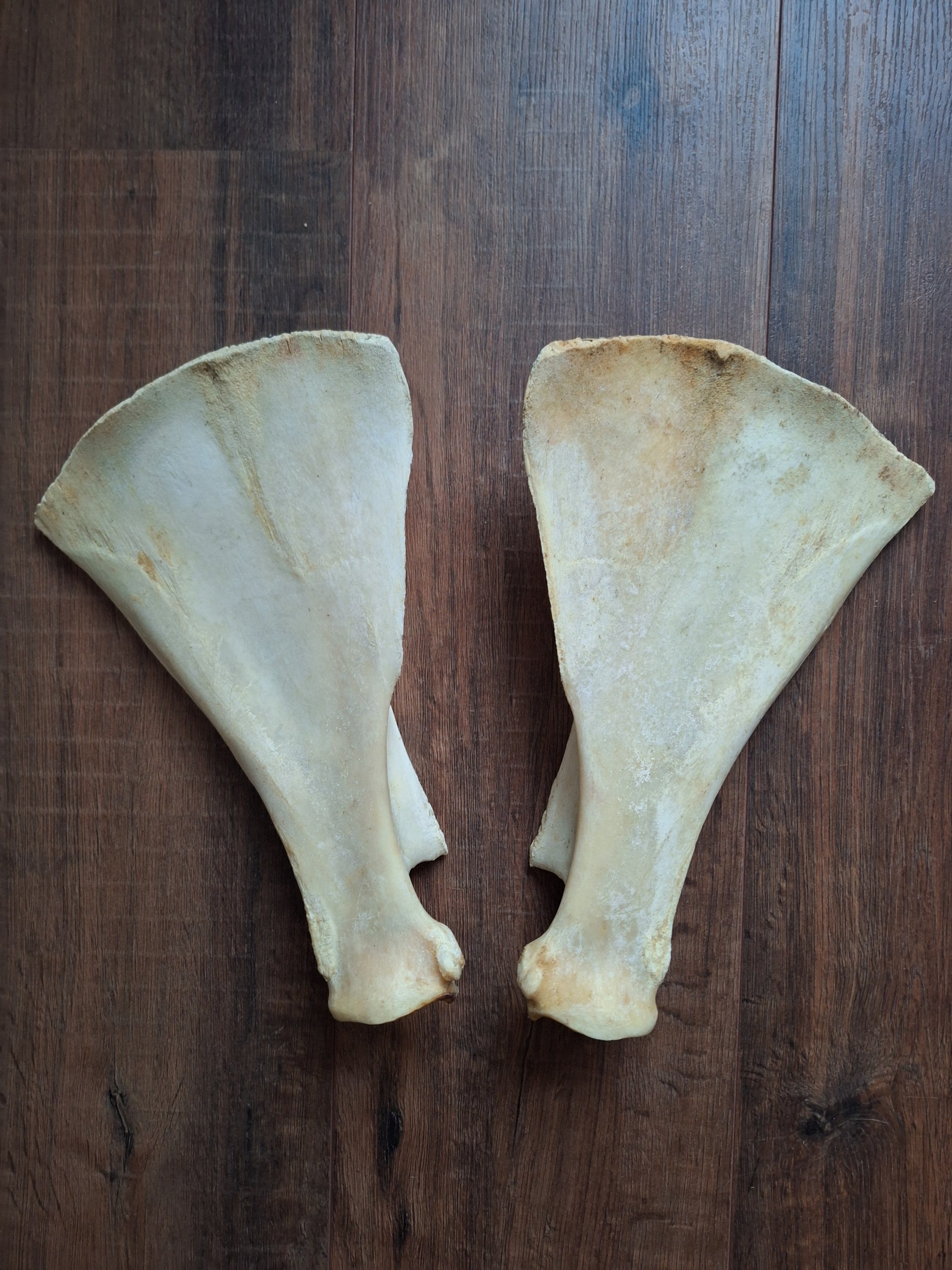 These scapula's here on the picture come from a dutch cow. They are in good condition and of course (coming from such a big animal) they are heavy and big (size of each scapula is approximately 36 centimeters long and 25 centimeters wide).