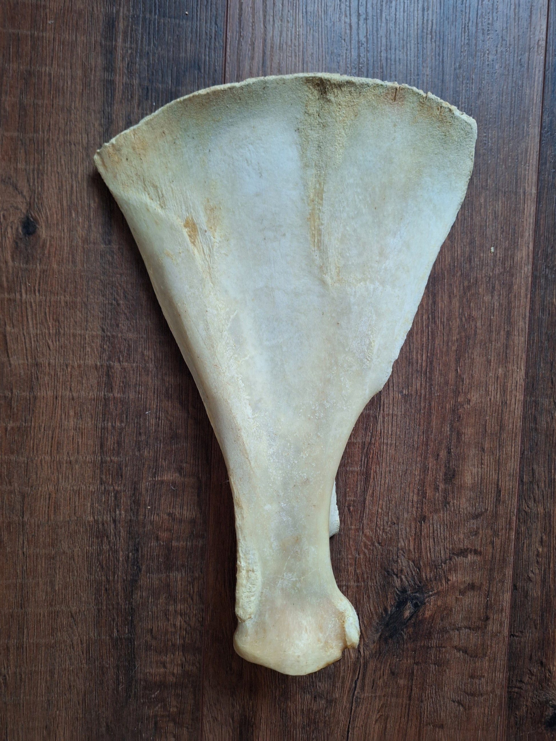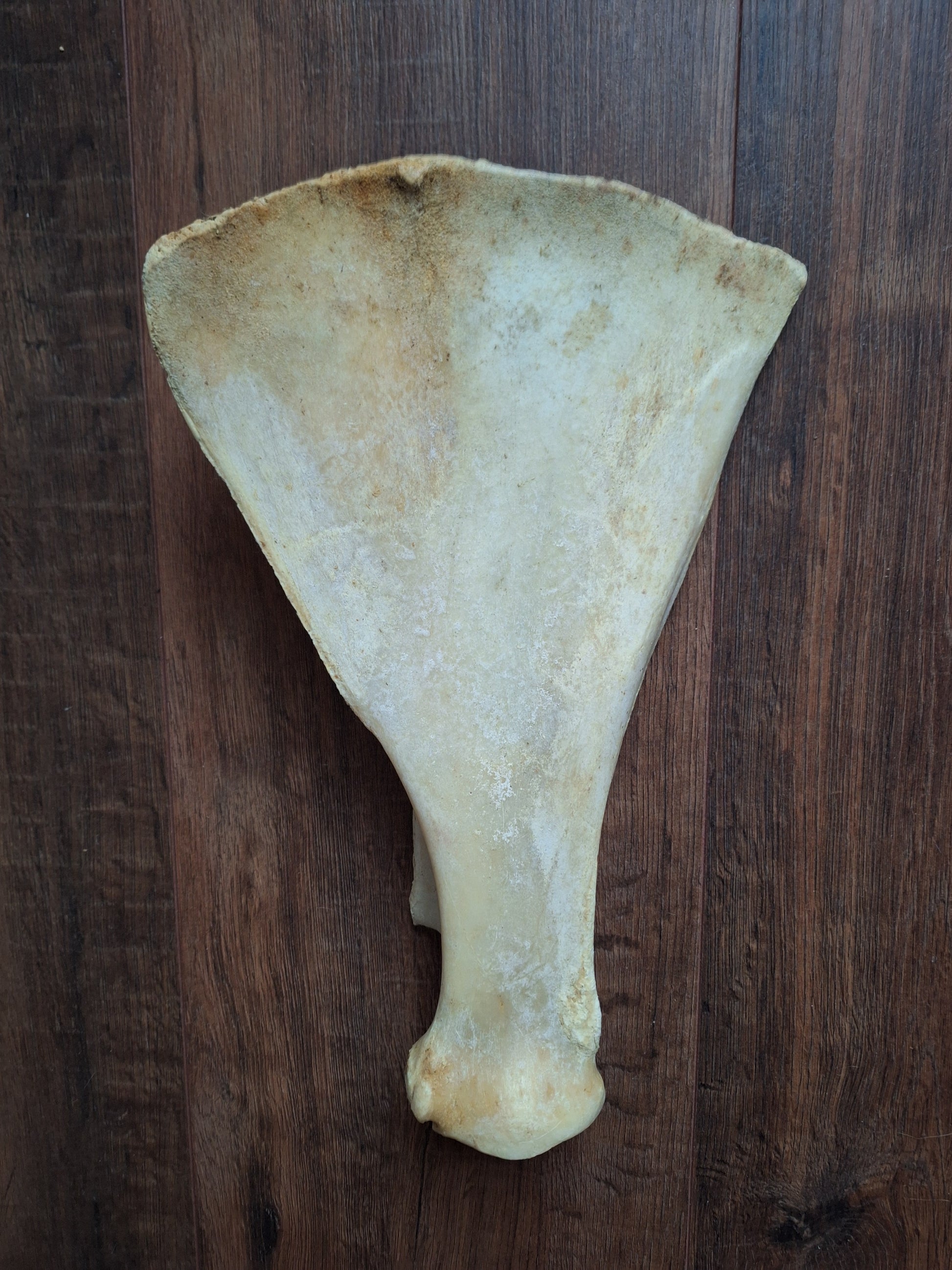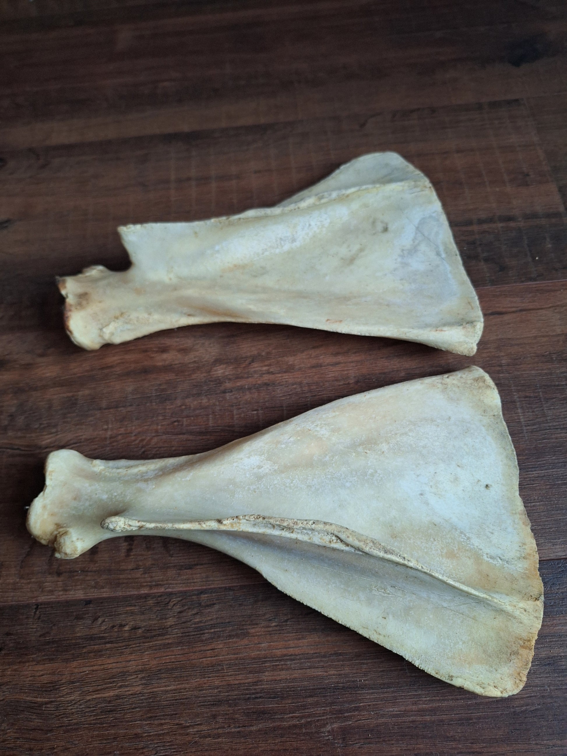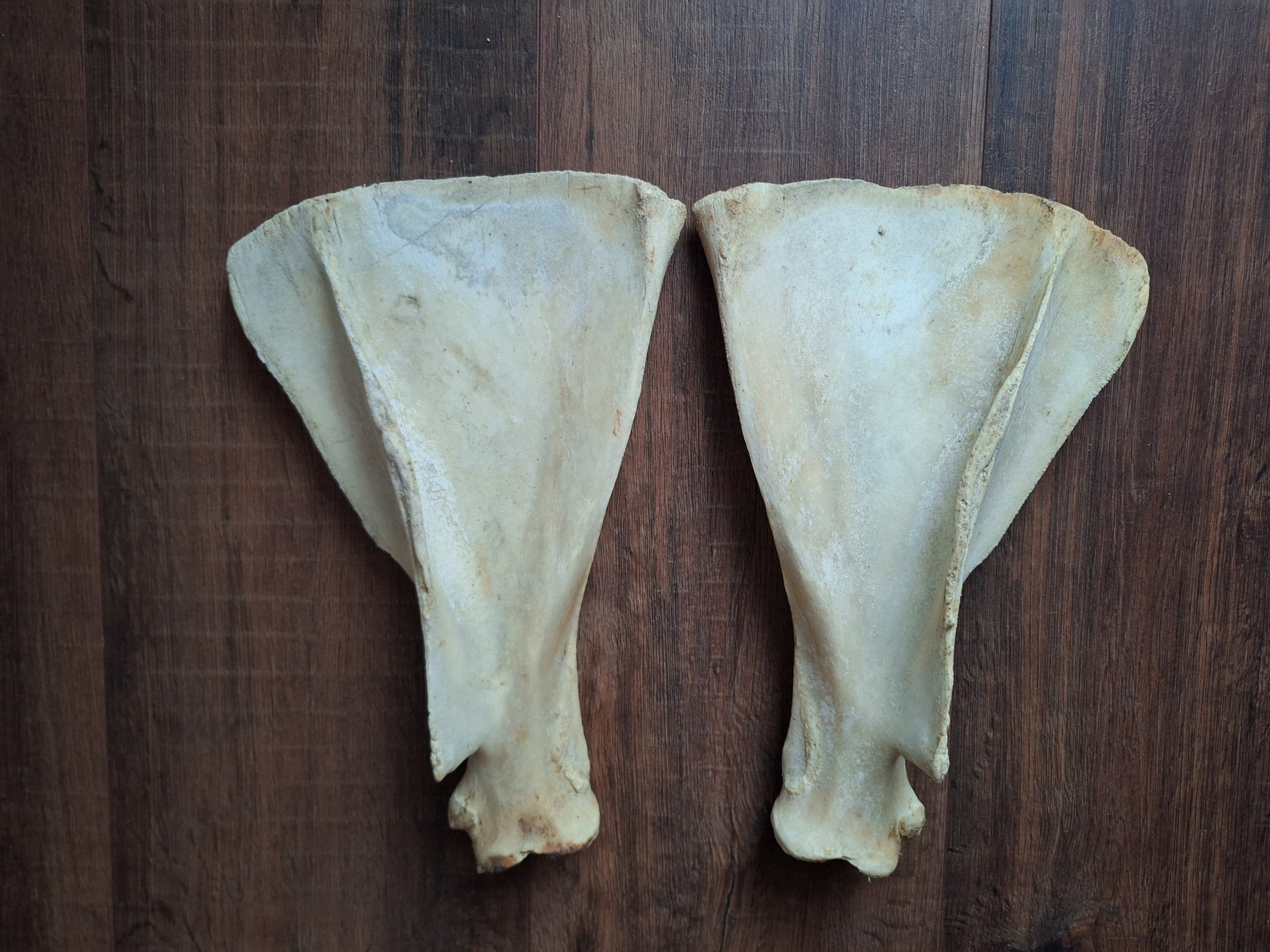 These scapula's here on the picture come from a dutch cow. They are in good condition and of course (coming from such a big animal) they are heavy and big (size of each scapula is approximately 36 centimeters long and 25 centimeters wide).