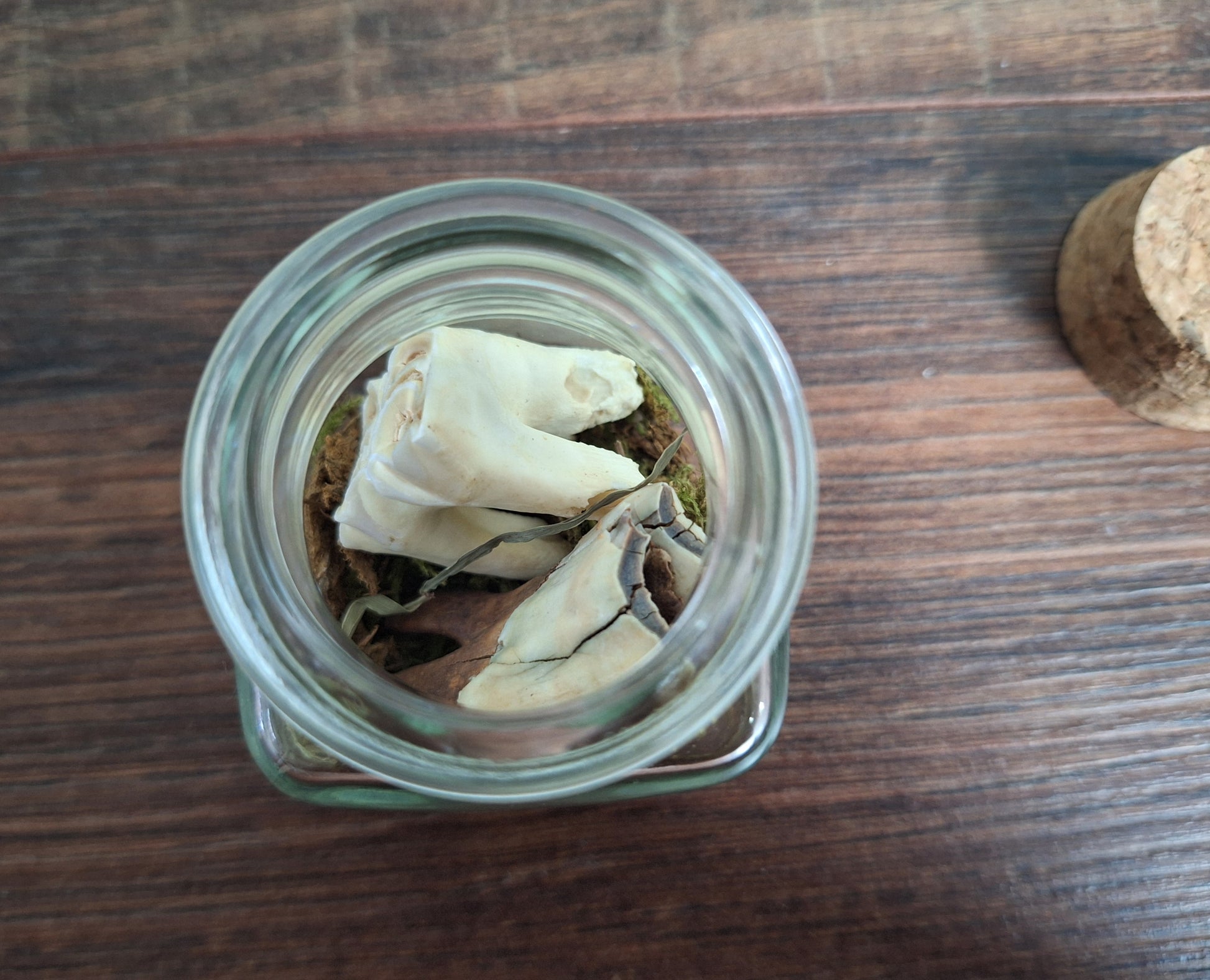Set of two large teeth from a cow in a nice little glass jar with some decorative moss.
